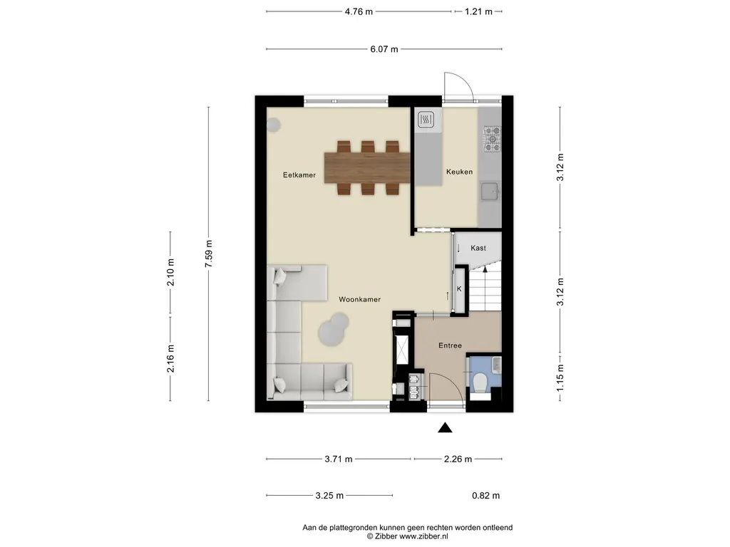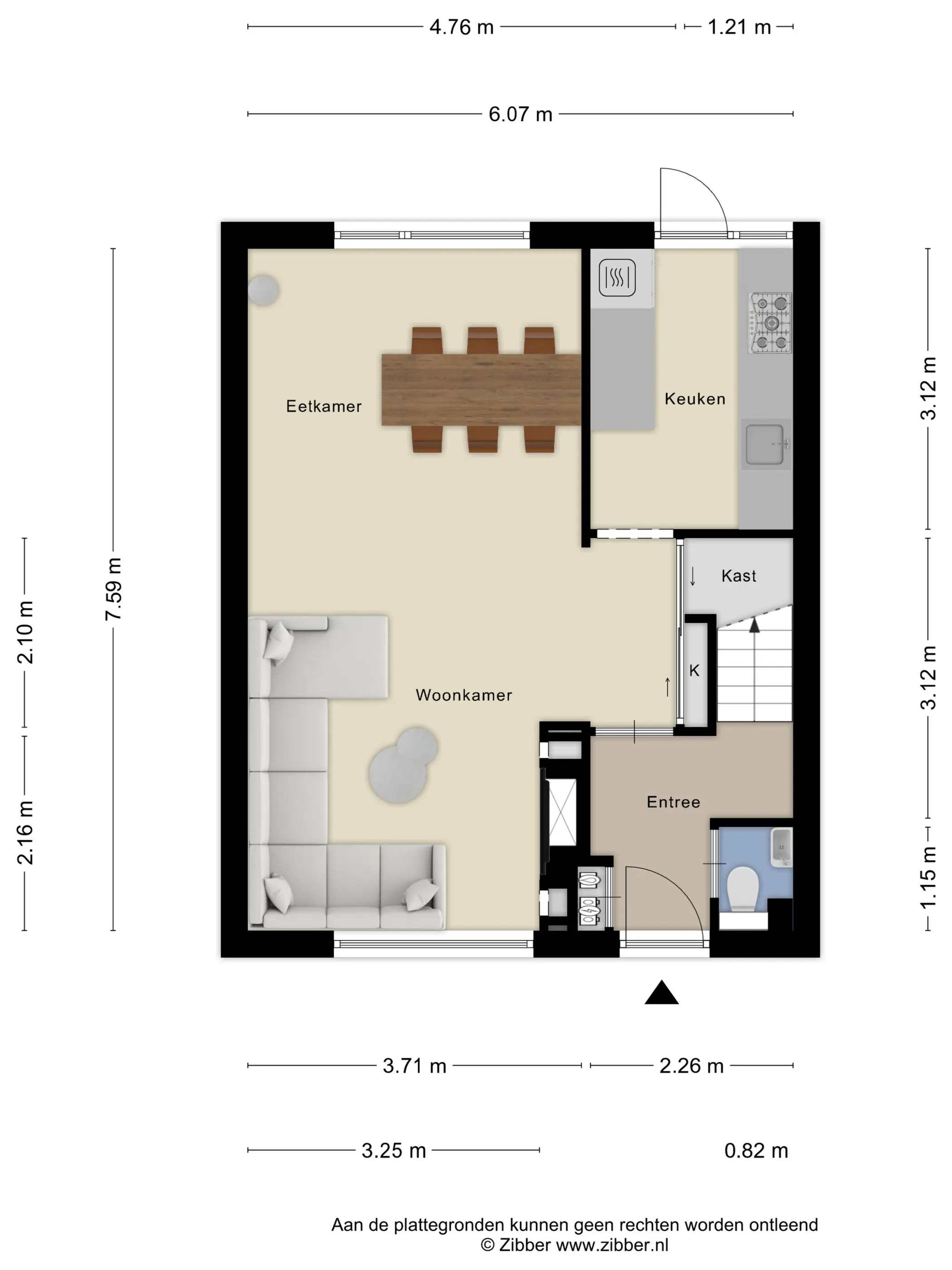 Via de onderhoudsvriendelijke voortuin stap je binnen in de hal met meterkast en (hang)toilet, de trap naar boven en de deur naar de woonkamer.