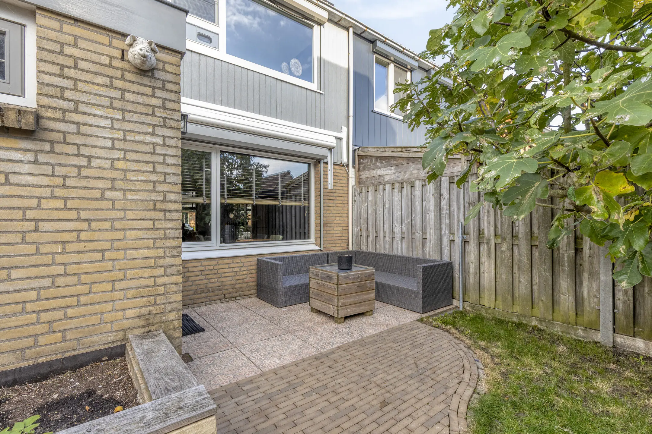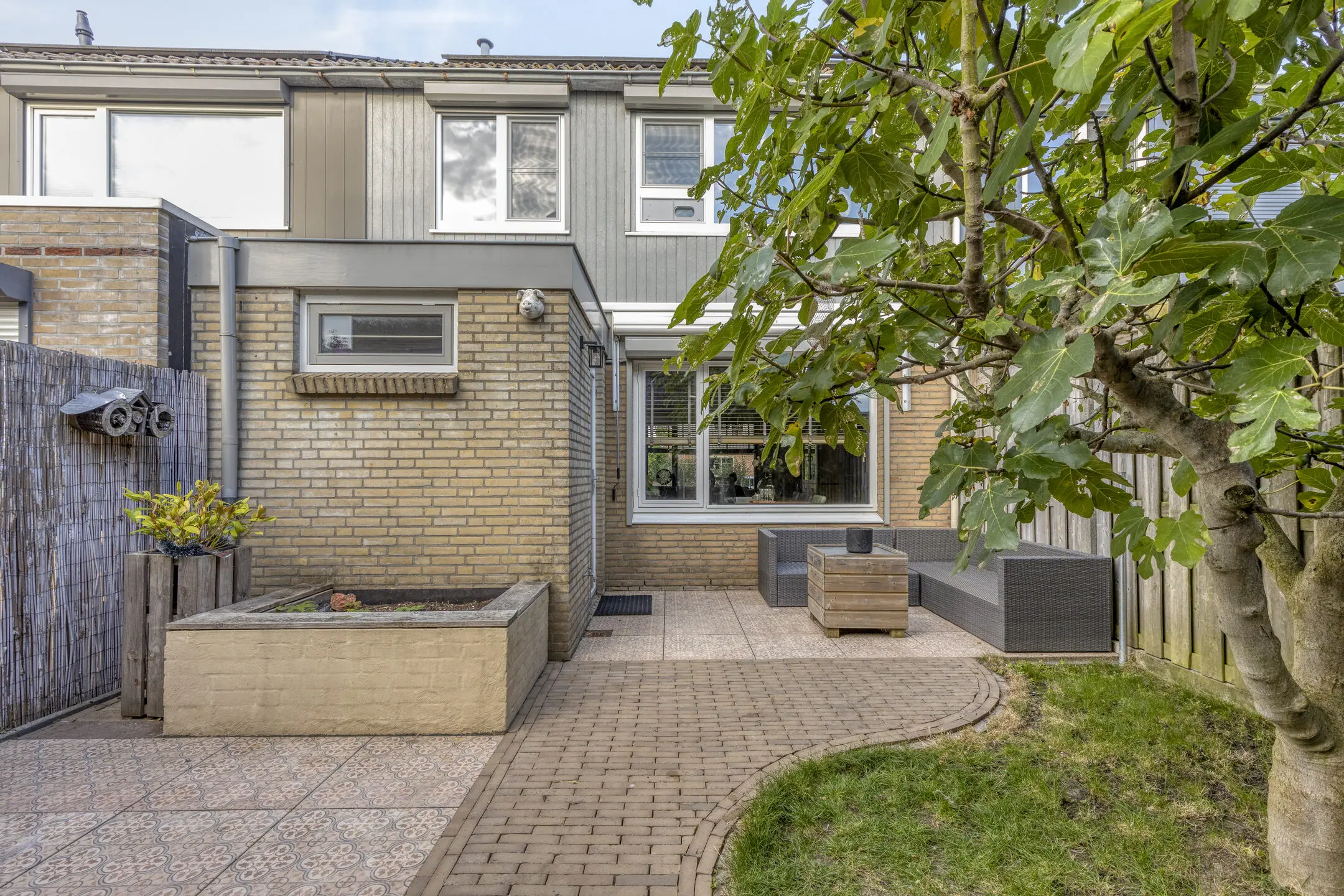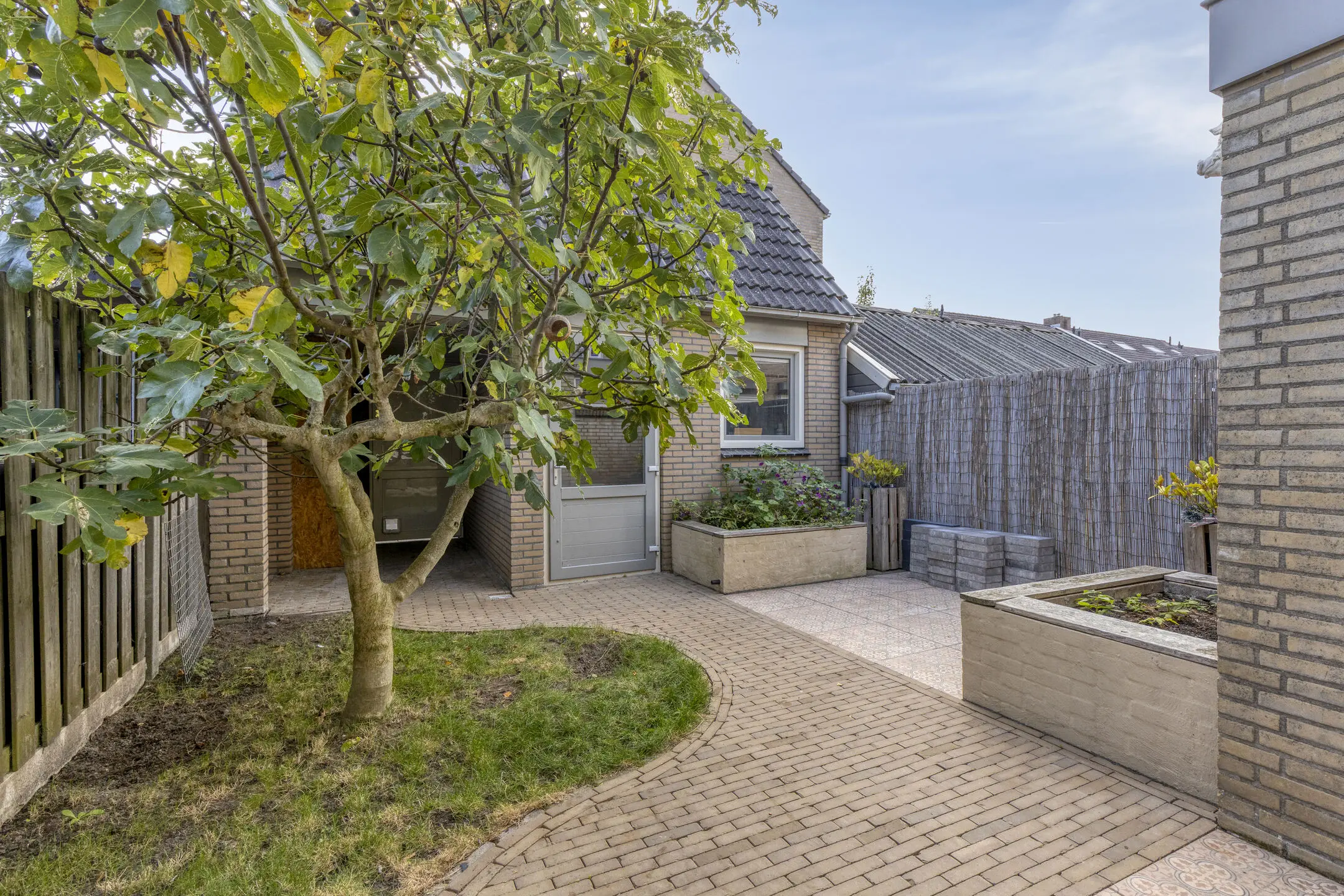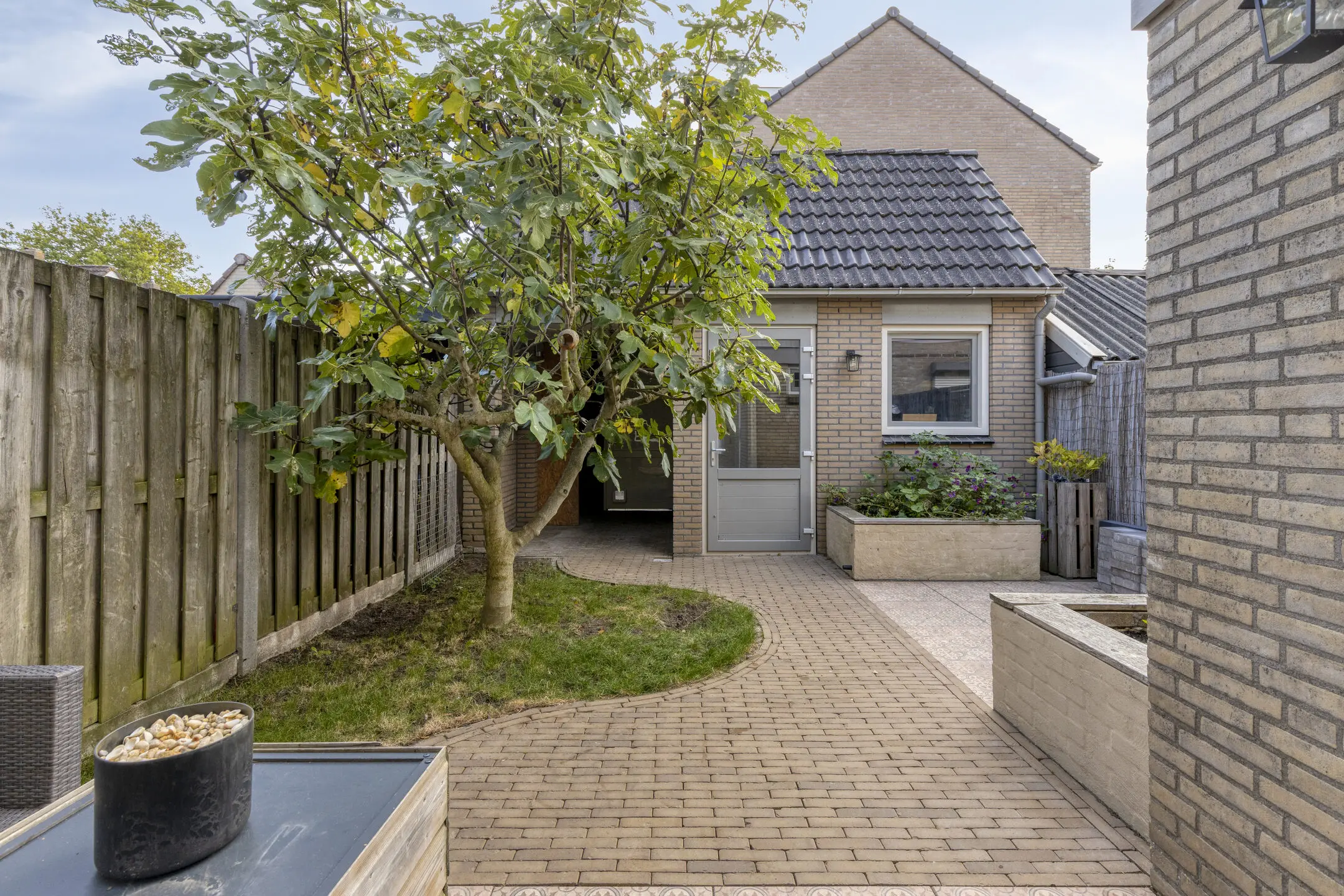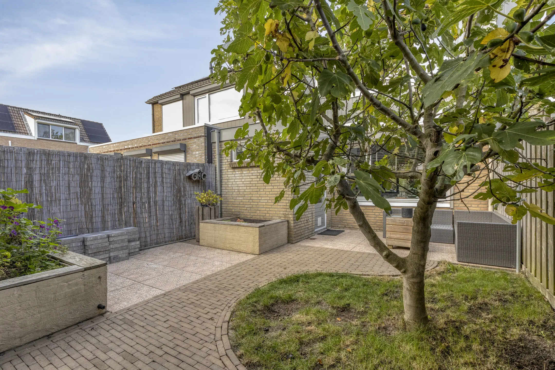 De zonnige achtertuin is een heerlijke plek om te genieten. Met een zonnescherm, een ruime geïsoleerde schuur met vliering en een vrije achterom biedt deze tuin volop comfort en gemak.