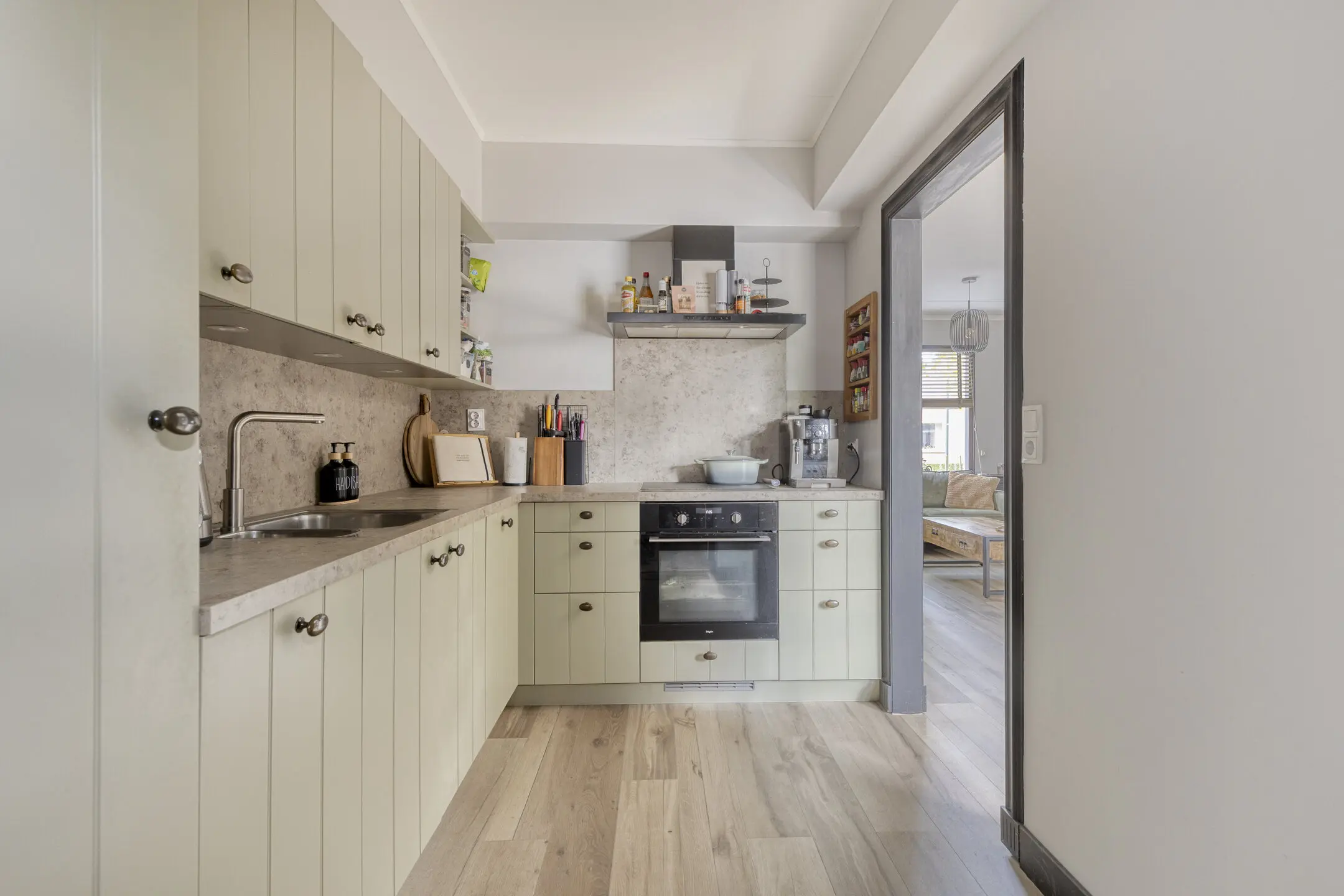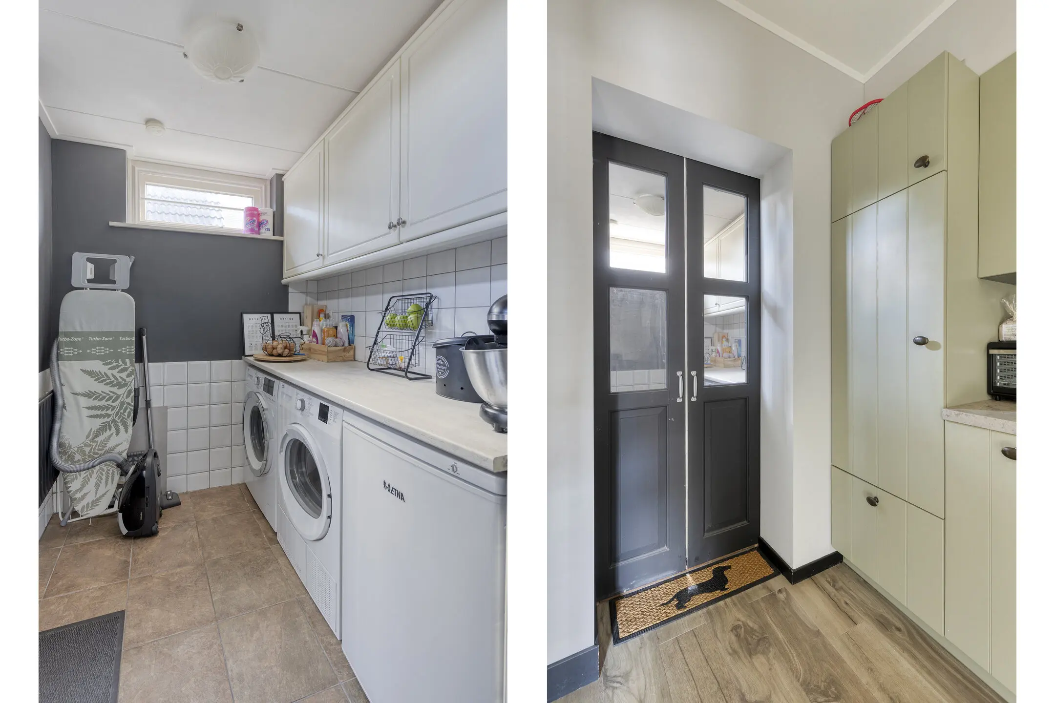Vanuit de woonkamer loopt u direct door naar de keuken, die in 2020 volledig vernieuwd is en voorzien van alle gemakken. Aansluitend bevindt zich de praktische bijkeuken met was- en drogeraansluiting.