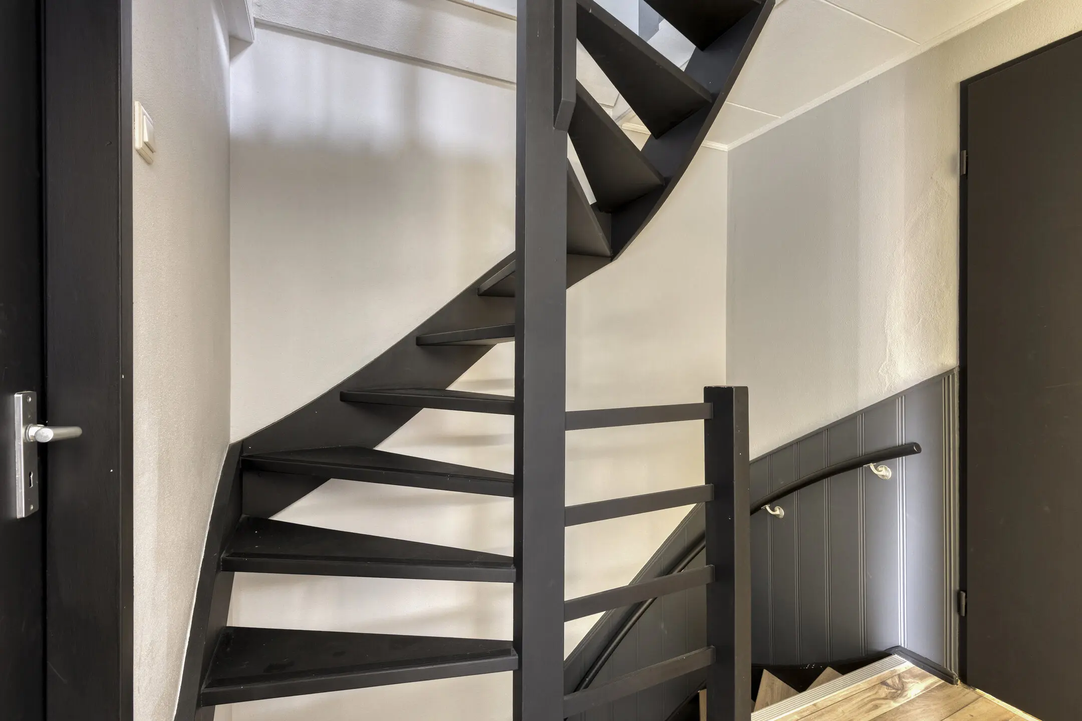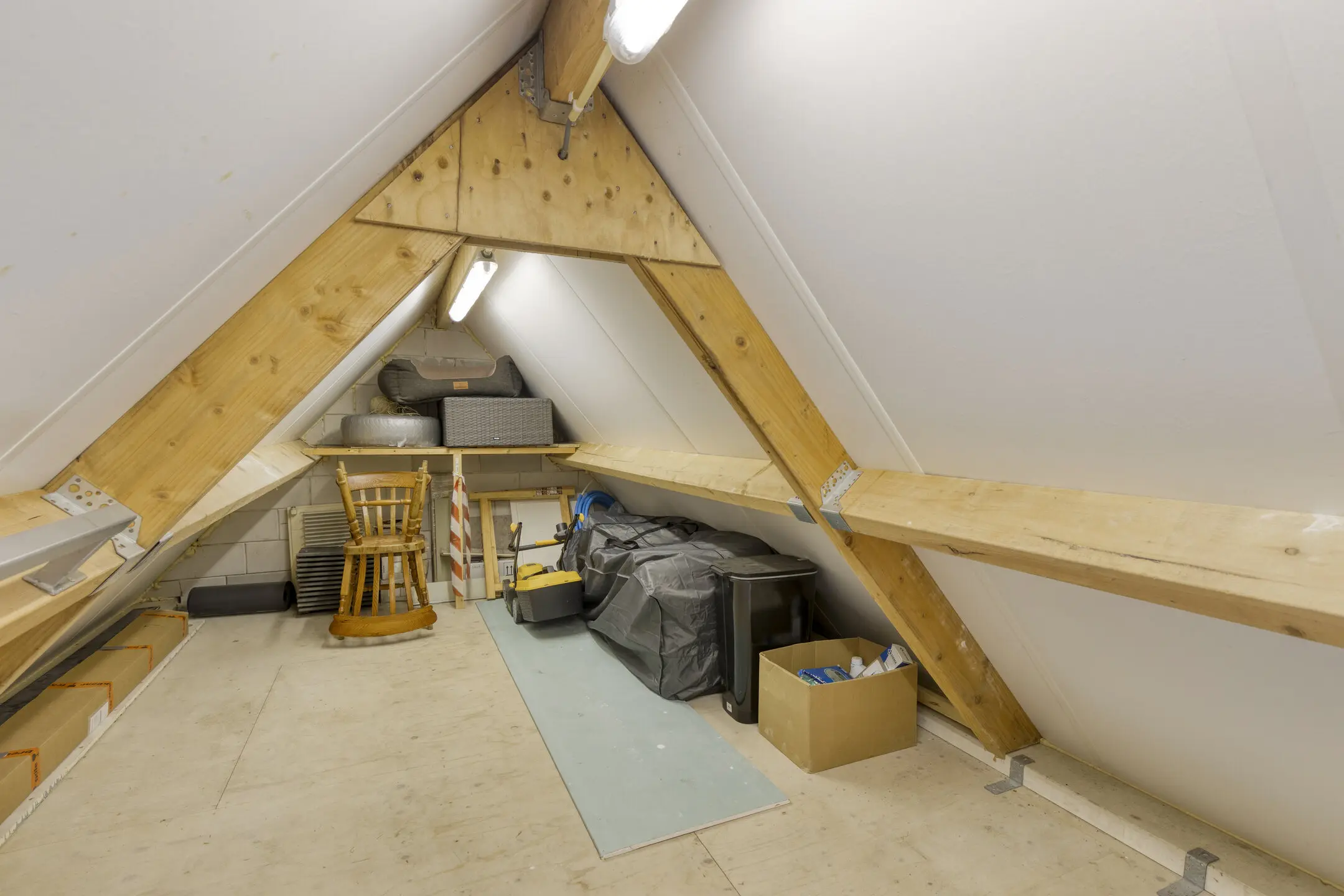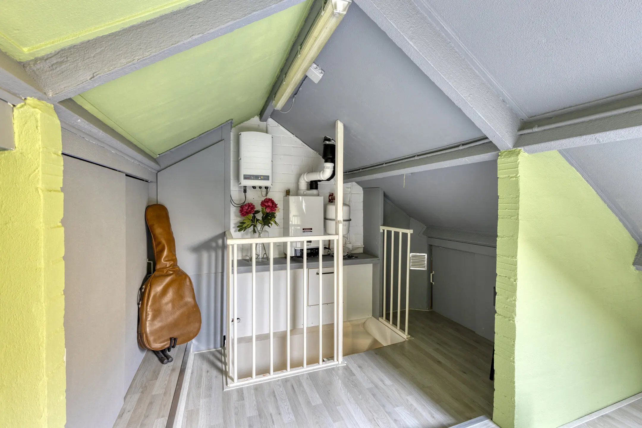 De tweede verdieping is bereikbaar via een vaste trap. Hier vindt u de overloop met de cv-ketel en de omvormer van de zonnepanelen.