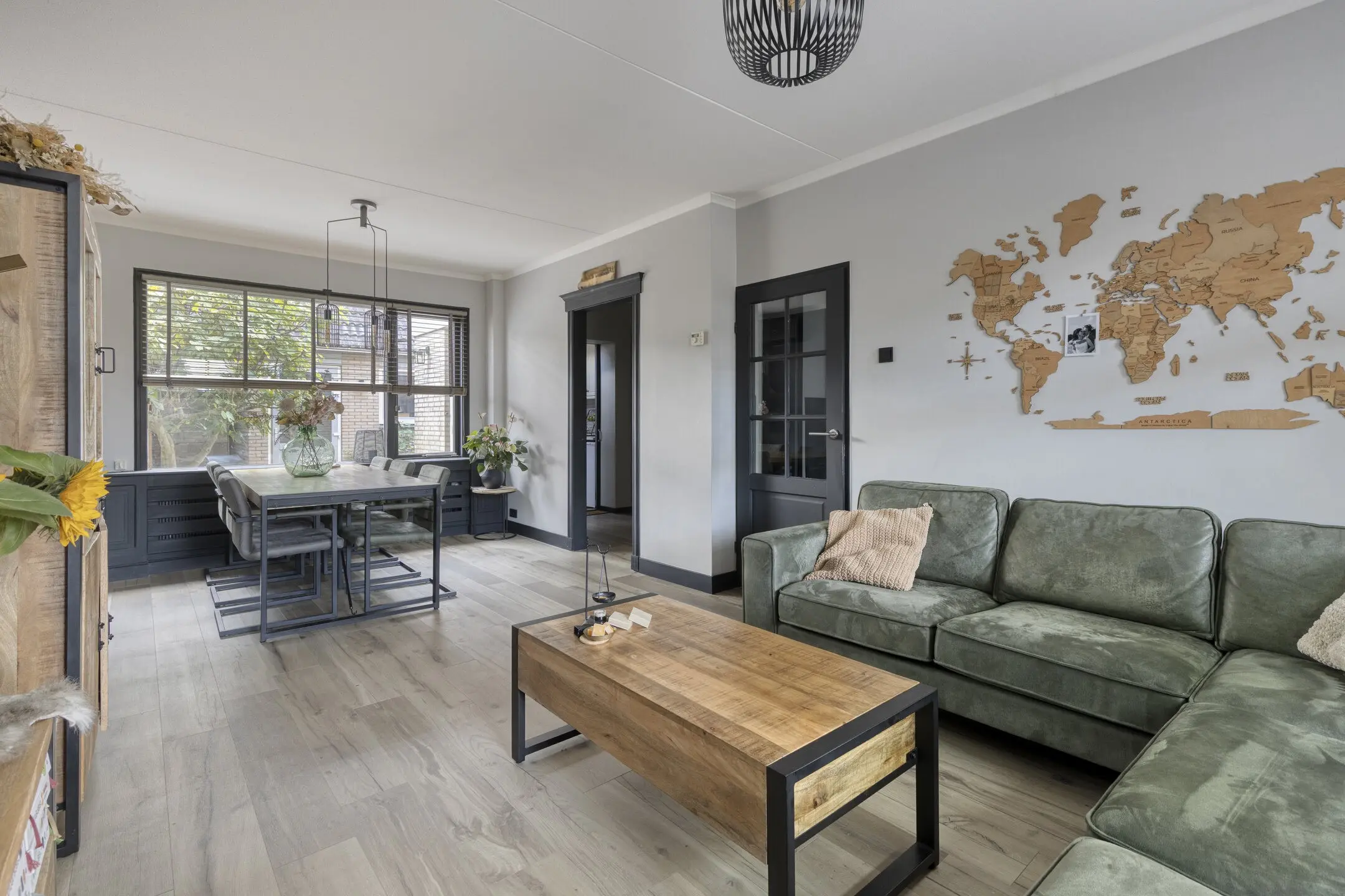 De doorzon woonkamer is licht en ruim en beschikt zowel aan de voor- als achterzijde over rolluiken.