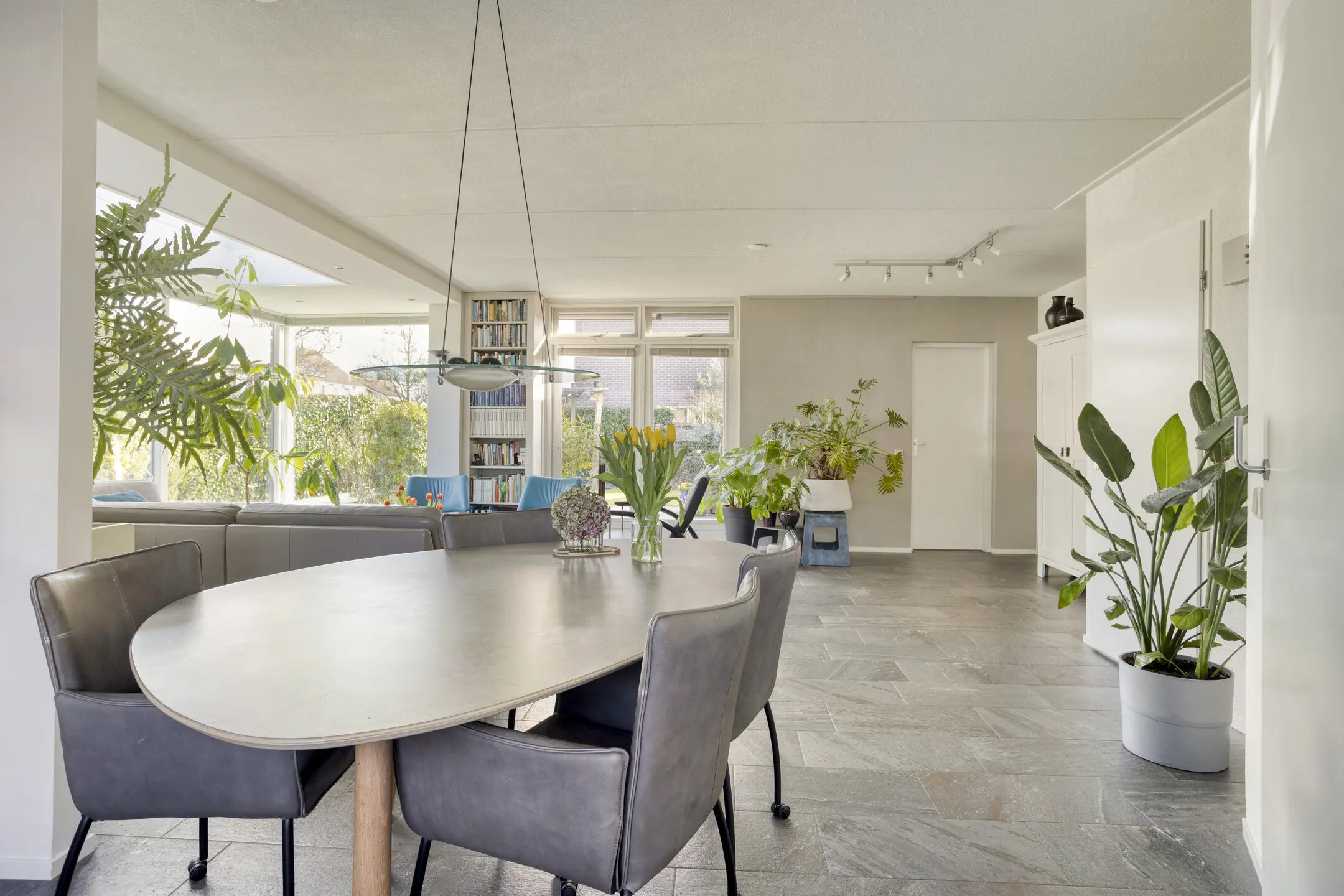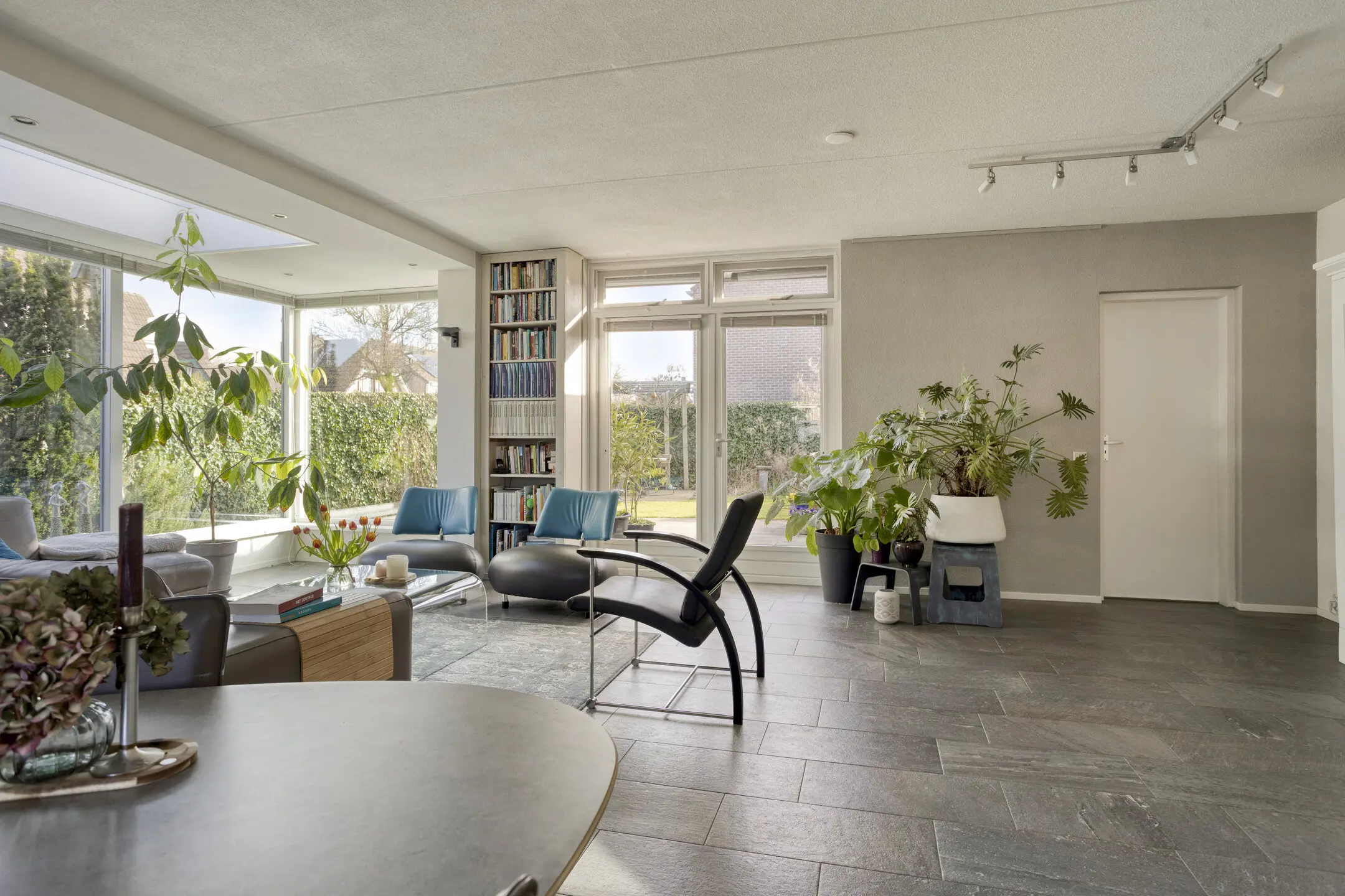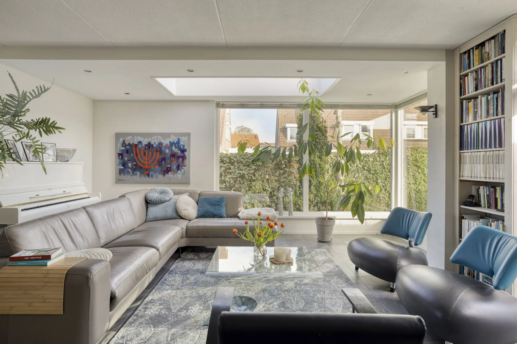 De woonkamer is opvallend ruim dankzij de uitbouw aan de zijkant. In deze uitbouw zorgen een mooie lichtstraat en grote raampartijen voor een heerlijke lichtinval. Bij de openslaande tuindeuren bevindt zich de zithoek, waar je een leuk zicht hebt op de tuin. De woonkamer beschikt daarnaast over een handige vaste trapkast en geeft toegang tot de bijkeuken aan de achterzijde van de woning.