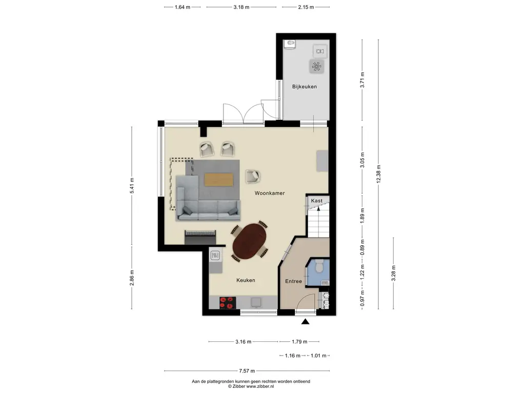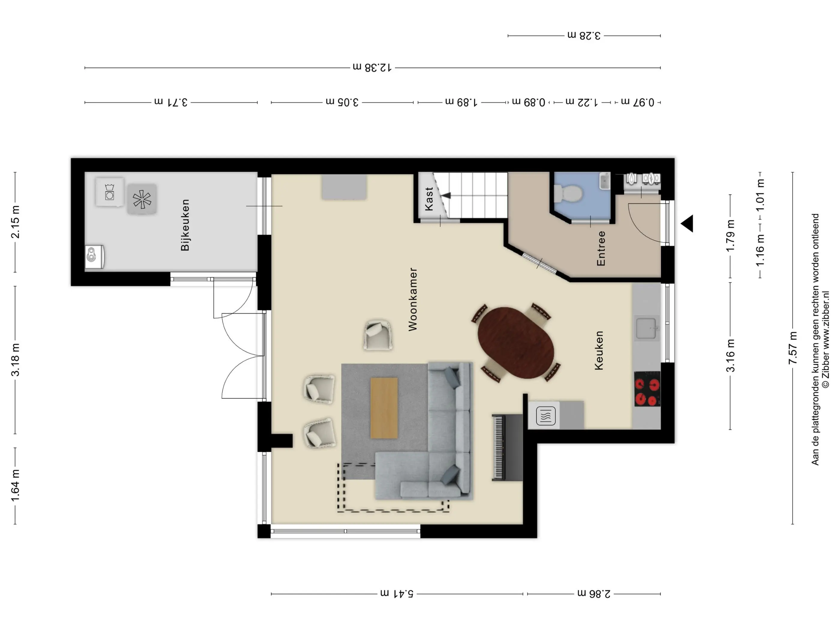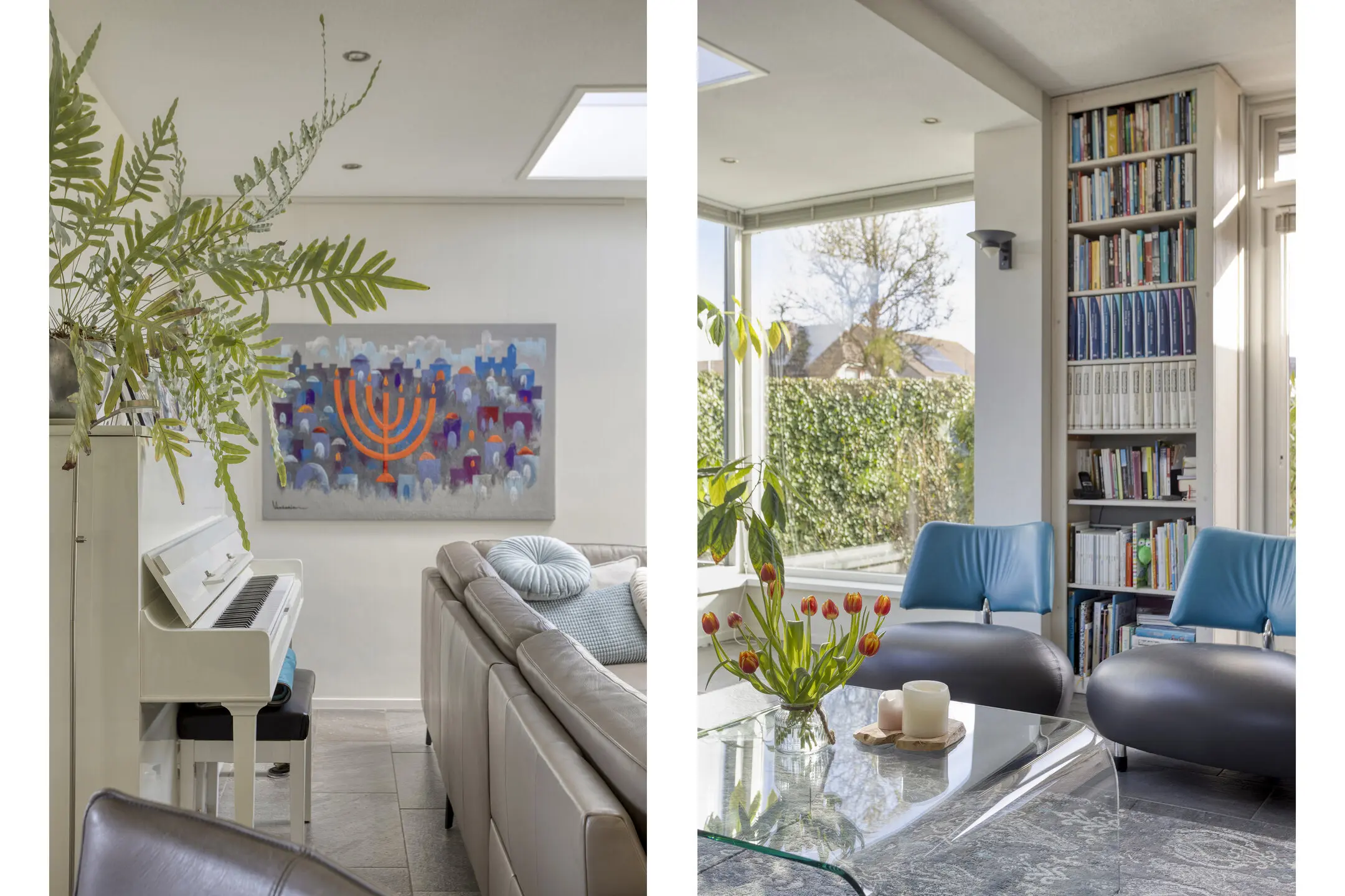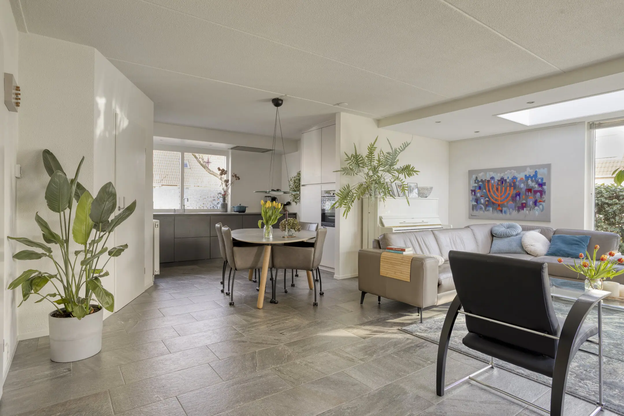 De woonkamer is opvallend ruim dankzij de uitbouw aan de zijkant. In deze uitbouw zorgen een mooie lichtstraat en grote raampartijen voor een heerlijke lichtinval. Bij de openslaande tuindeuren bevindt zich de zithoek, waar je een leuk zicht hebt op de tuin. De woonkamer beschikt daarnaast over een handige vaste trapkast en geeft toegang tot de bijkeuken aan de achterzijde van de woning.
