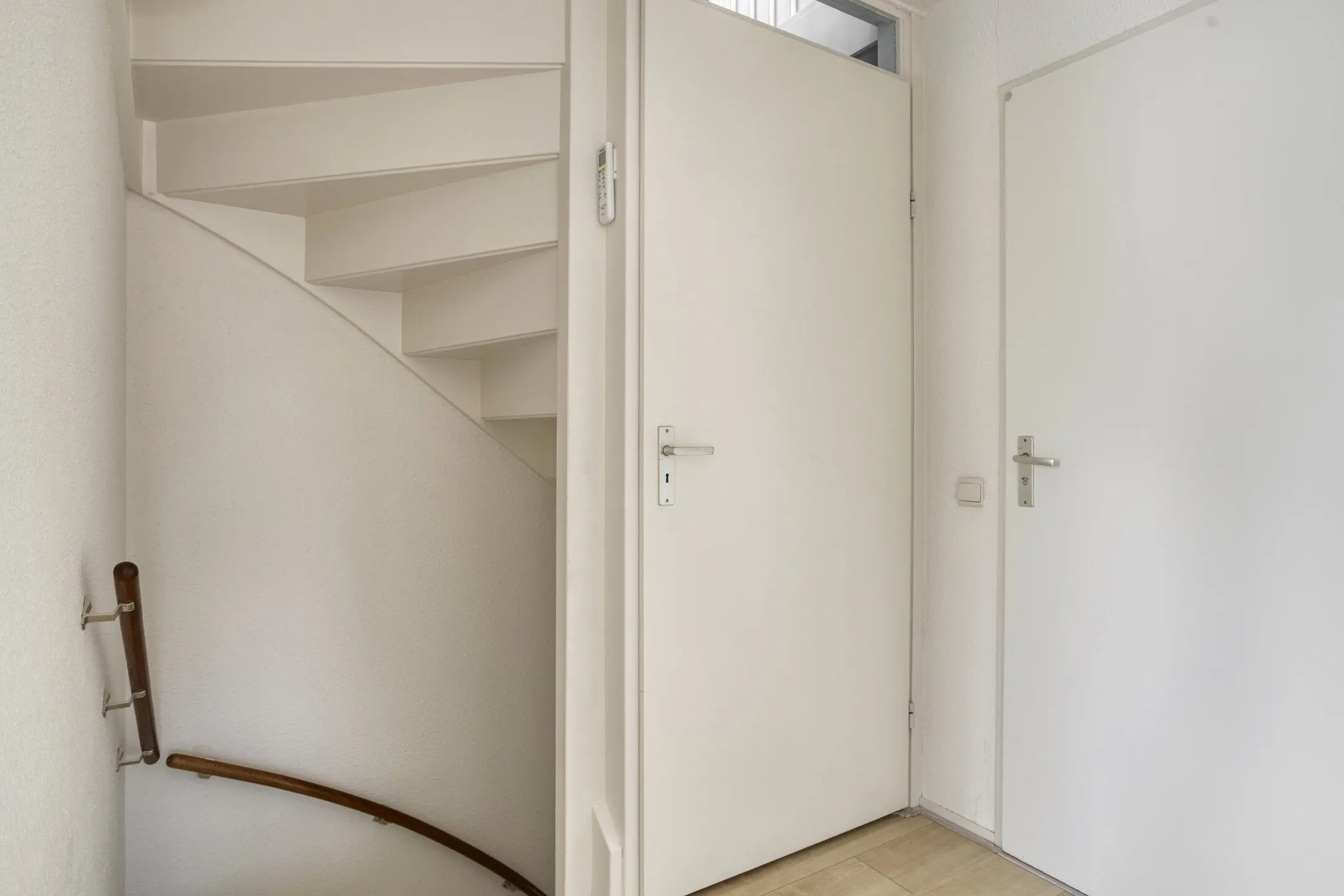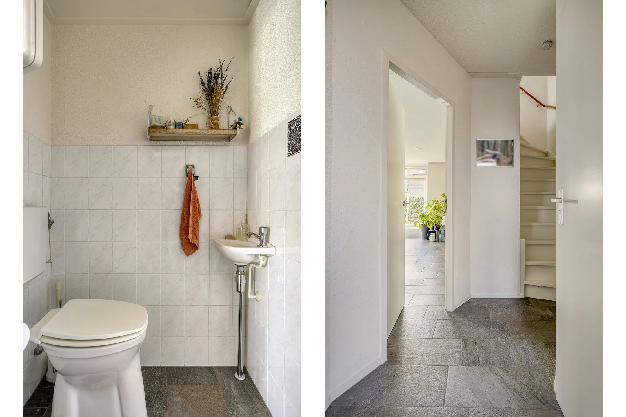 Via de entree kom je binnen in de hal met het toilet voorzien van fonteintje, de meterkast en de trap naar de eerste verdieping.