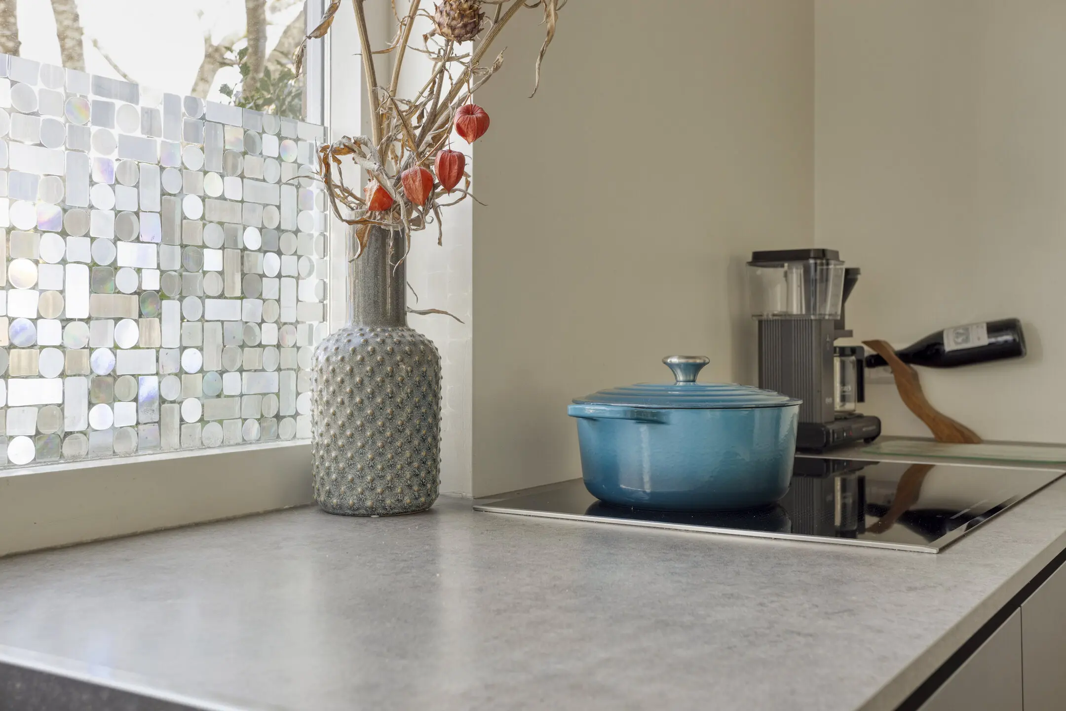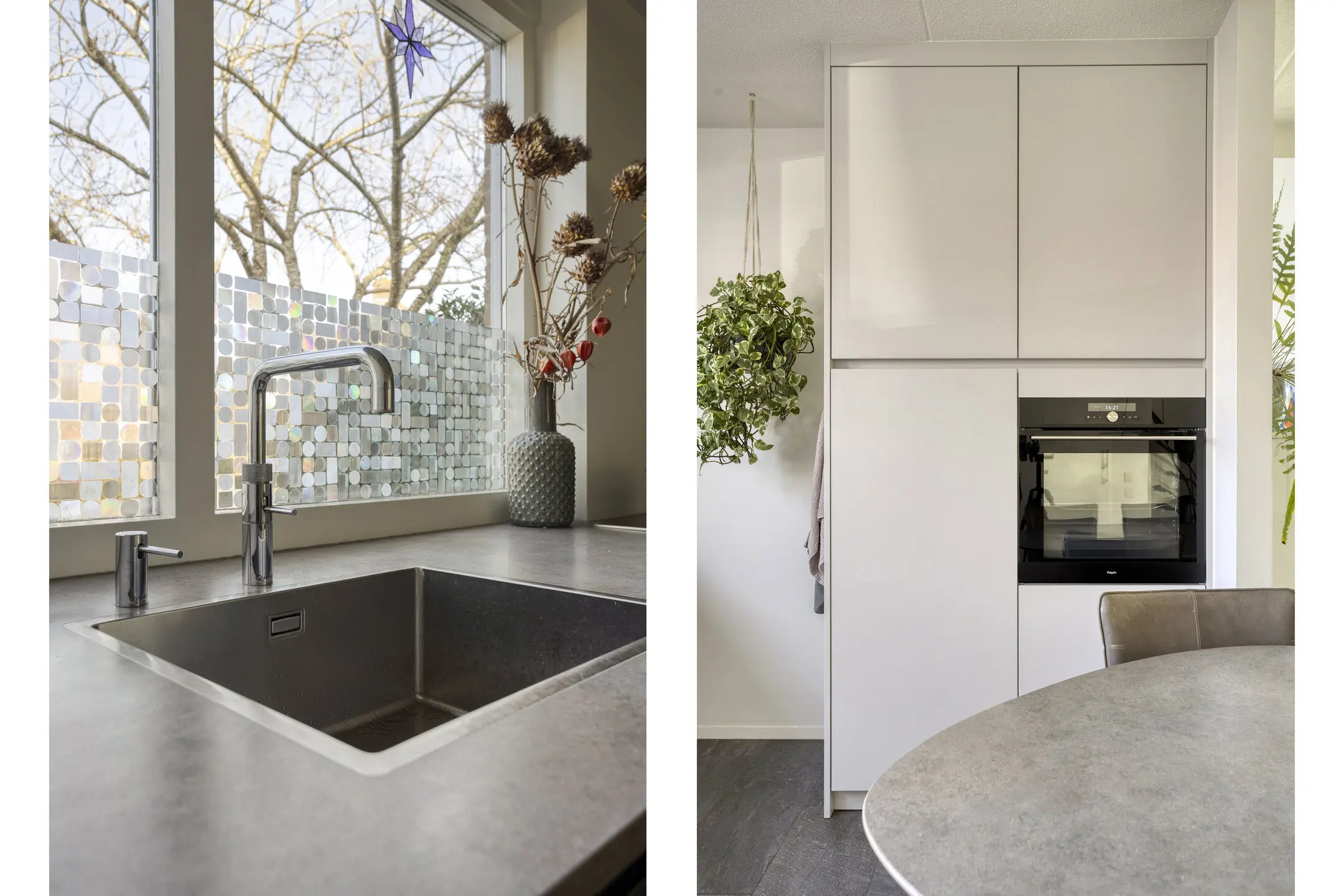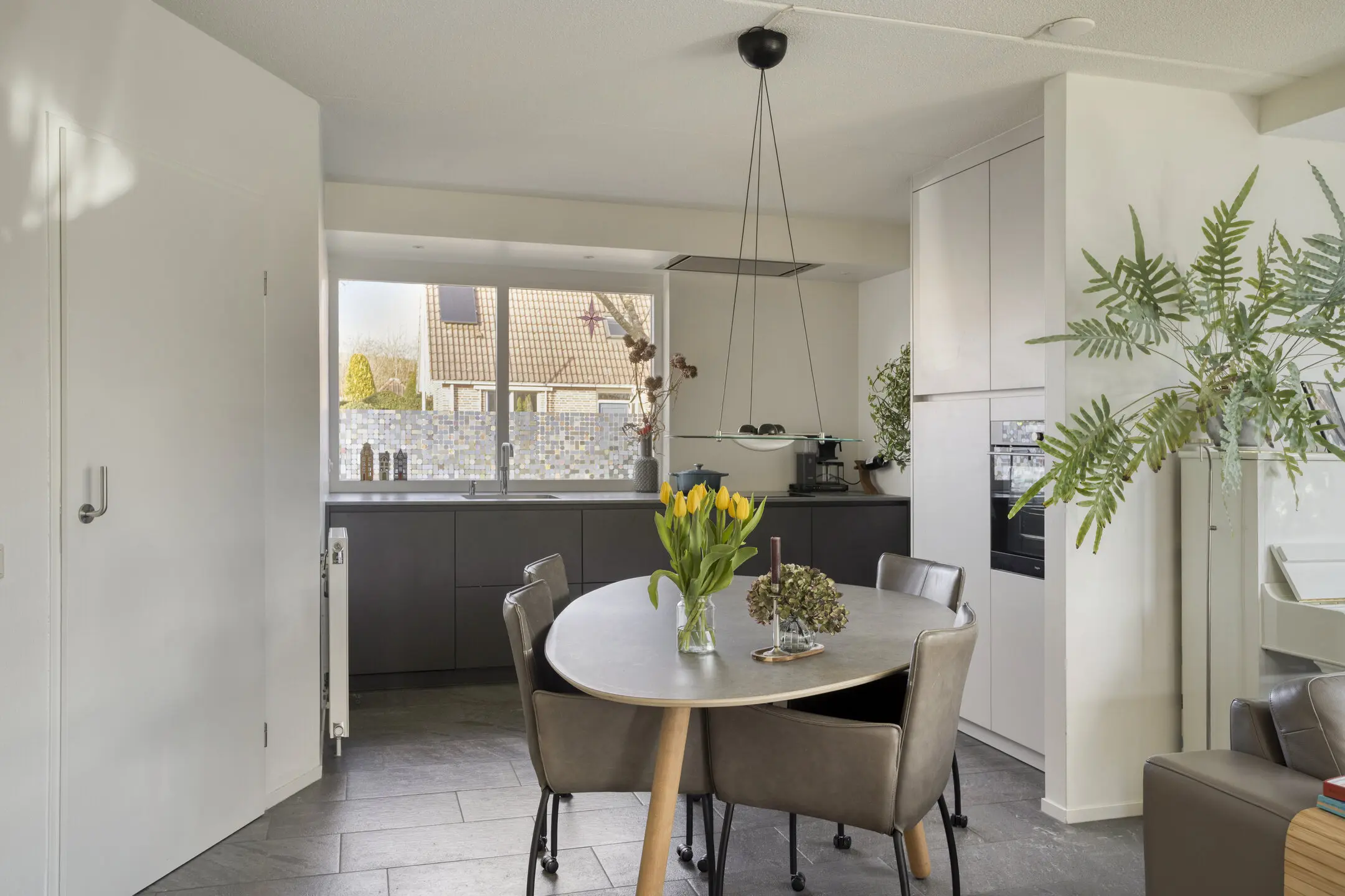 De open keuken is aan de voorzijde van de woning gesitueerd. Deze keuken is in 2020 vernieuwd en voorzien van diverse inbouwapparatuur, zoals een koelkast, vaatwasser, oven, 4-pits inductiekookplaat met afzuigkap en een Quooker. De inbouwspots en de moderne kleurstelling maken dit een prettige en praktische plek om te koken.