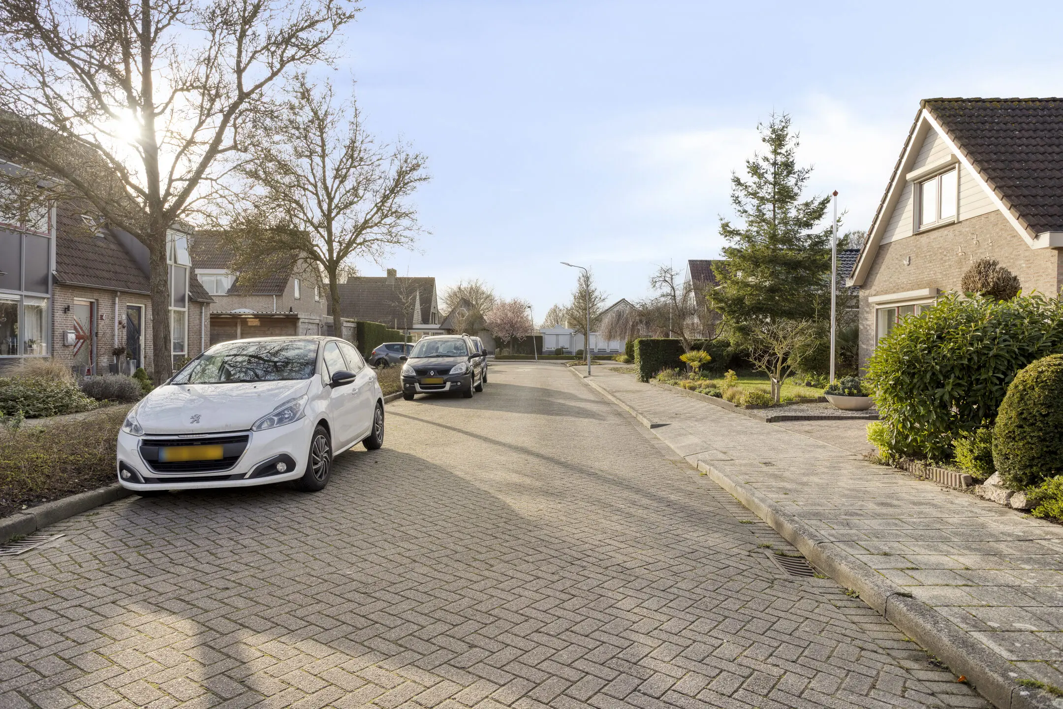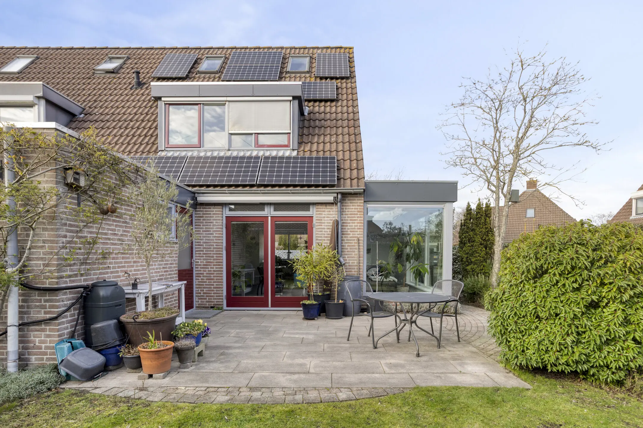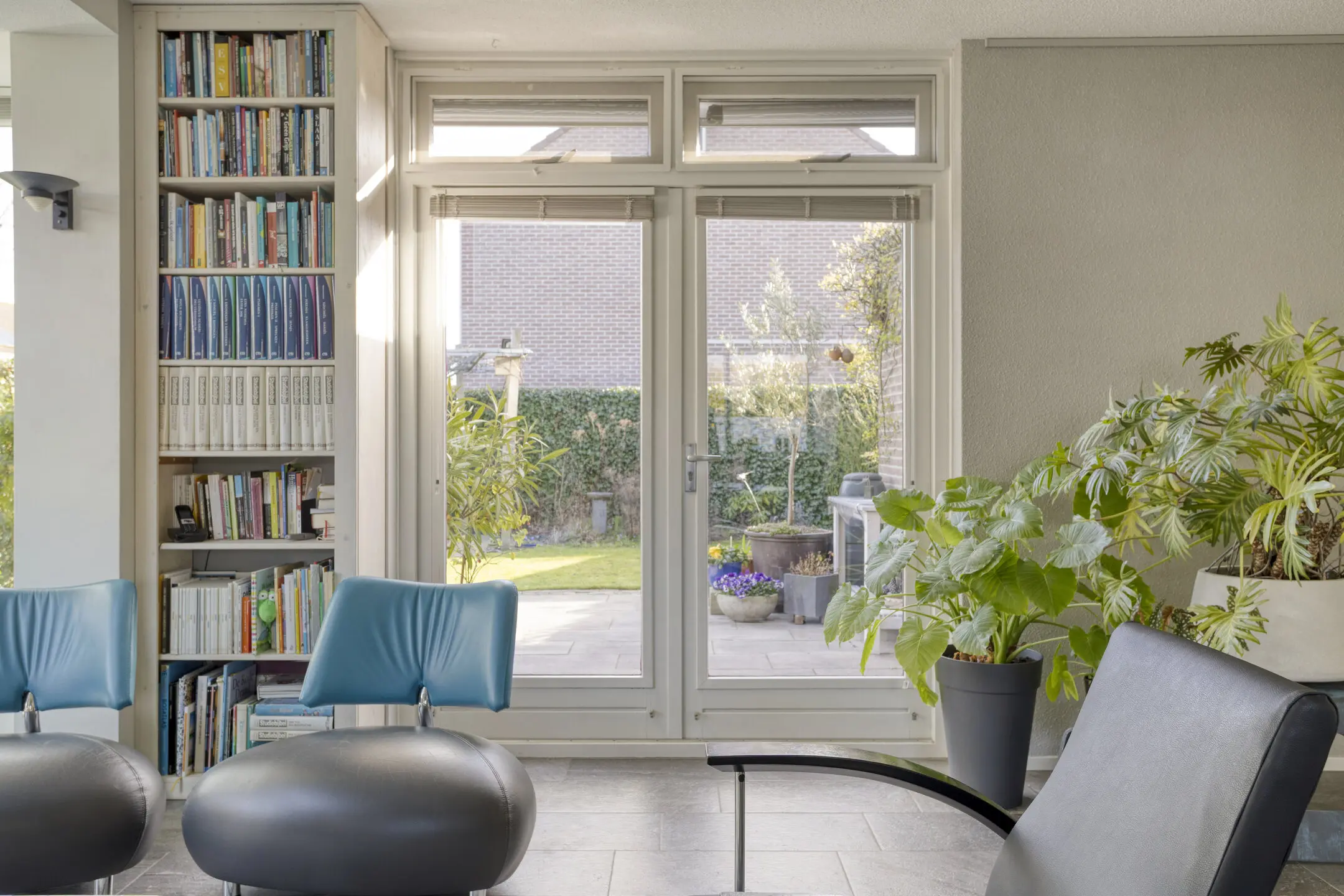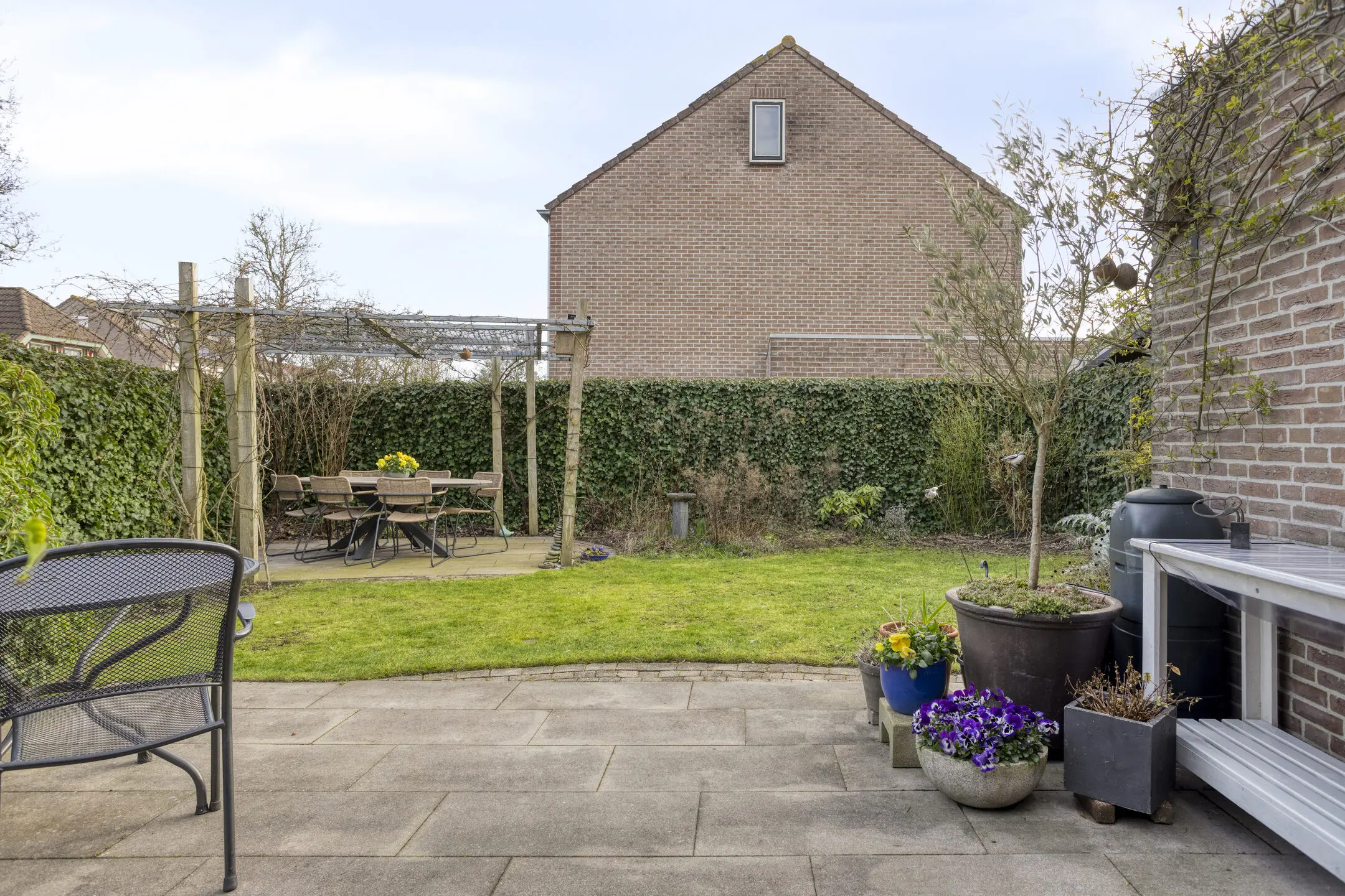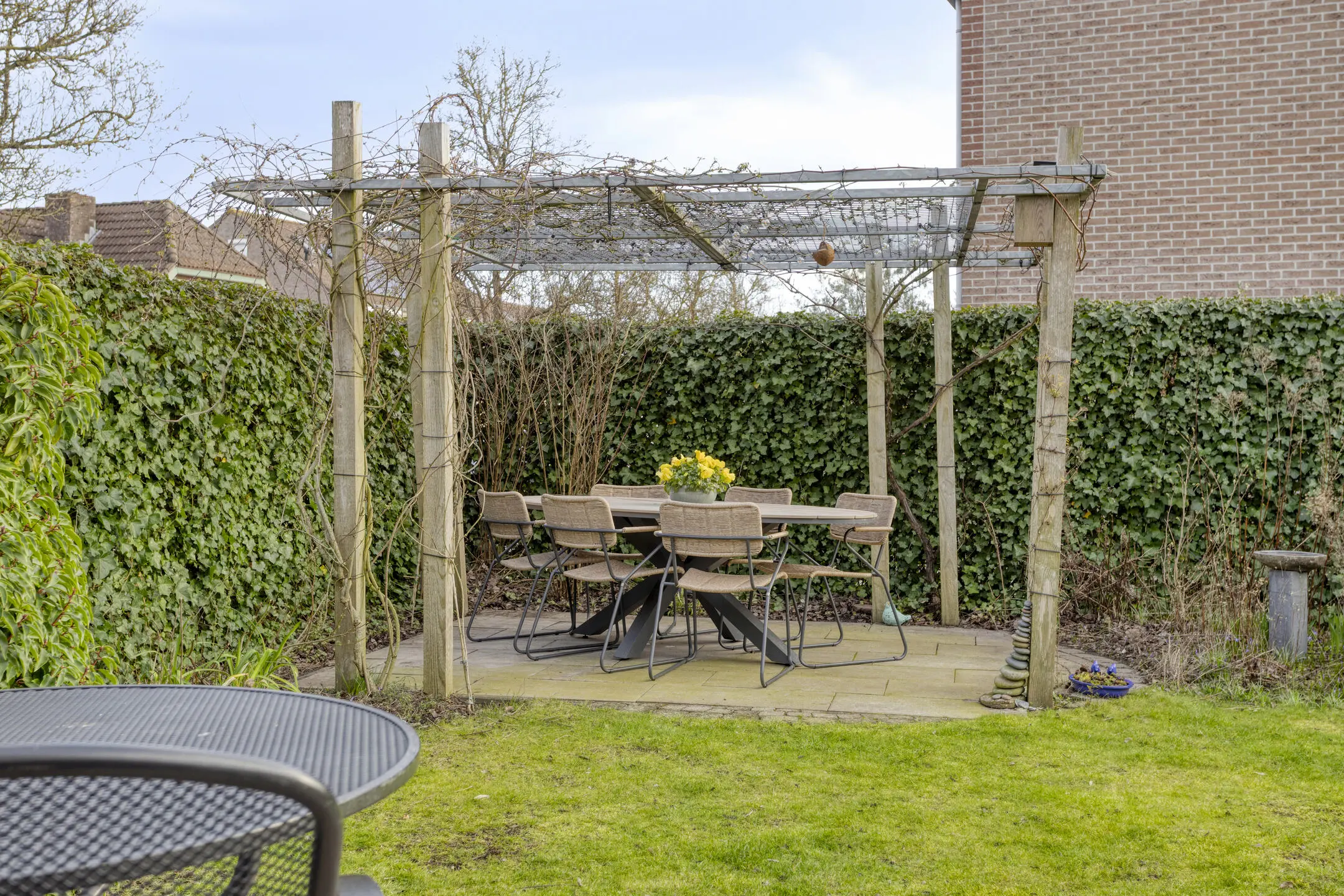 De tuin is ingericht met sierbestrating, een siertuin en gazon. Dankzij het hoekperceel ervaar je hier verrassend veel ruimte en privacy. Boven de openslaande tuindeuren hangt een zonwering.