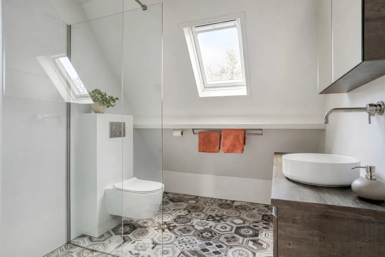 De badkamer is eveneens in 2020 gemoderniseerd en is strak en praktisch ingedeeld. De ruimte beschikt over een inloop regendouche, hangtoilet en een fraai badmeubel met waskom. Daarnaast is er elektrische vloerverwarming, mechanische ventilatie en een Velux dakraam aanwezig.