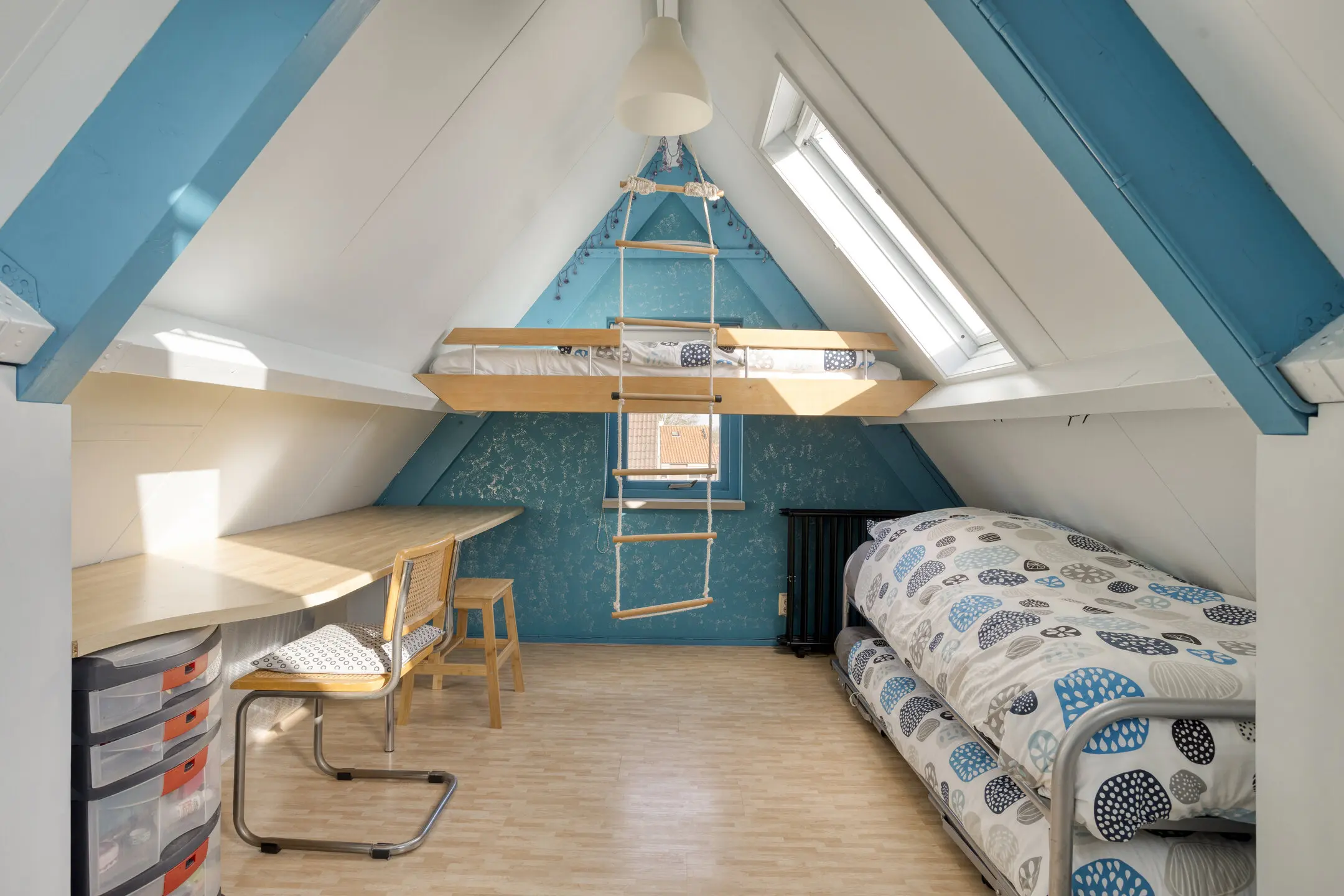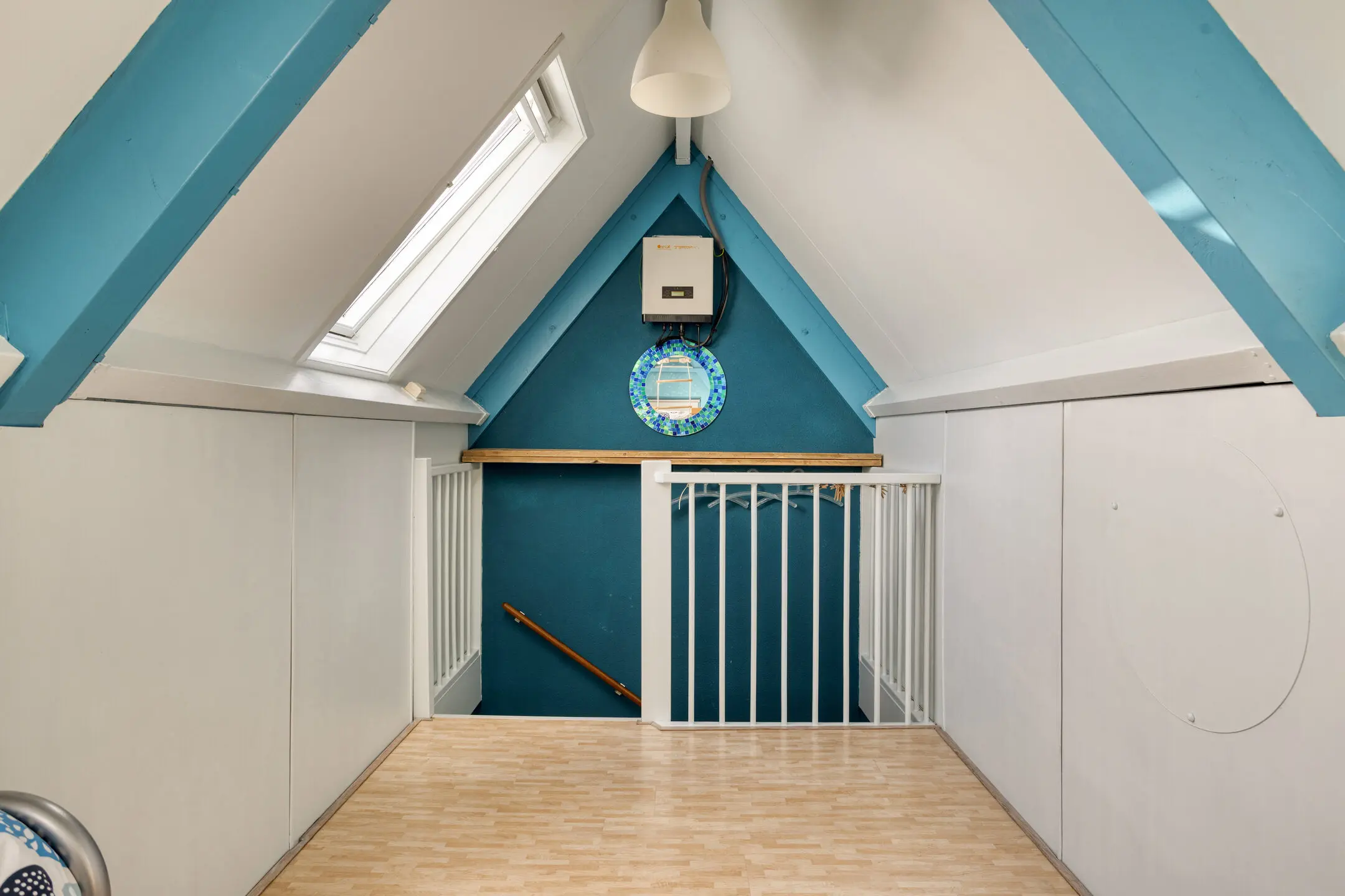 Deze kamer is aangenaam licht dankzij de drie ramen en biedt daarnaast een leuke extra verrassing: in de dakpunt is een extra slaapplek gerealiseerd. Achter het knieschot is de unit van de mechanische ventilatie netjes weggewerkt en ook de omvormer van de zonnepanelen bevindt zich op deze verdieping.