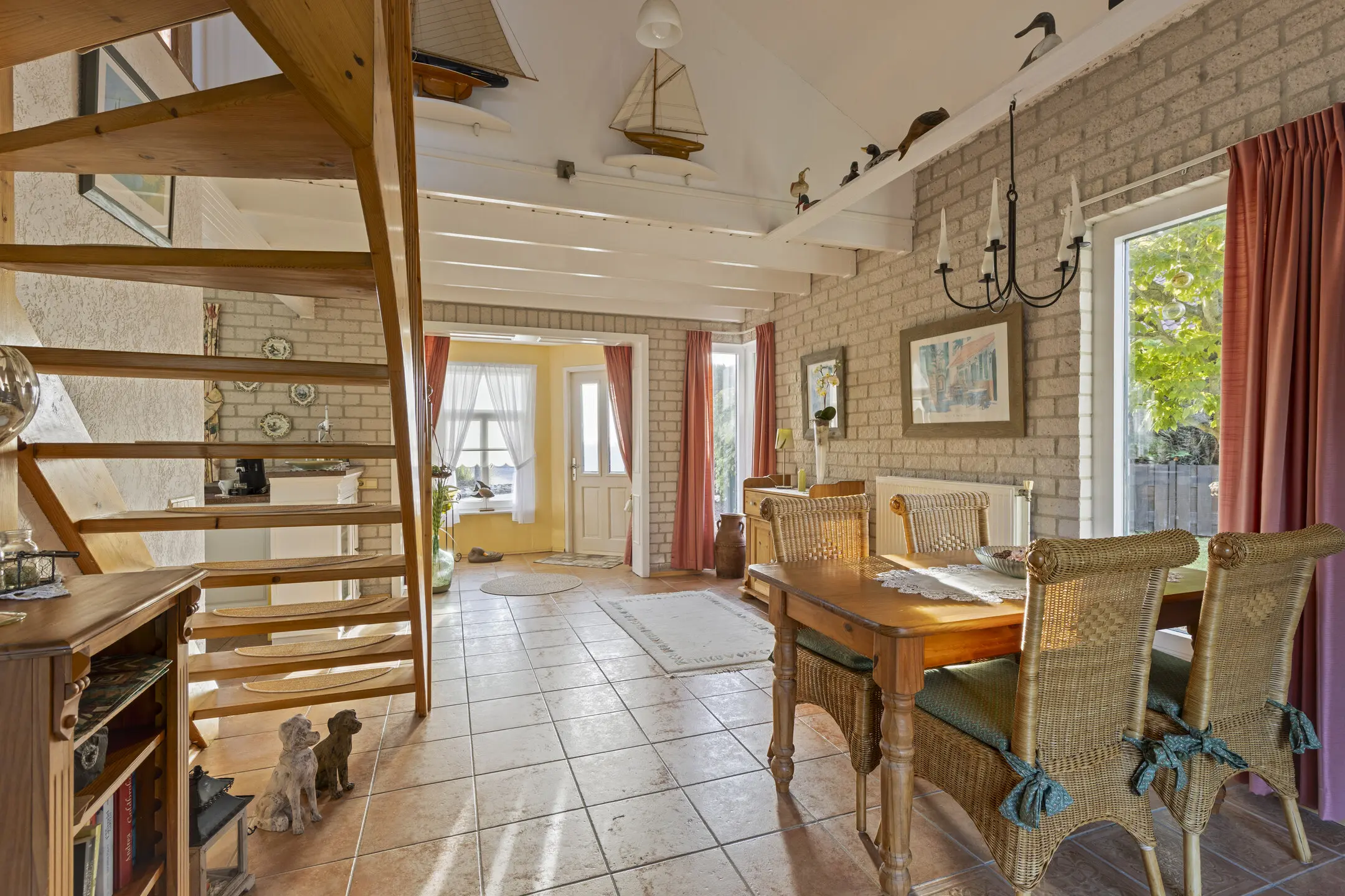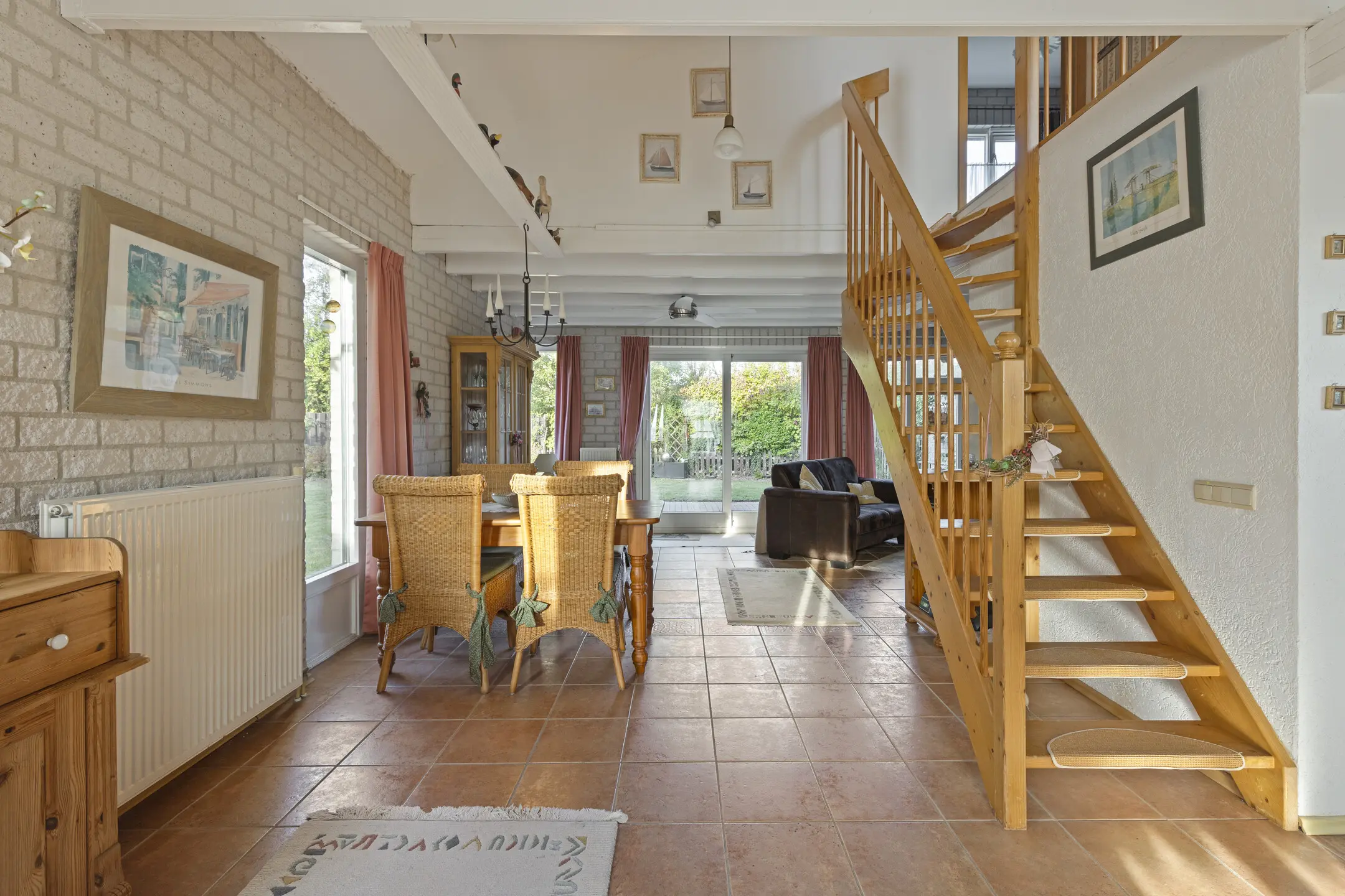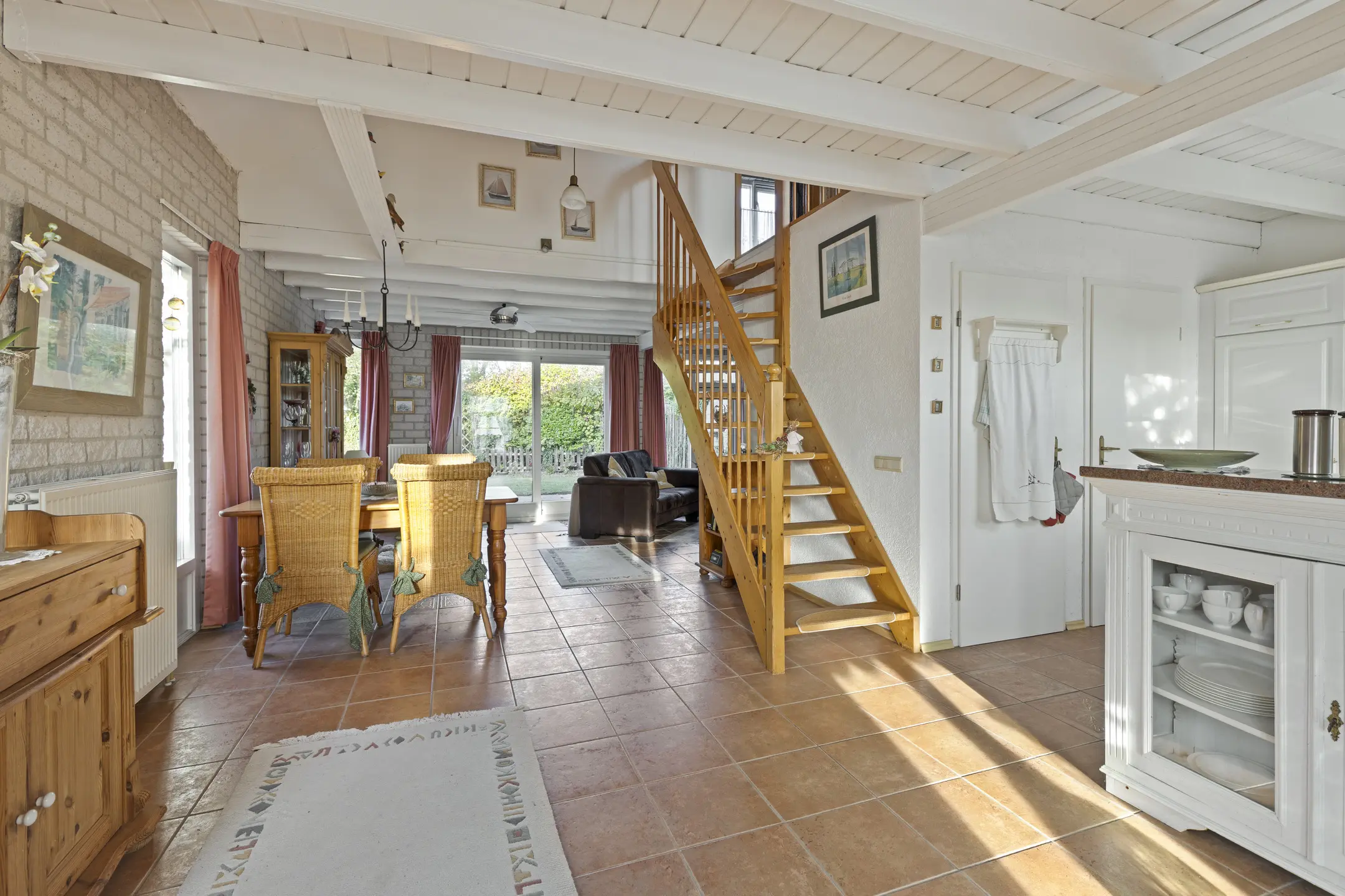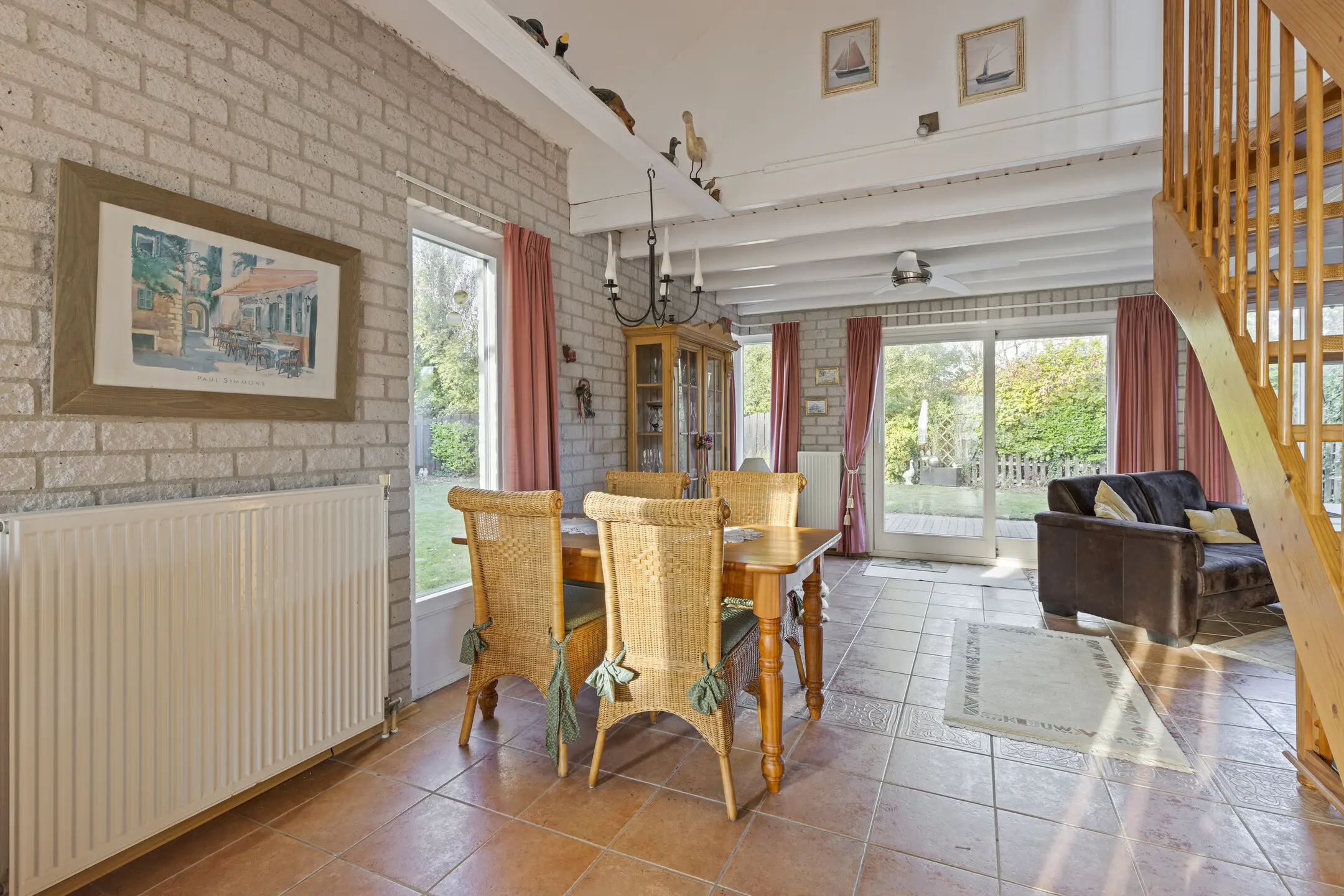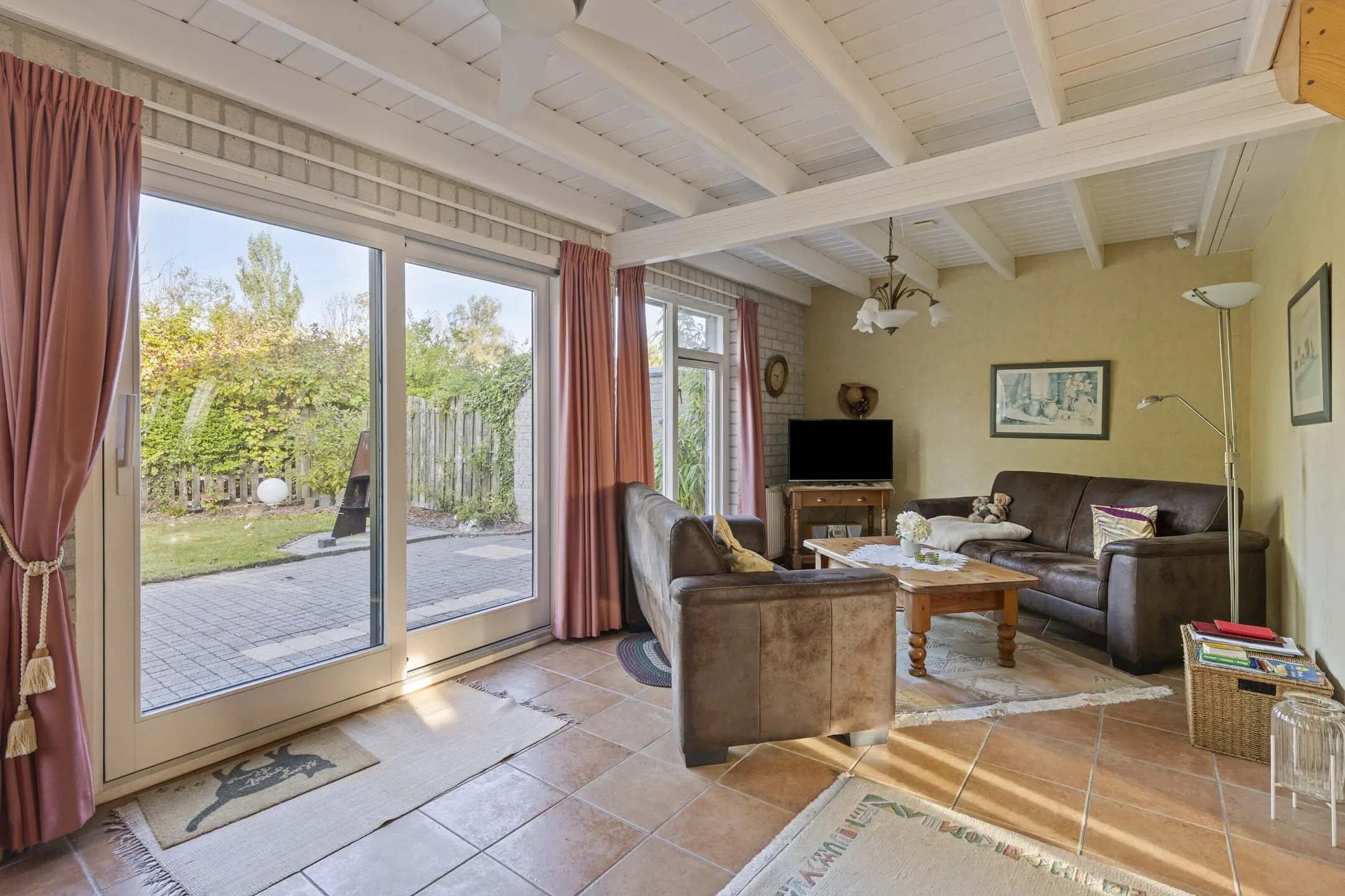 De woonkamer is lekker ruim en licht en geeft via de schuifpui toegang naar de heerlijke vrije tuin. Verder is de woonkamer voorzien van een balkenplafond. De betonnen vloer is afgewerkt met plavuizen.