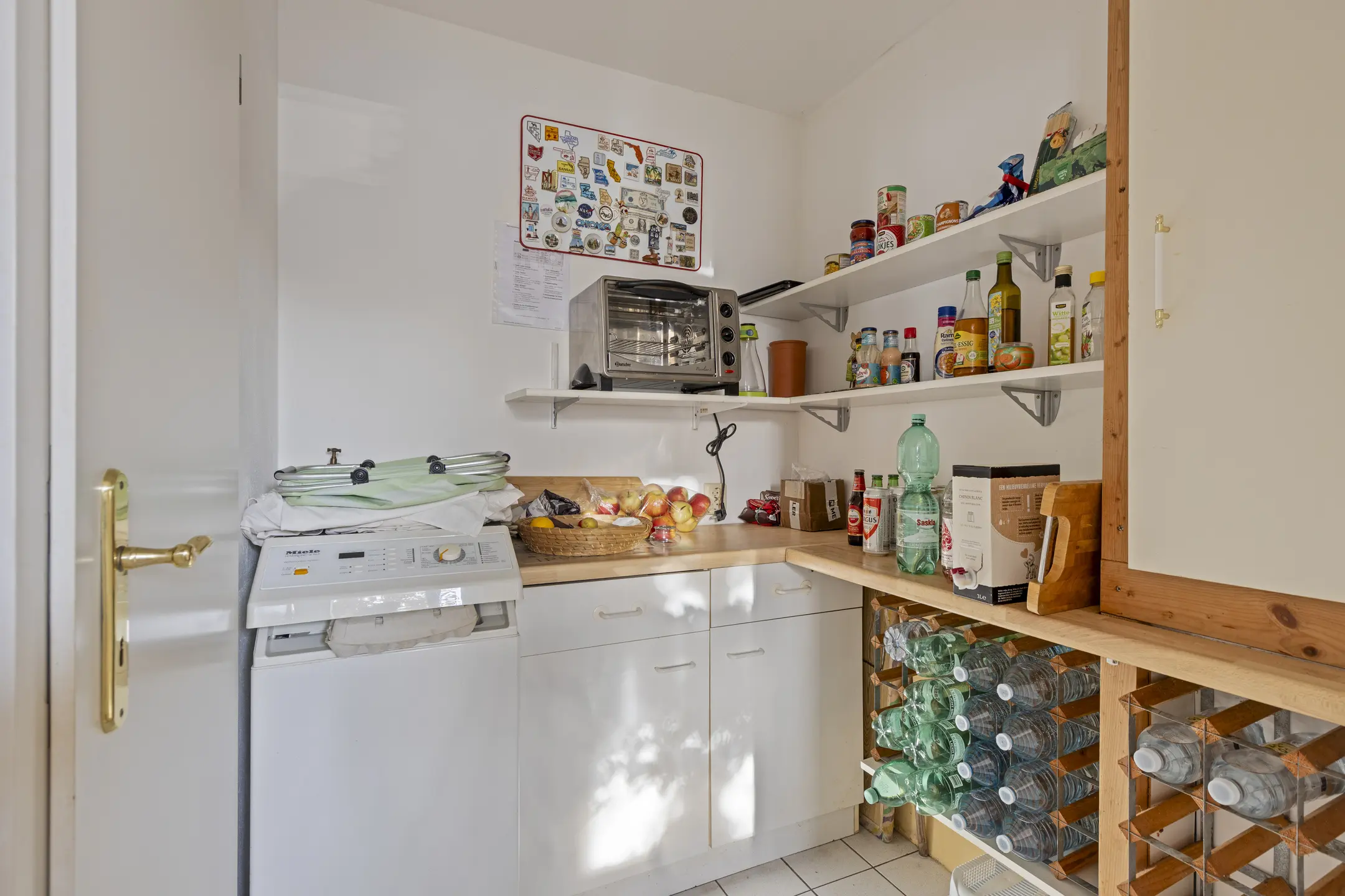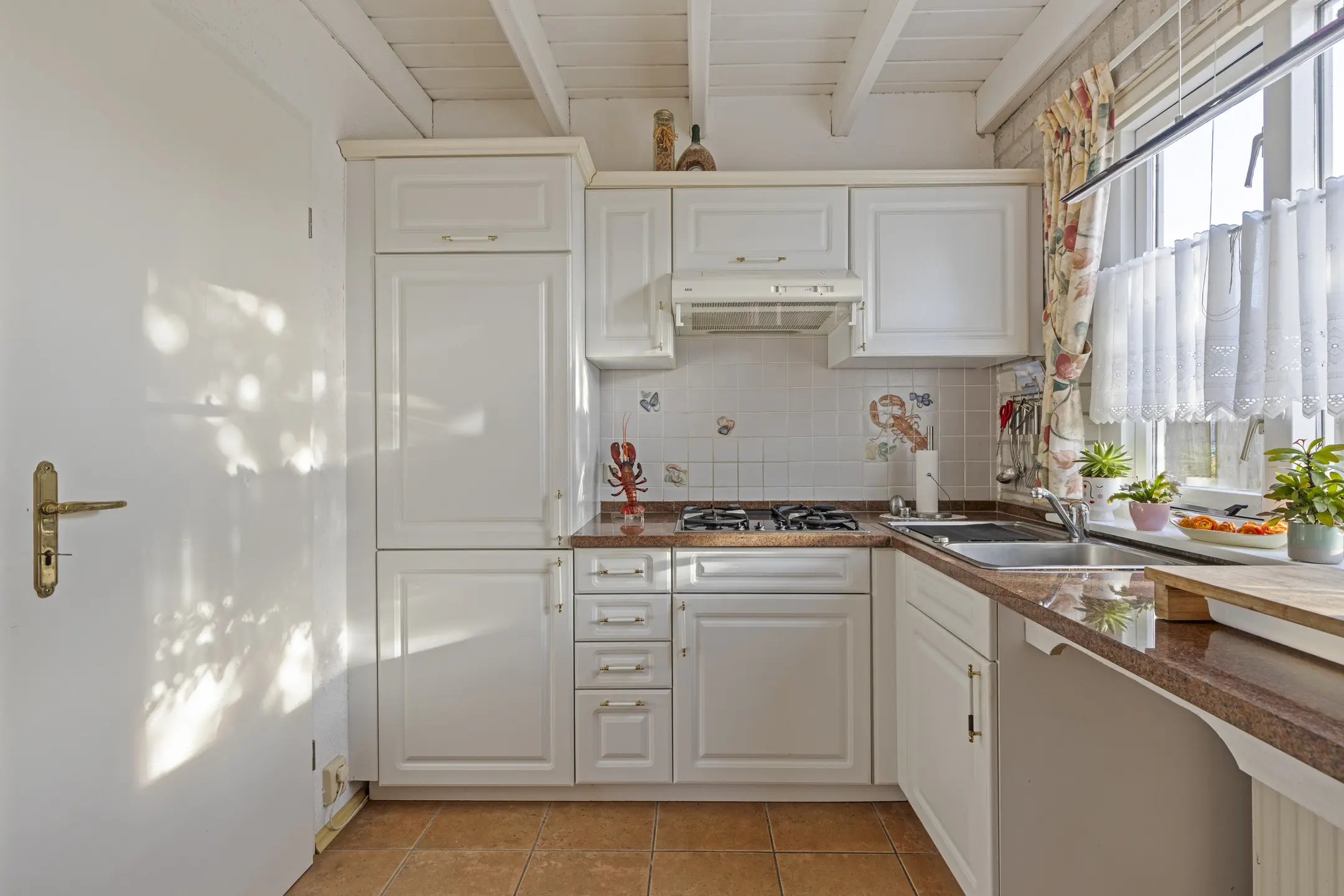 Via de ruime hal bereik je de woning welke toegang geeft tot de eetkamer / open keuken. De open keuken, uitgevoerd in een hoekopstelling, is uitgerust met diverse inbouwapparatuur, waaronder een koelkast en een 4-pits gaskookplaat met afzuigkap. Vanuit de keuken zijn zowel de meterkast als de bijkeuken toegankelijk. De bijkeuken biedt extra bergruimte en is voorzien van een aansluiting voor de wasmachine. Vanuit de bijkeuken is ook het toilet bereikbaar, dat is uitgerust met een fonteintje.