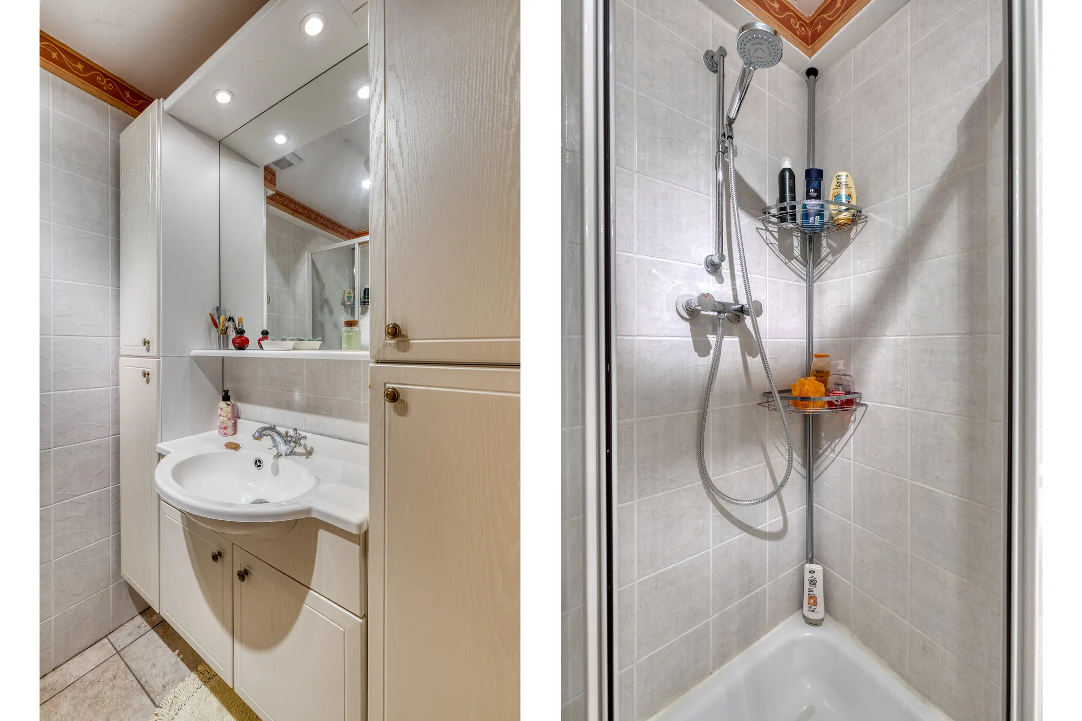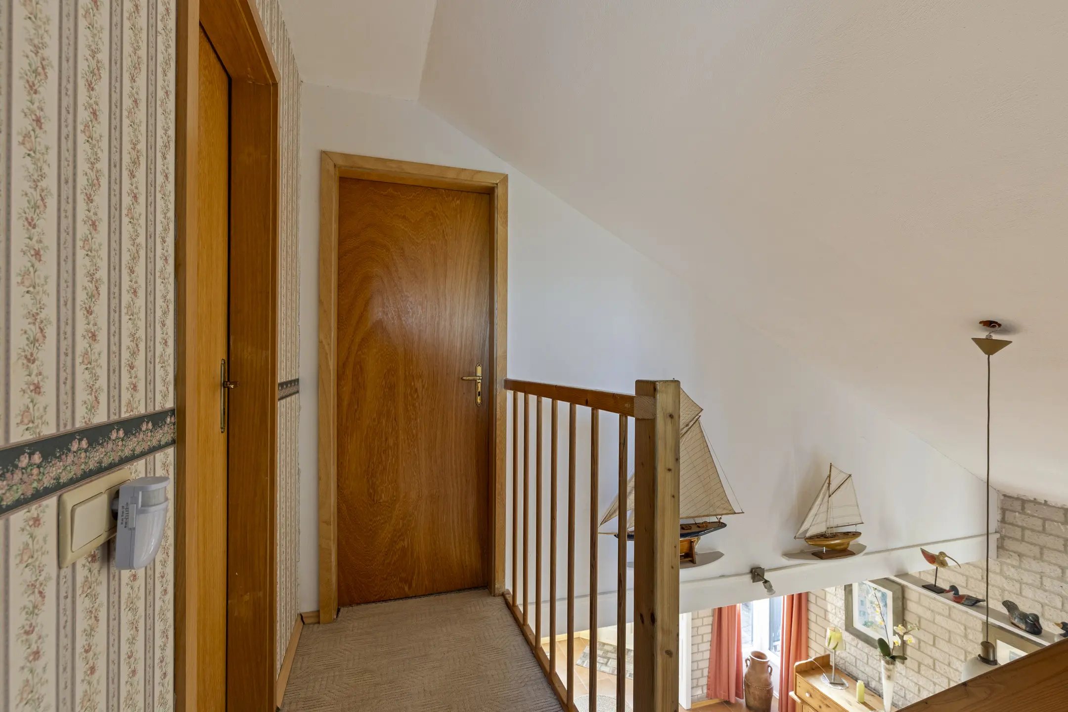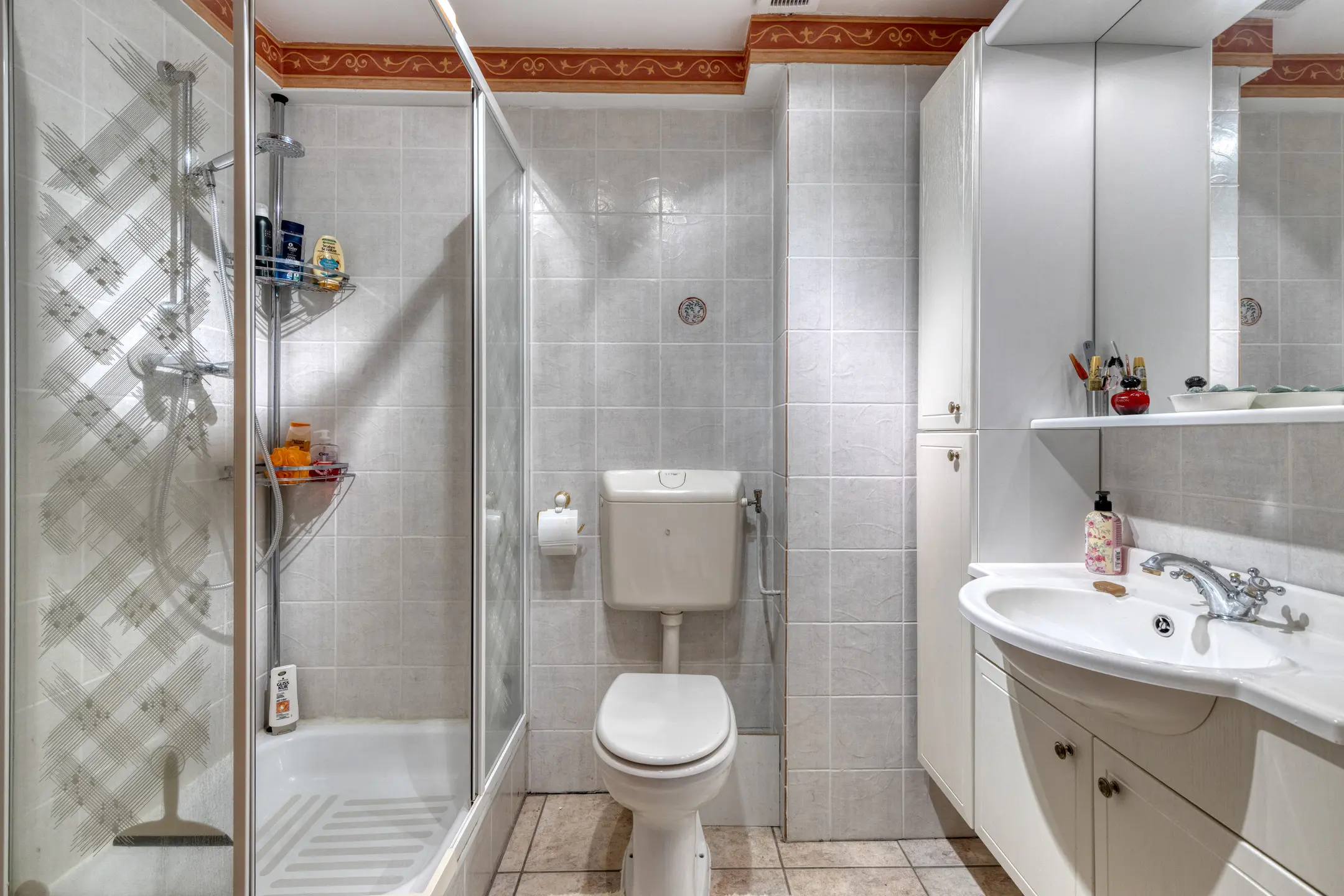 Op de eerste verdieping bevinden zich twee slaapkamers en de badkamer. De volledig betegelde badkamer is praktisch ingedeeld en uitgerust met een douchecabine, een tweede toilet en een wastafelmeubel.