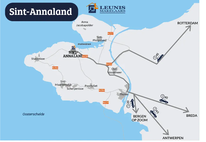 Sint-Annaland is een leuk dorp aan de Oosterschelde met een jachthaven, een uitnodigend zandstrandje en diverse winkelvoorzieningen binnen handbereik. Je kunt genieten van de rust en ruimte van het dorp, terwijl je toch centraal gelegen bent ten opzichte van nabijgelegen steden. Je hebt een goede verbindingsweg naar de A4 (Rotterdam-Antwerpen) en via de Oesterdam richting de A58 naar Goes en Middelburg. De Oosterschelde heeft wisselende getijden en fraaie vergezichten en biedt een schat aan mogelijkheden voor zeilen, duiken en zwemmen.