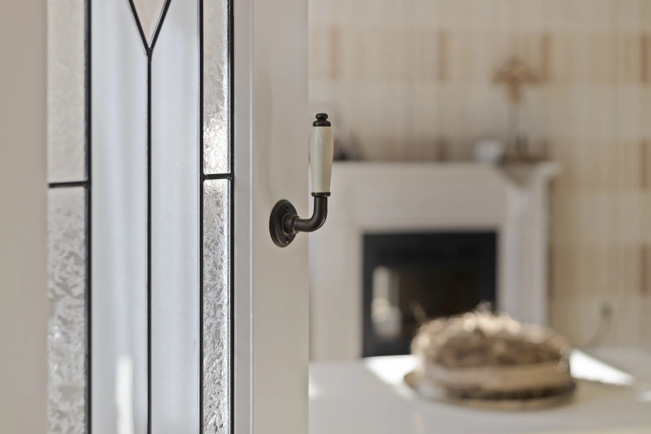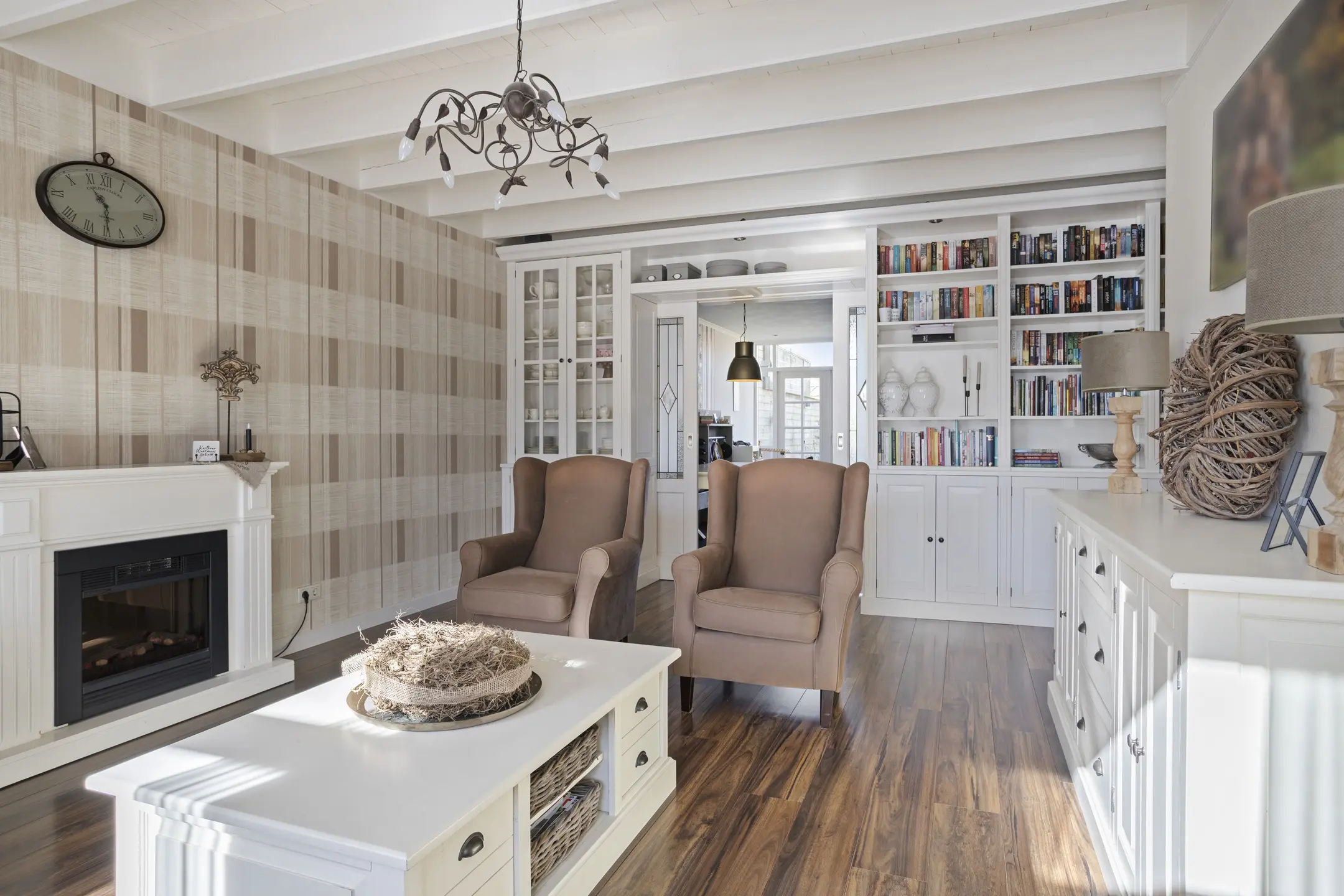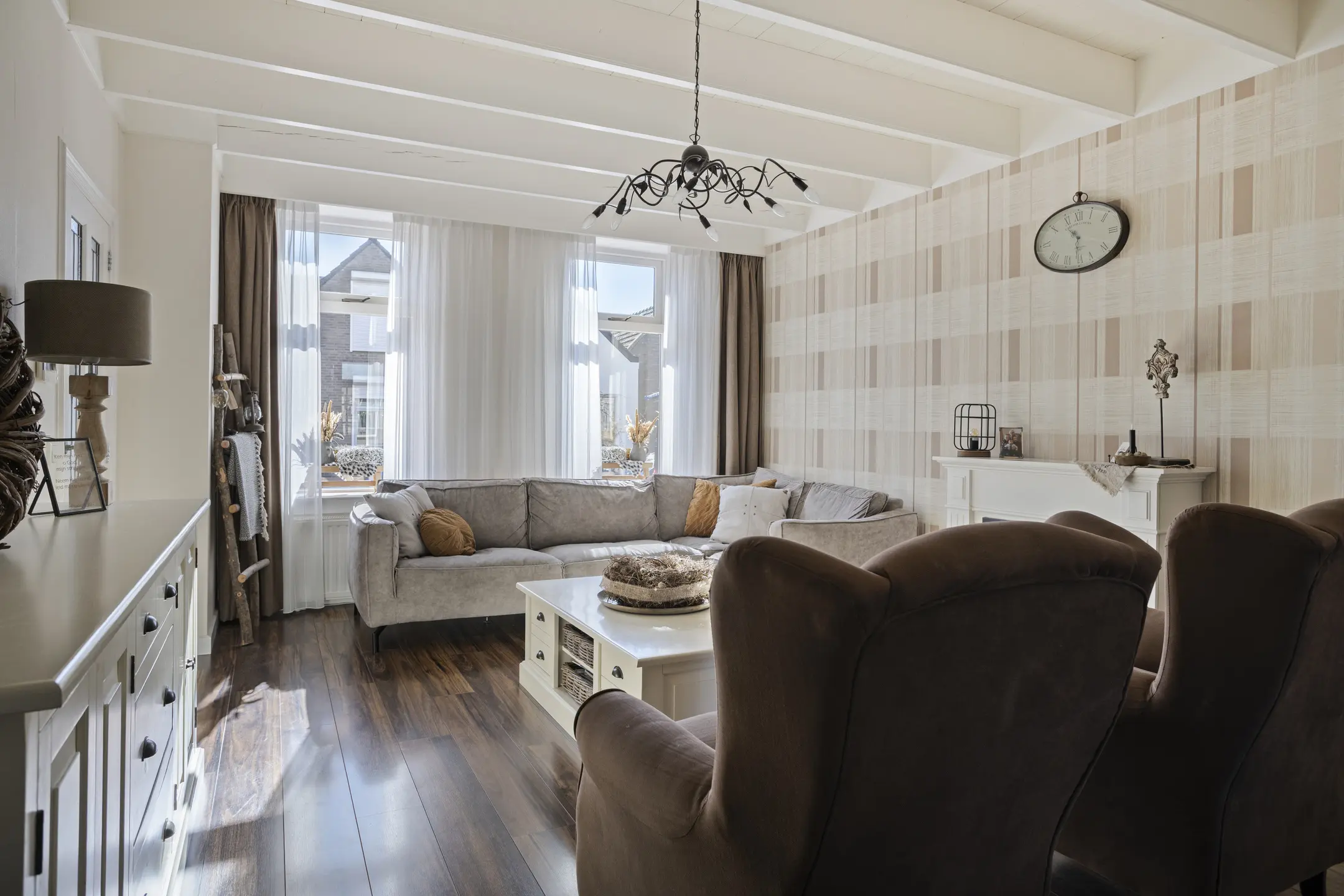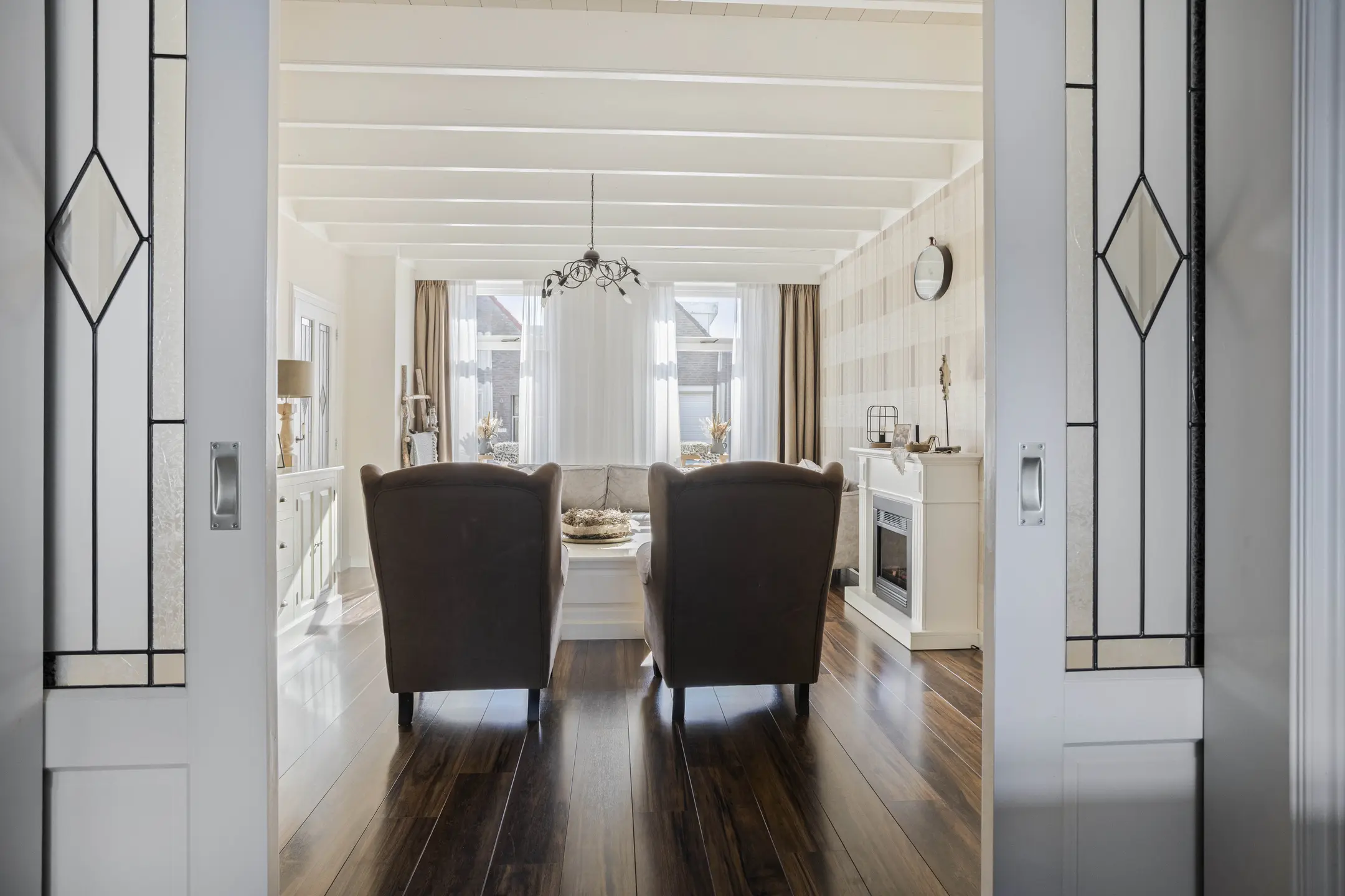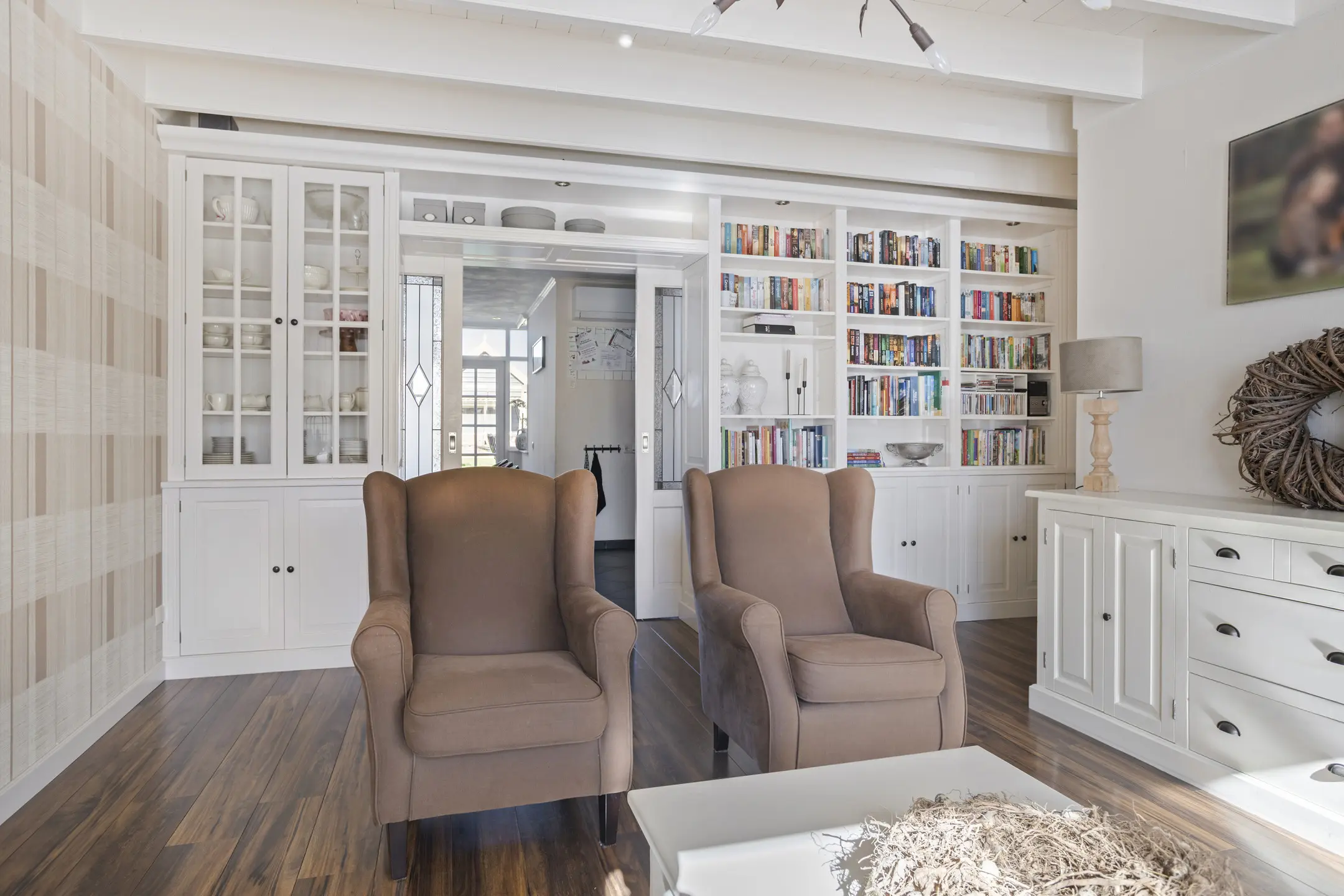 De woonkamer is een sfeervolle en lichte ruimte met een karakteristiek balkenplafond en en suite deuren met stijlvolle boekenkasten aan beide zijden. Aan de voorzijde zijn elektrisch bedienbare rolluiken aanwezig.