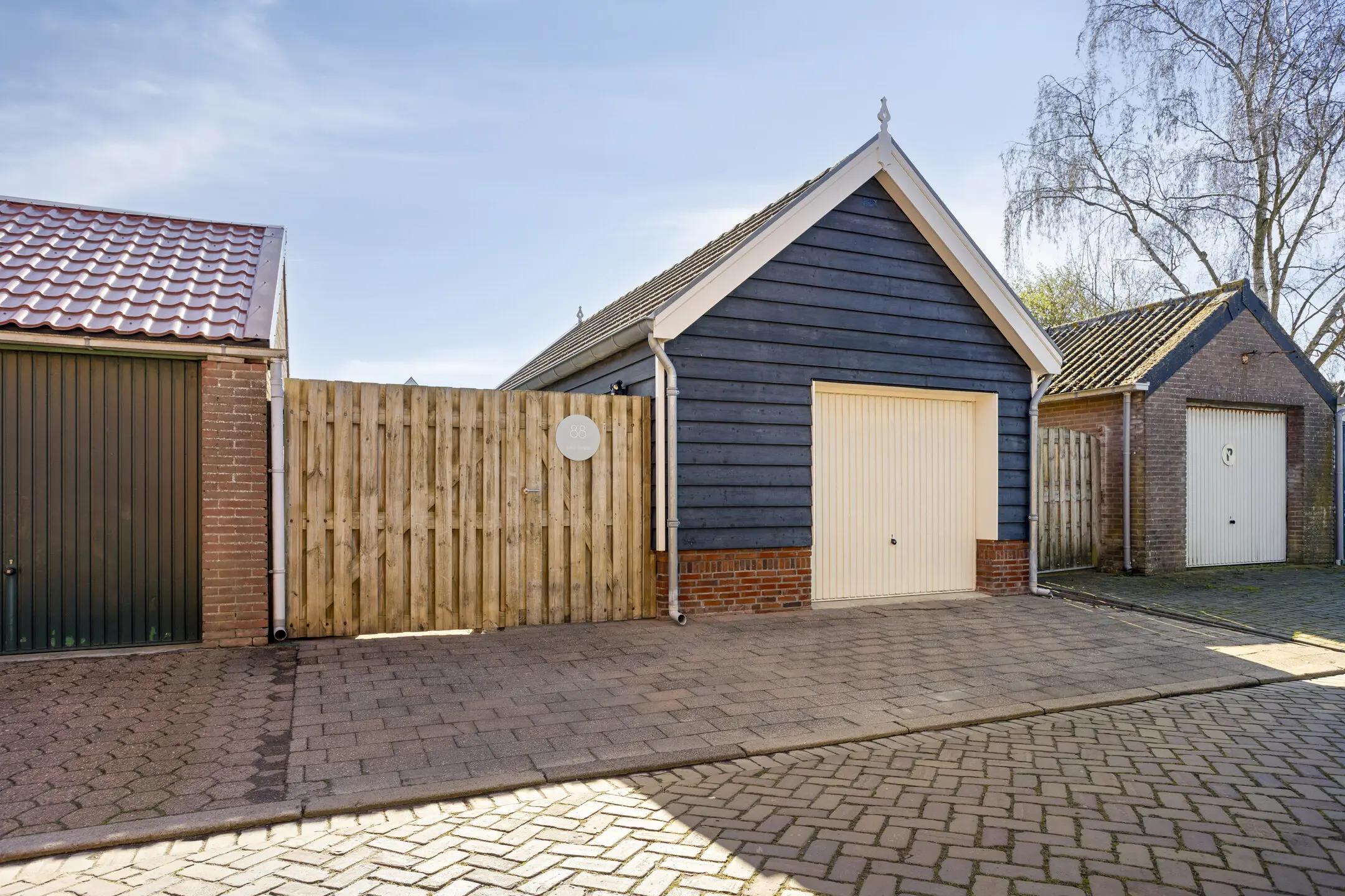 Achterin de tuin bevindt zich de royale, geïsoleerde schuur/garage met overkapping. De garage is voorzien van een aluminium kanteldeur aan de achterzijde en beschikt over een praktische bergzolder. Op het dak liggen 8 zonnepanelen (2023).