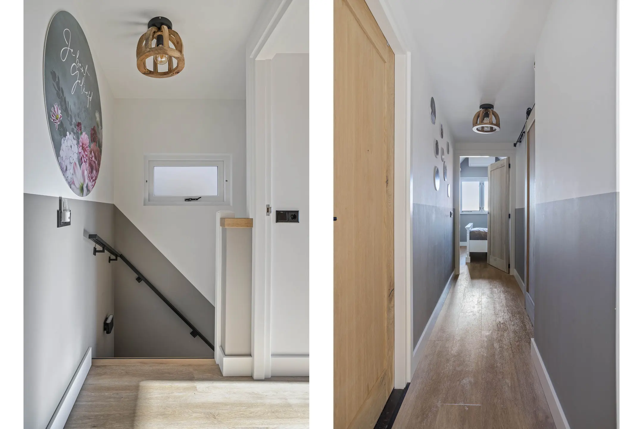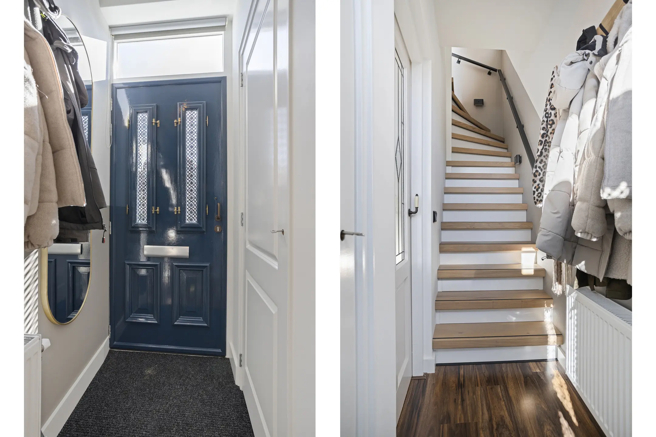 Je komt binnen in een verzorgde hal, waar direct zichtbaar is dat de woning met aandacht is onderhouden. Zo heeft de trap recent nog een make-over gekregen. In de hal bevindt zich tevens de meterkast.