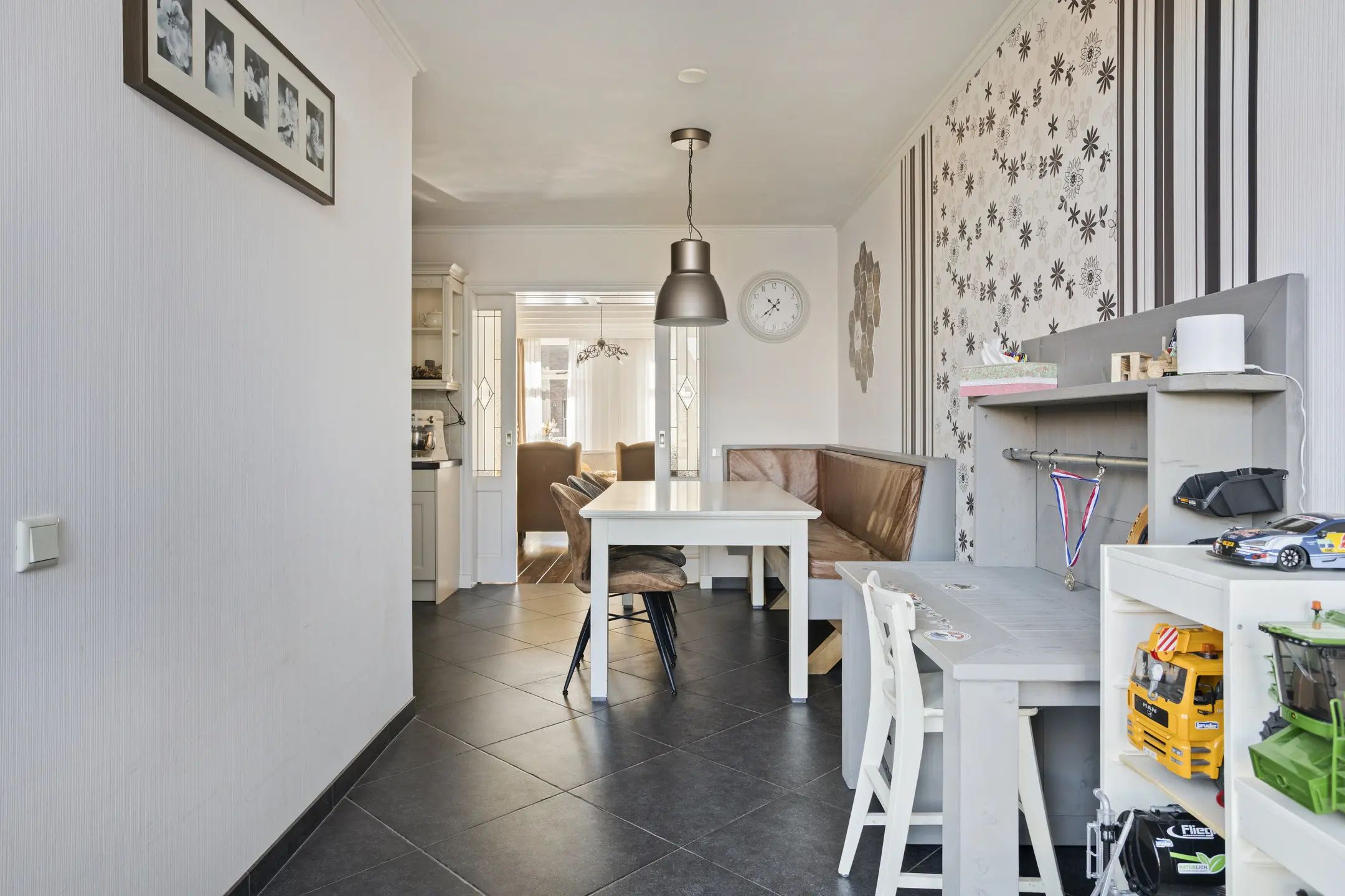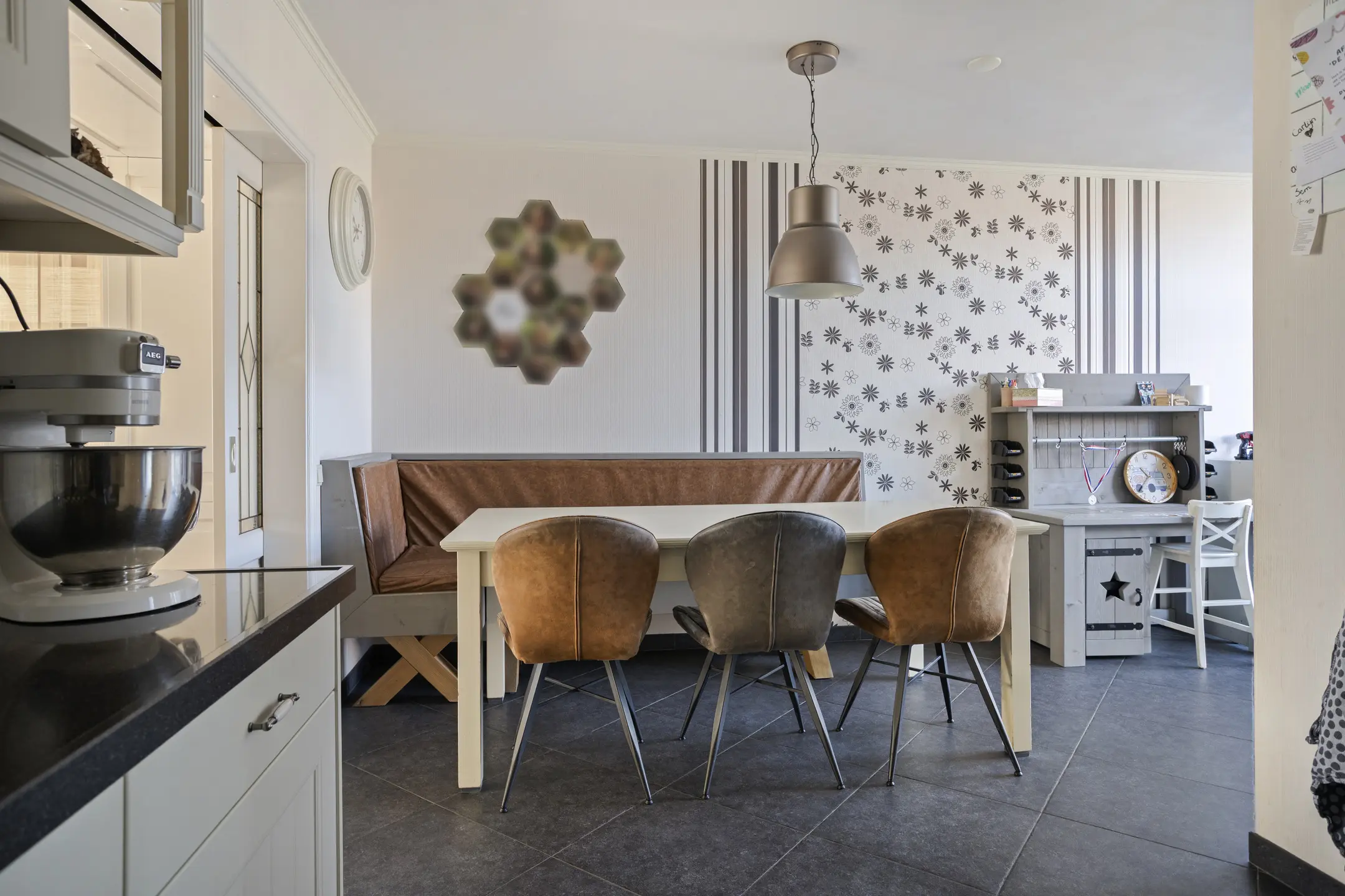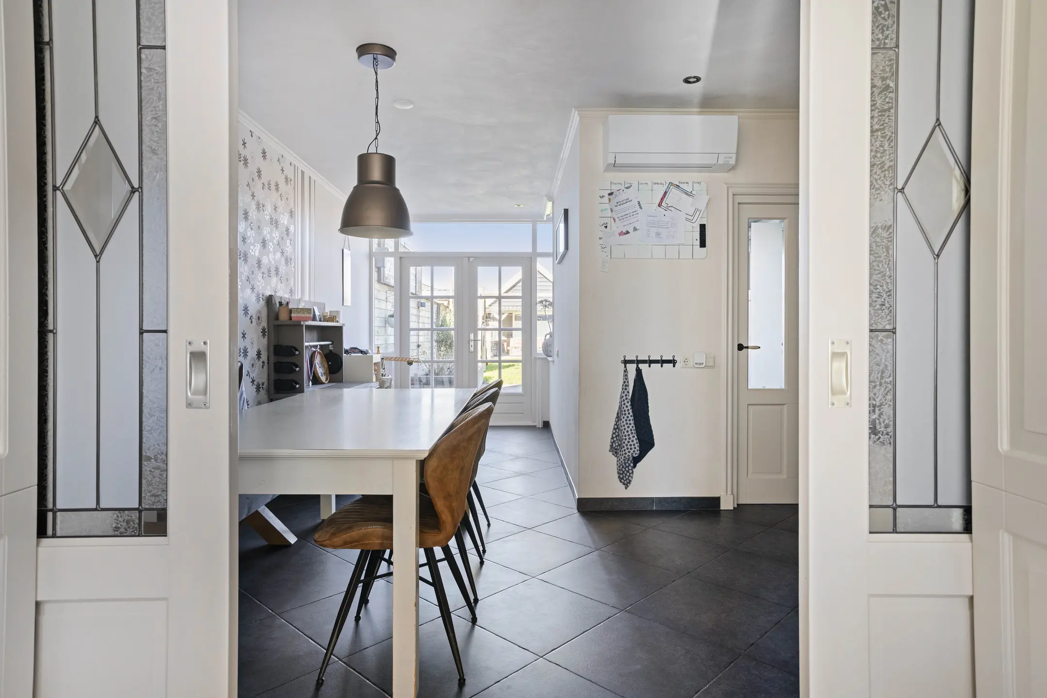 Dankzij de uitbouw is er een ruime woonkeuken ontstaan met voldoende plek voor een gezellige eethoek. Via de openslaande tuindeuren stap je zo de tuin in. De aanwezige airco (2023) zorgt hier voor een aangenaam binnenklimaat, zowel in de zomer als in de winter.