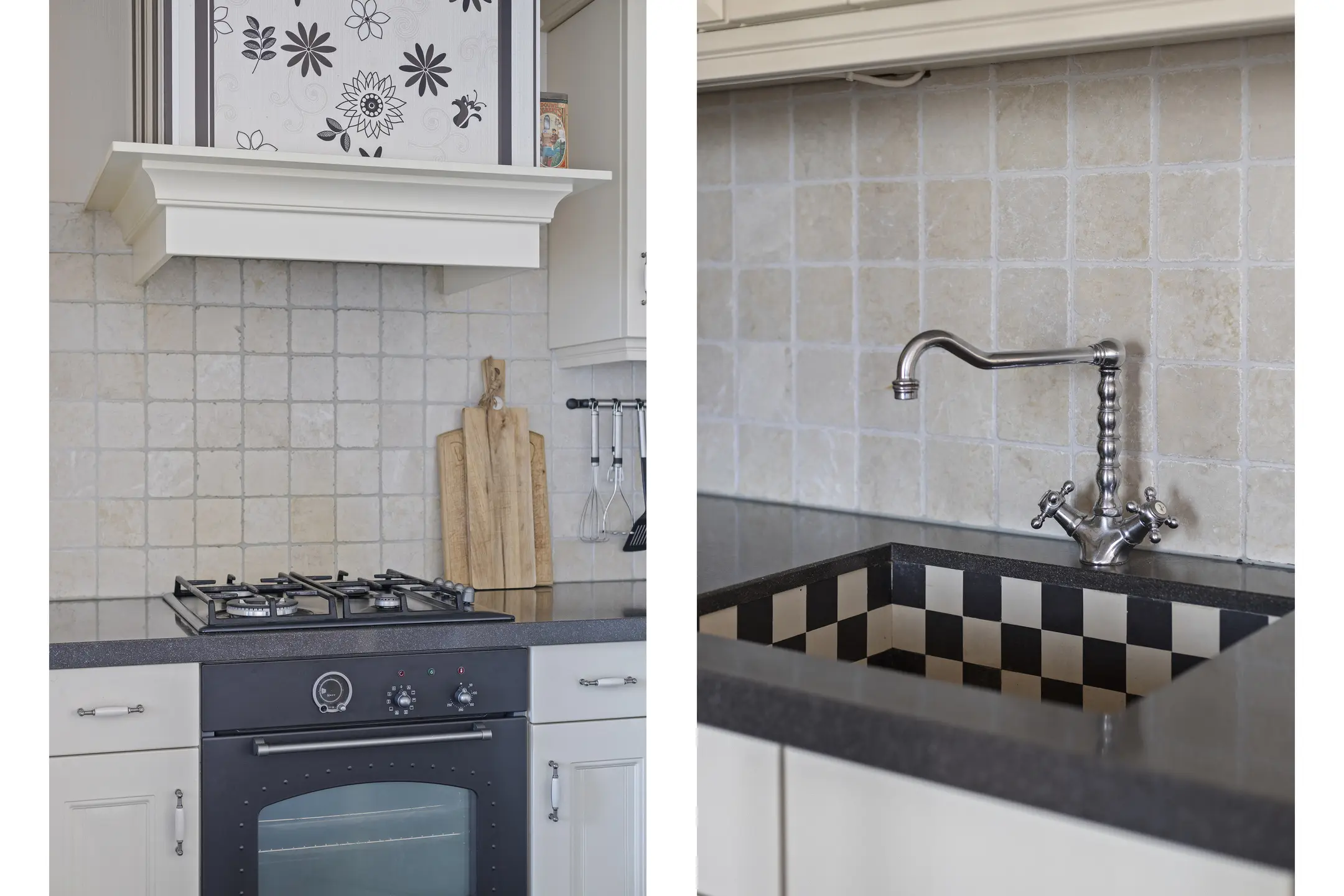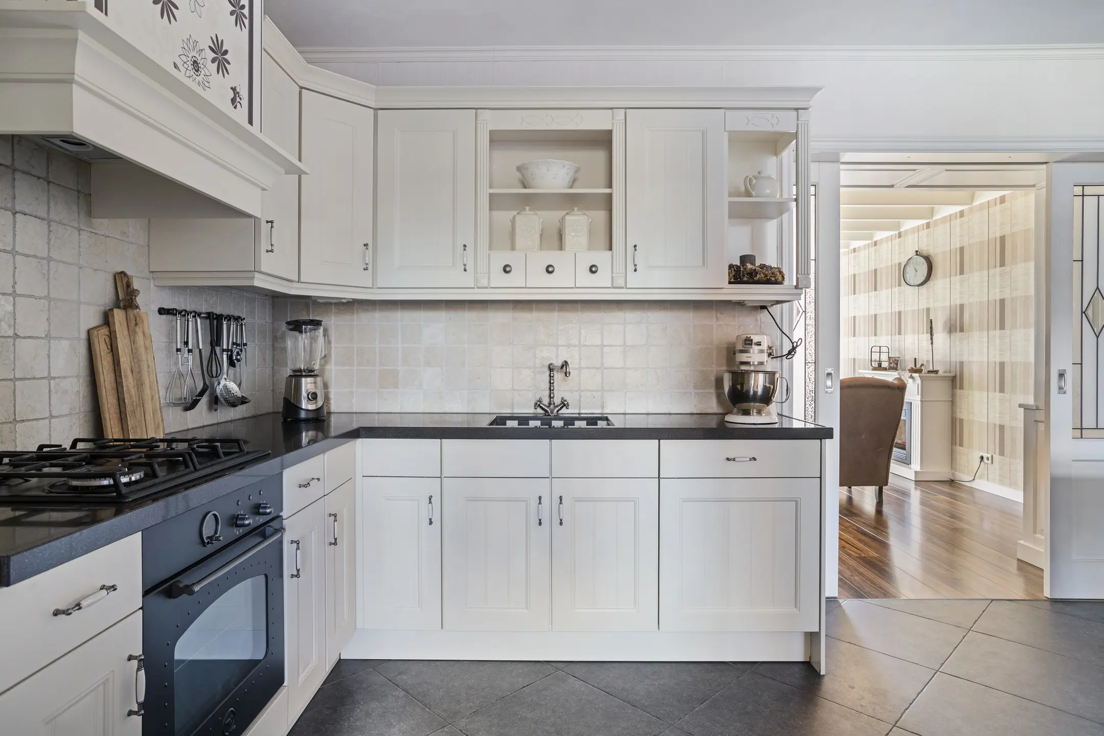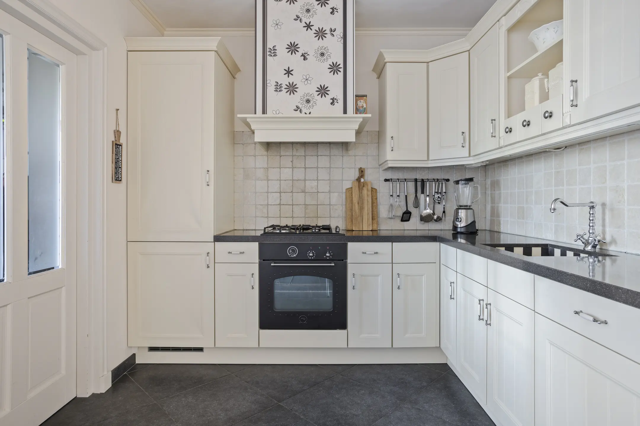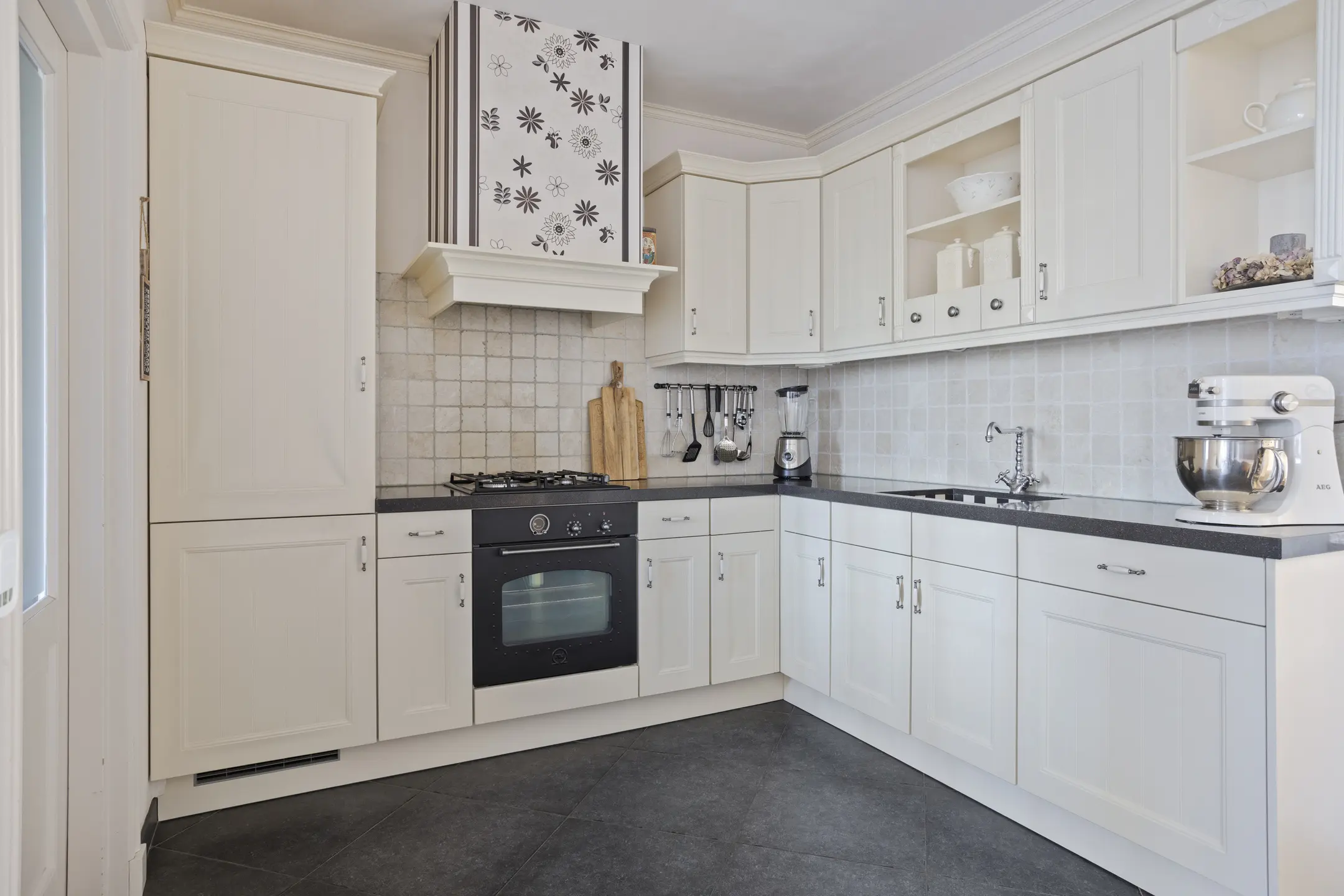 De woonkamer en keuken staan in open verbinding, maar kunnen dankzij de en suite deuren ook van elkaar gescheiden worden. De keuken is opgesteld in een hoekopstelling en voorzien van diverse inbouwapparatuur, waaronder een koel-vriescombinatie, oven, 4-pits gasfornuis, afzuigkap, vaatwasser (2025) en een granieten aanrechtblad.