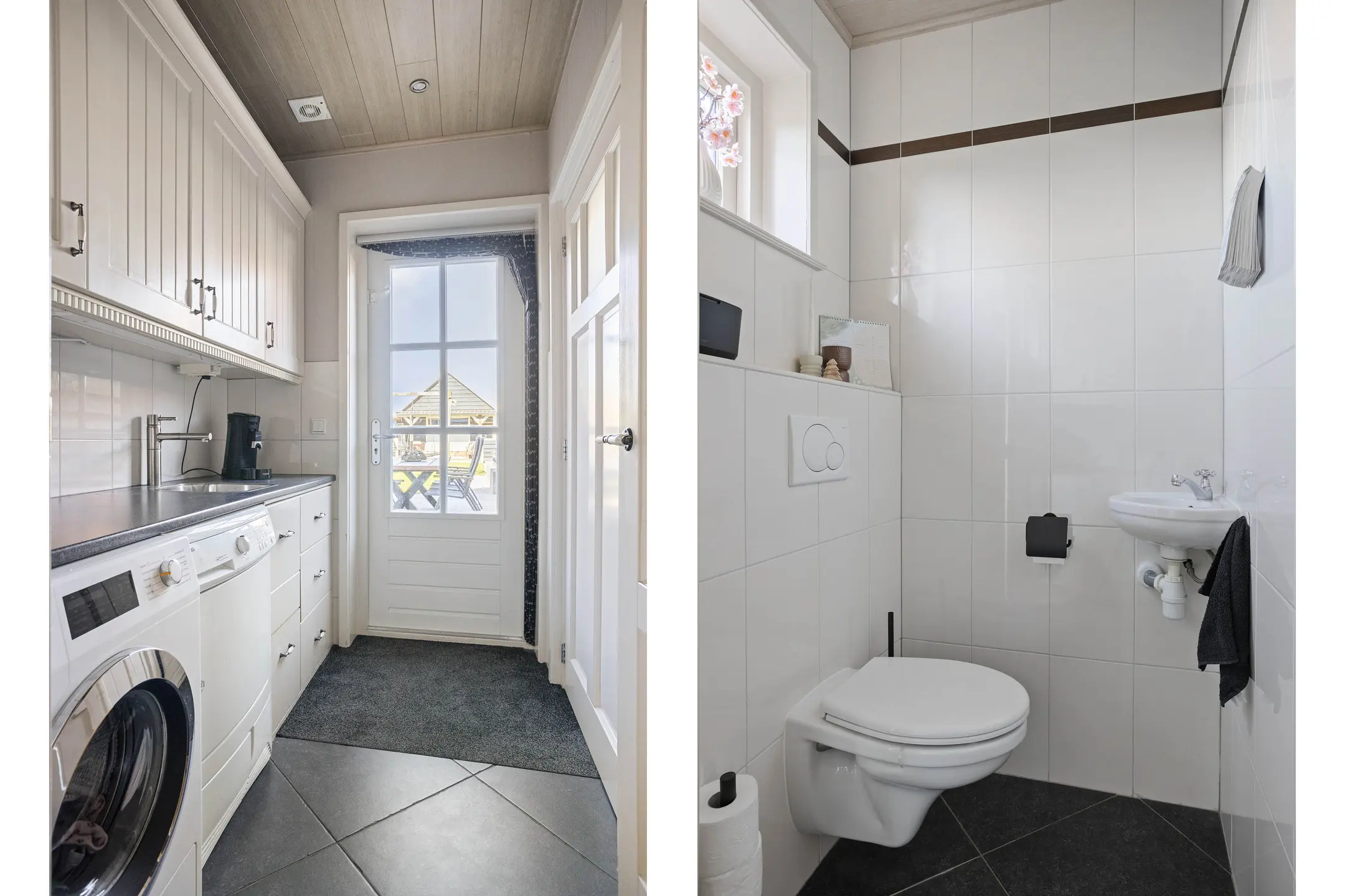 De plavuizenvloer met vloerverwarming loopt door naar de bijkeuken en het toilet. De bijkeuken is praktisch ingericht met een keukenblok waarin de wasmachine en droger zijn verwerkt. Hier bevinden zich ook de cv-ketel (2009), het moderne hangtoilet en de toegang tot de tuin.