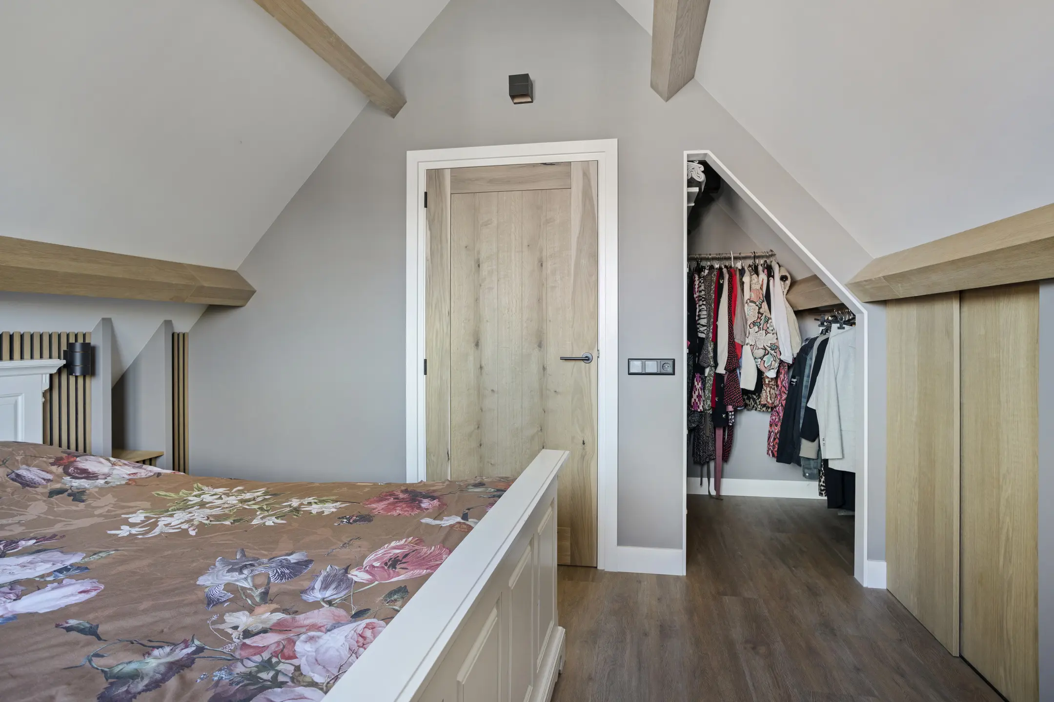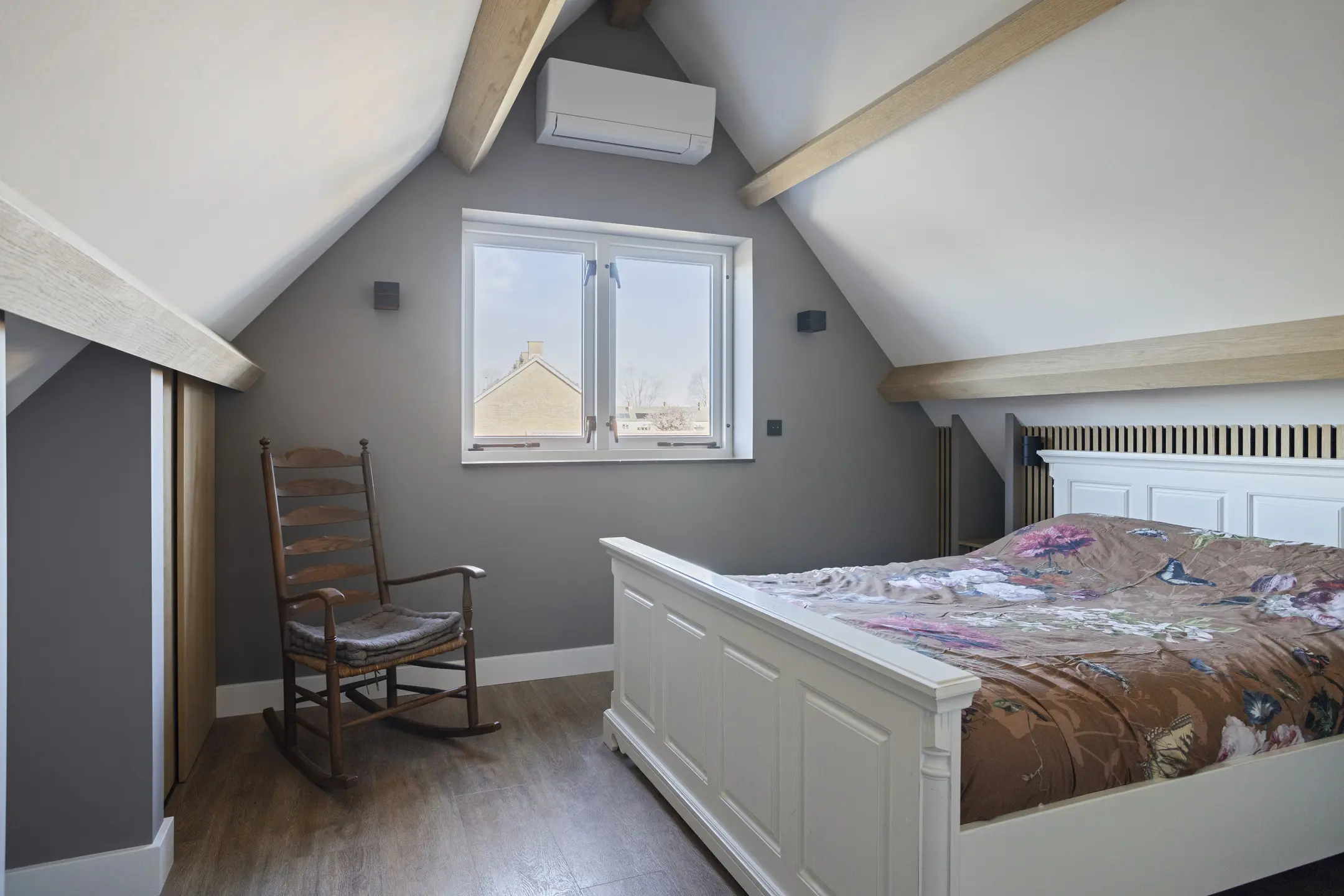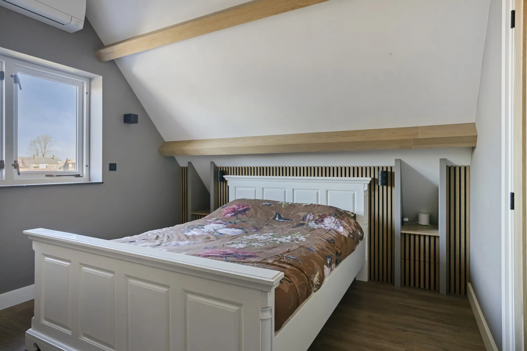 De ruime hoofdslaapkamer aan de achterzijde is sfeervol afgewerkt met zichtbare balken, beschikt over een walk-in closet, airco (2023) en een elektrisch bedienbaar rolluik.