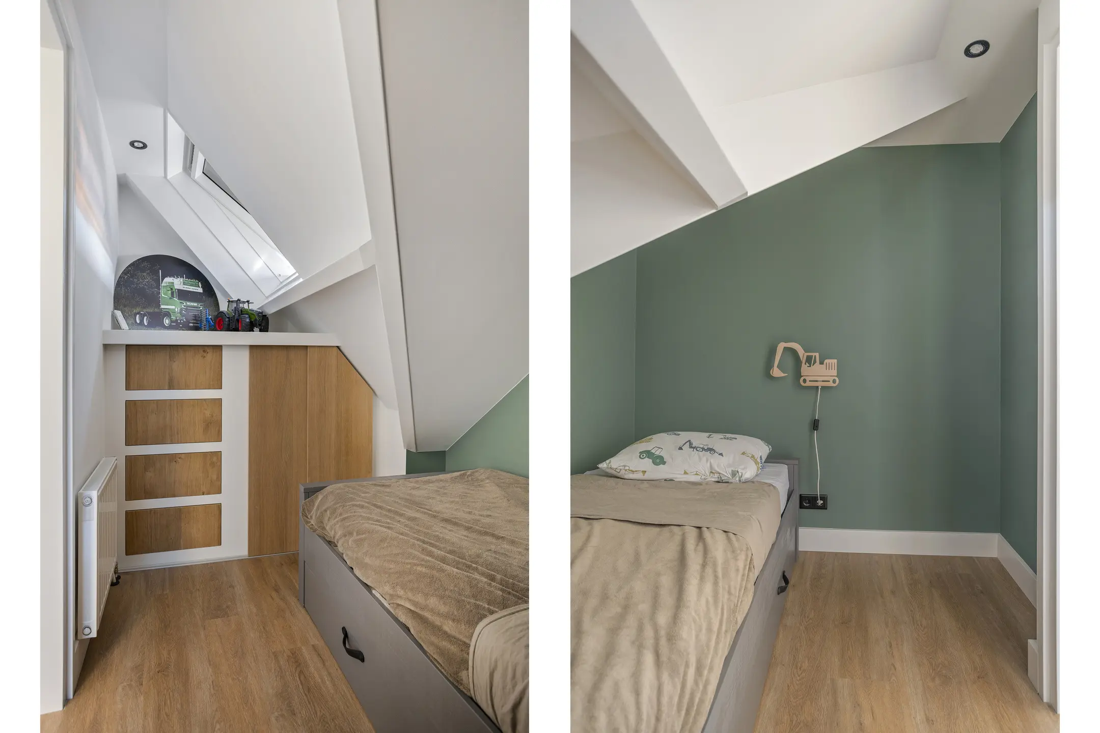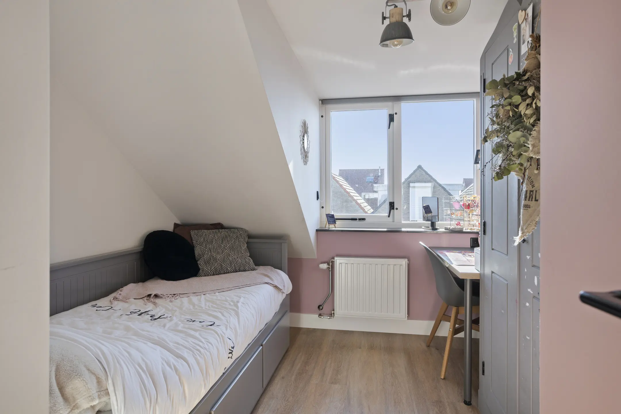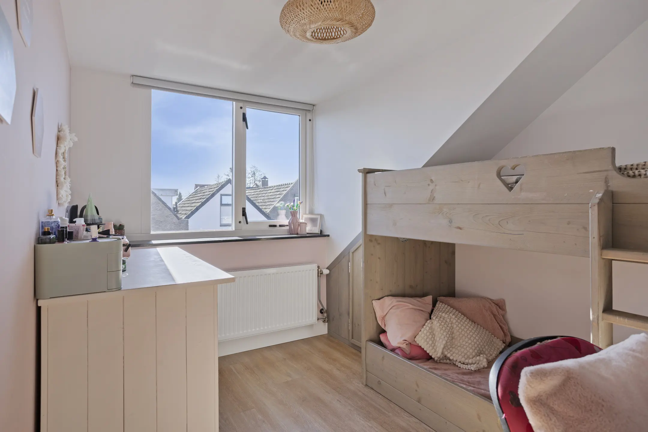 Aan de voorzijde bevinden zich twee lichte slaapkamers dankzij de dakkapel, beide voorzien van een screen. Eén van deze kamers beschikt bovendien over een vaste kast. De vierde slaapkamer is compacter, maar praktisch ingedeeld met vaste kastruimte en een dakraam.