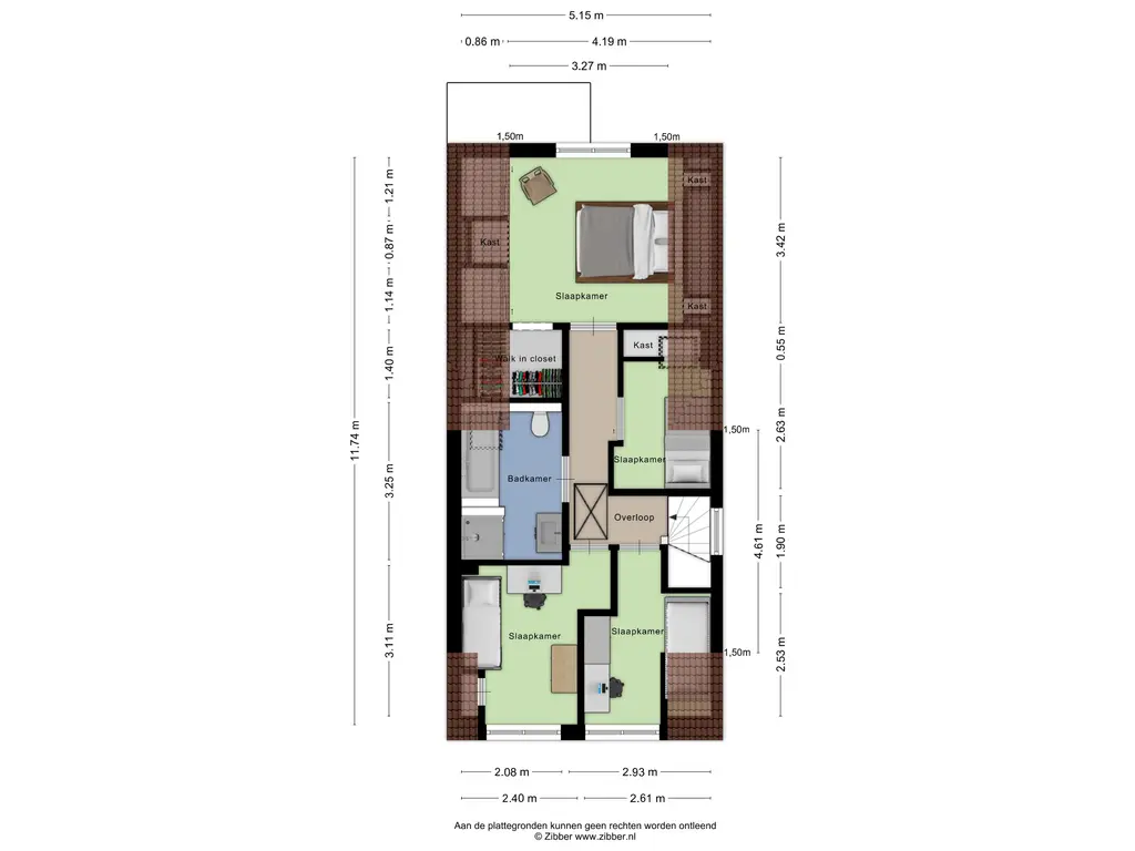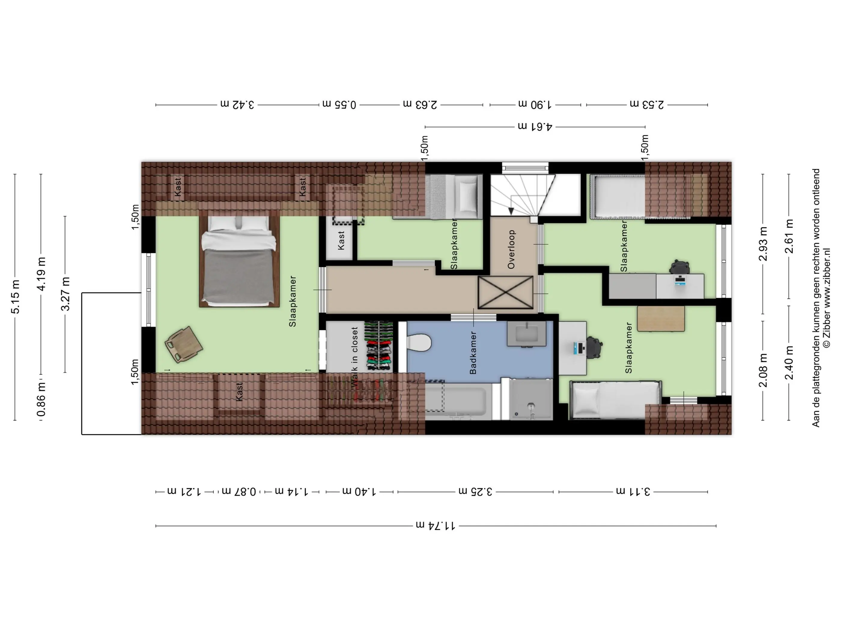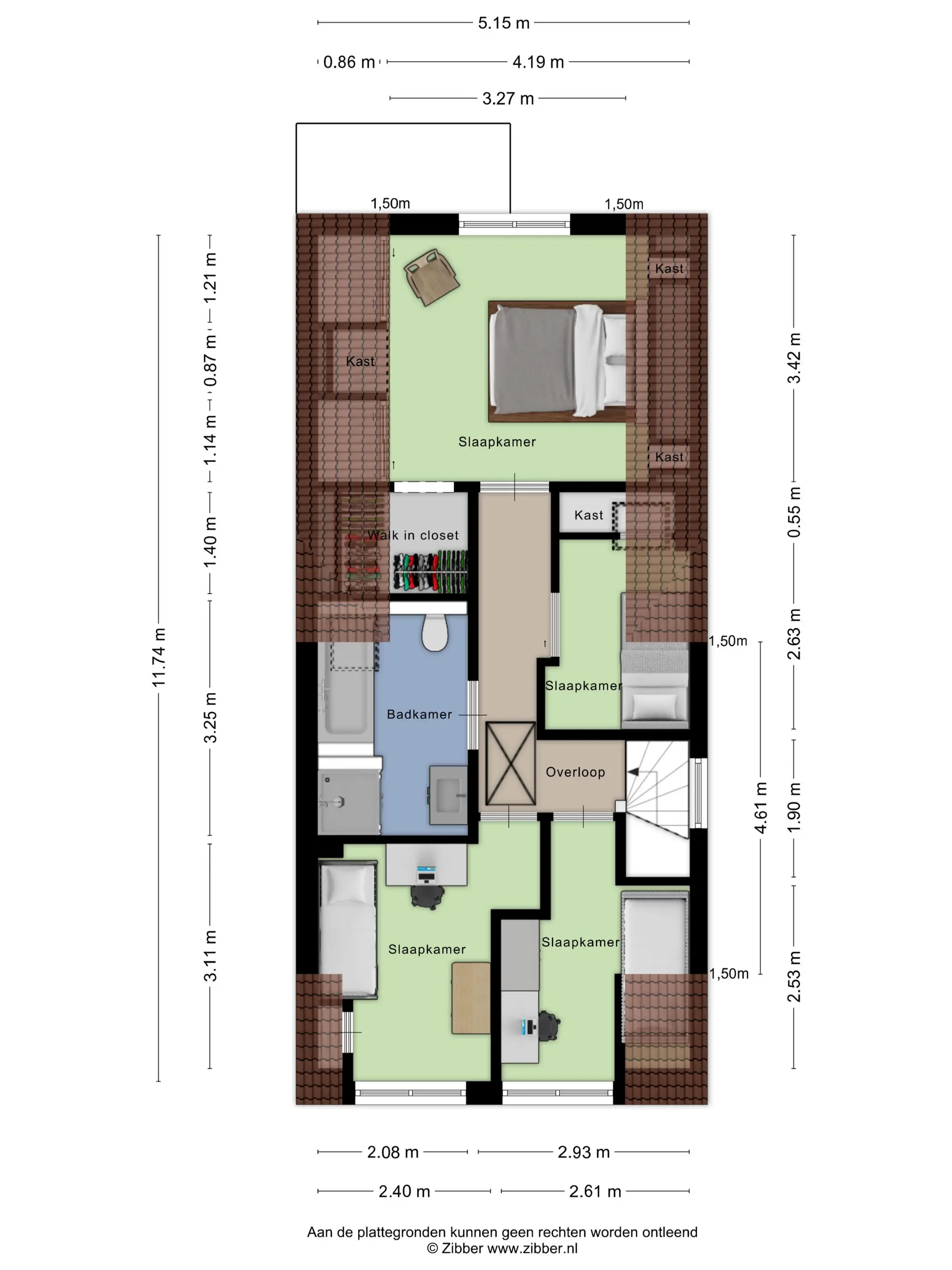 Aan de voorzijde bevinden zich twee lichte slaapkamers dankzij de dakkapel, beide voorzien van een screen. Eén van deze kamers beschikt bovendien over een vaste kast. De vierde slaapkamer is compacter, maar praktisch ingedeeld met vaste kastruimte en een dakraam.