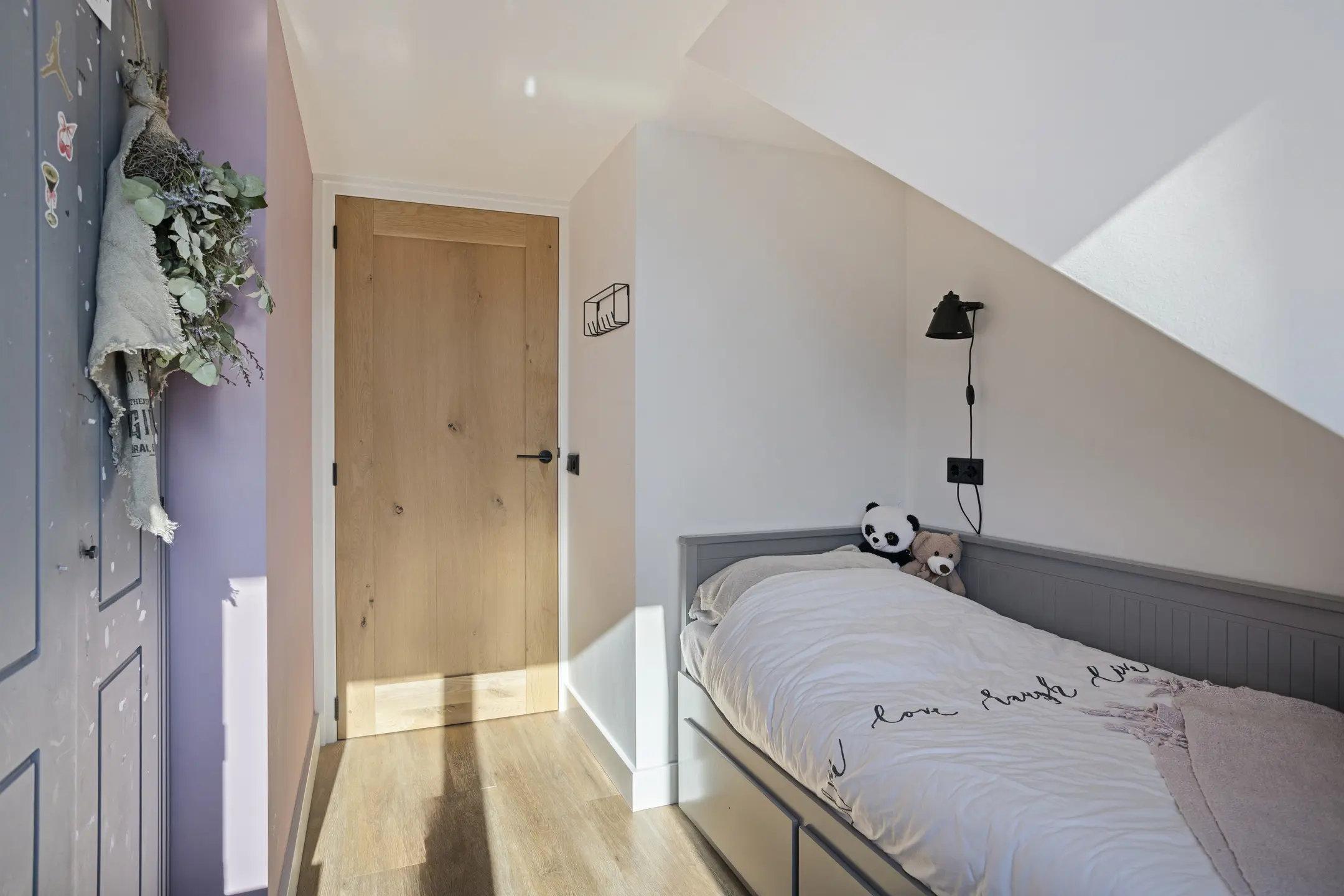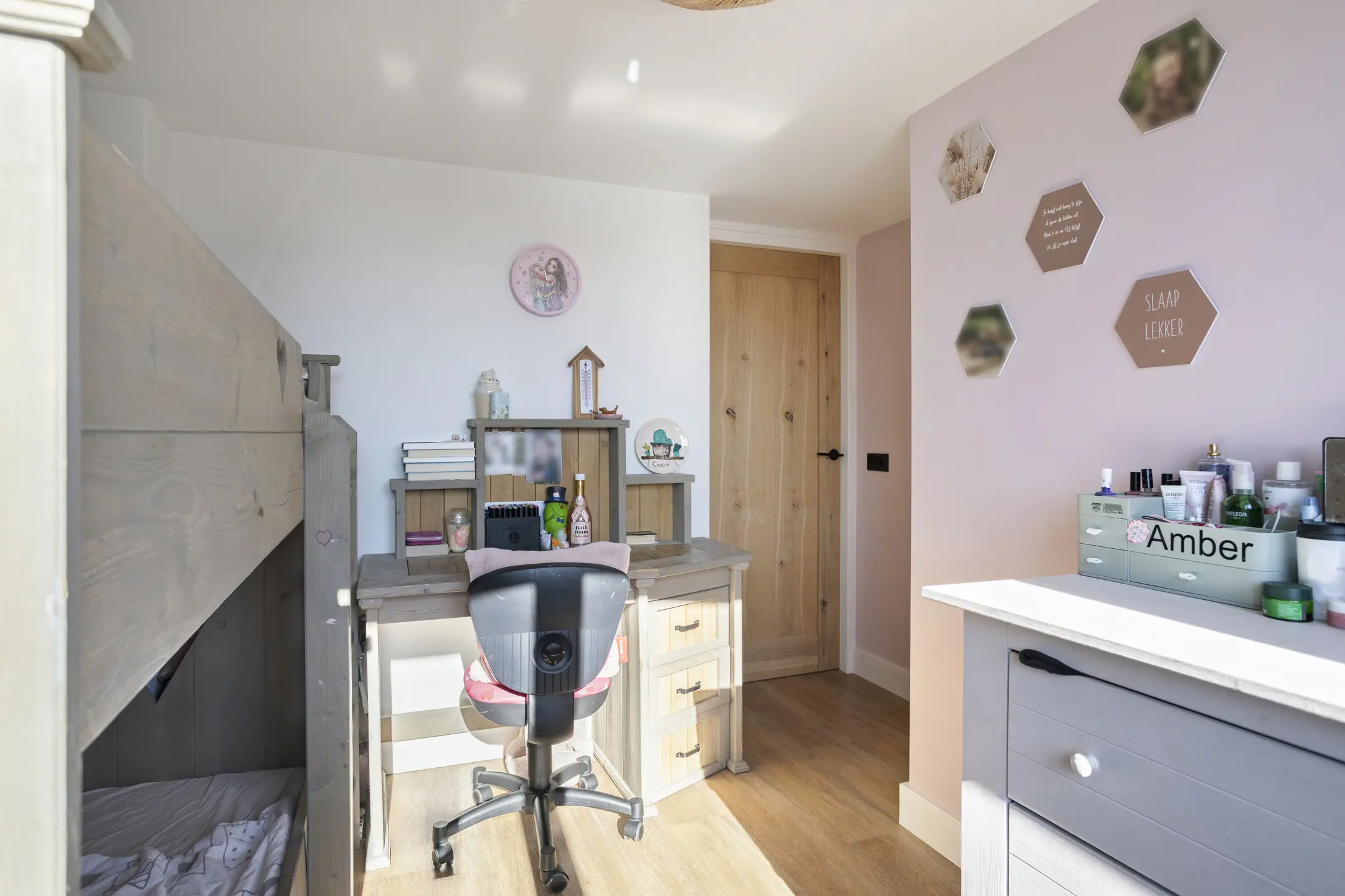 Ook de eerste verdieping is netjes strak afgewerkt en gemoderniseerd. Dankzij de uitbouw zijn hier maar liefst vier slaapkamers gerealiseerd, allen voorzien van een pvc-vloer en fraaie eikenhouten deuren.