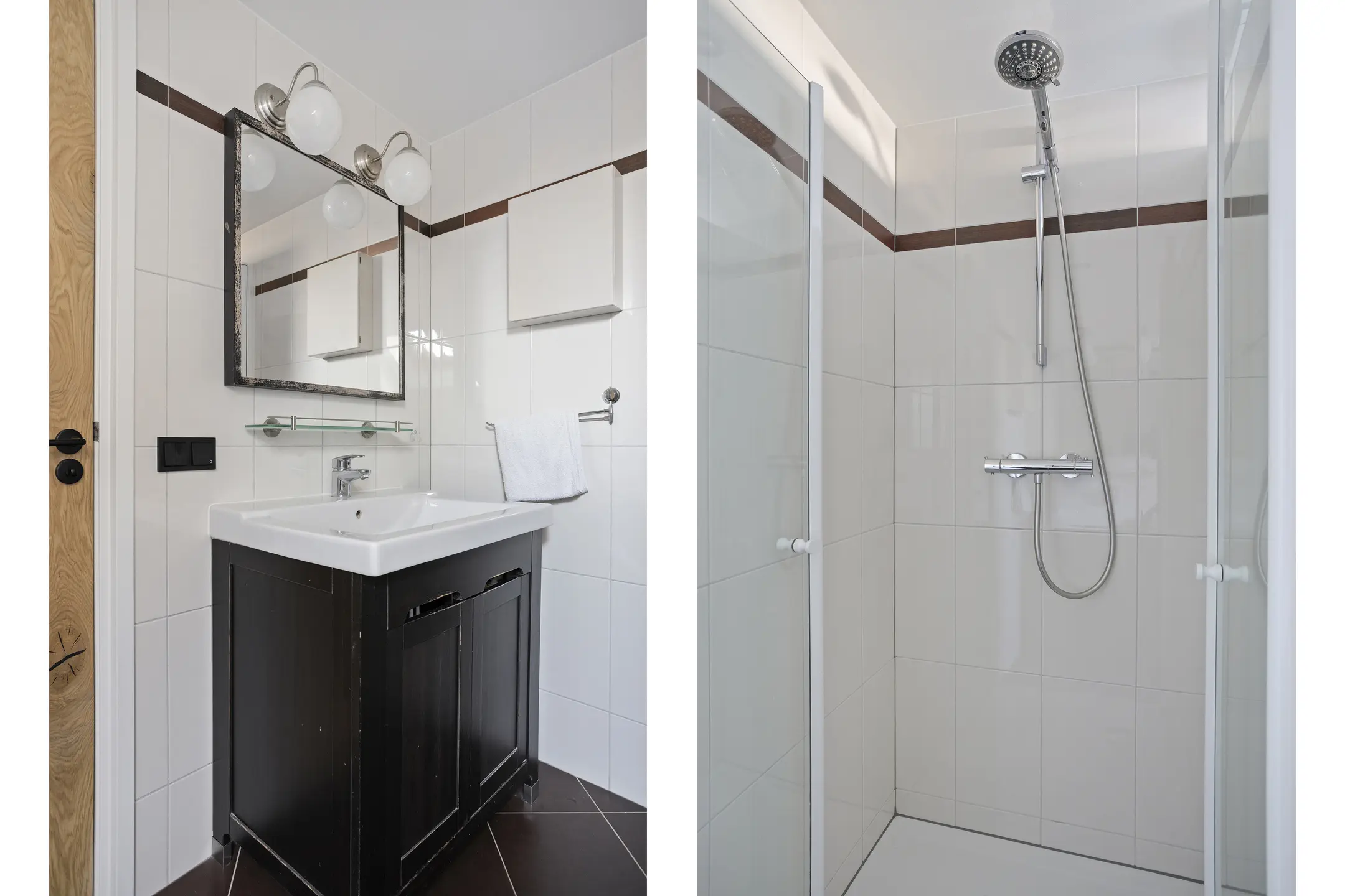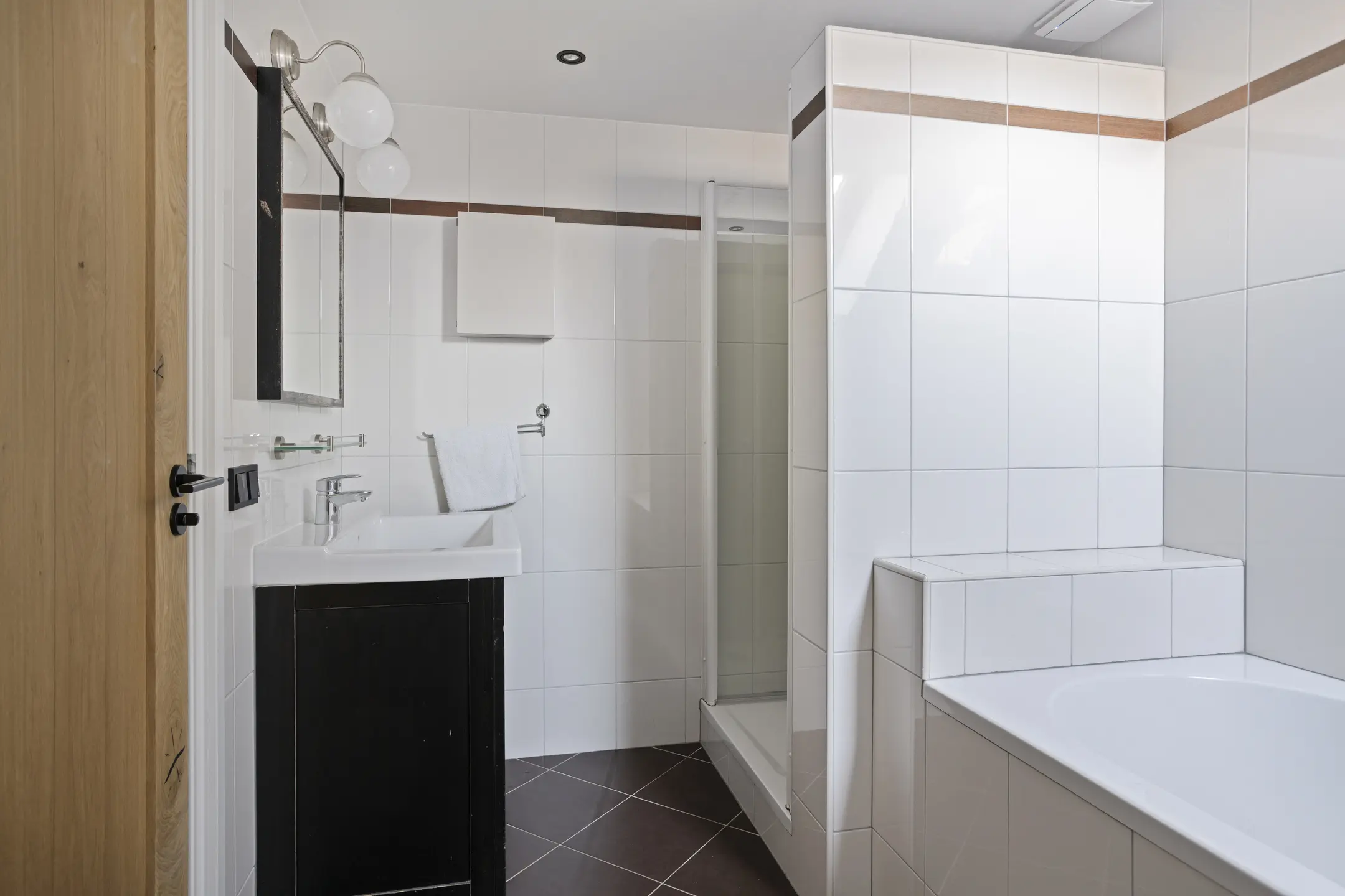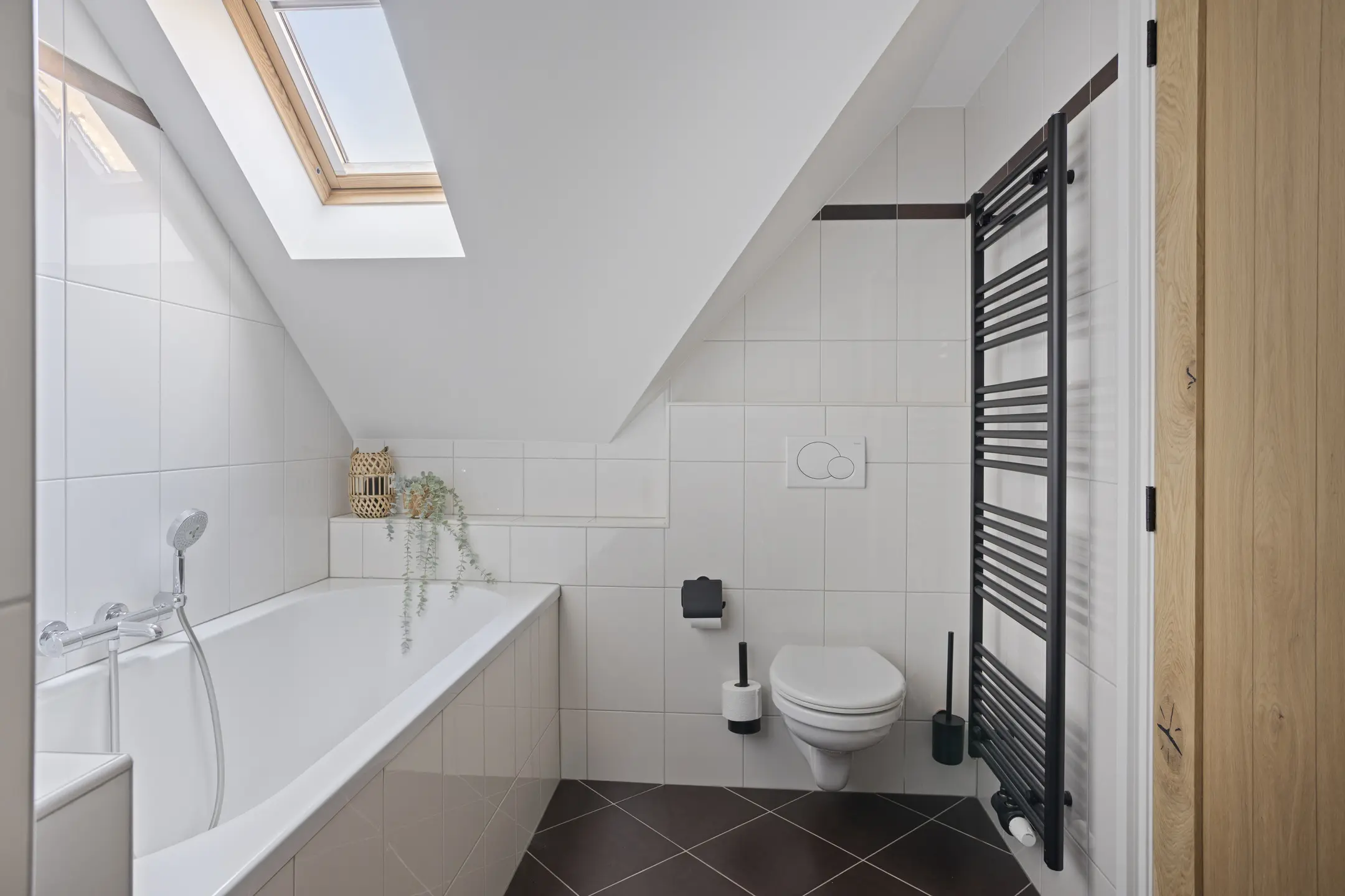 De badkamer is verzorgd en compleet uitgevoerd met een ligbad, douchecabine, hangtoilet en een wastafelmeubel. Het dakraam zorgt voor een prettige lichtinval.
