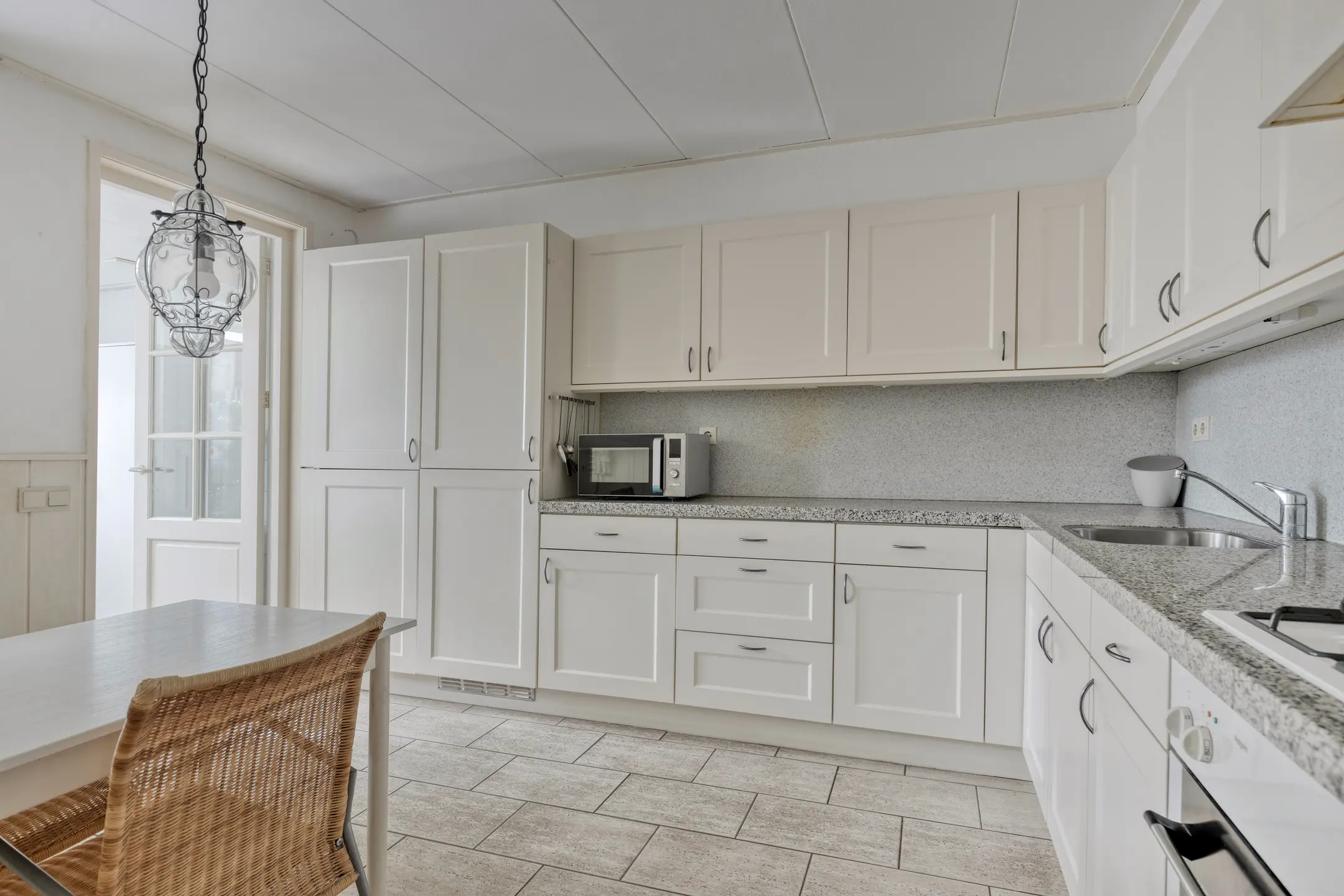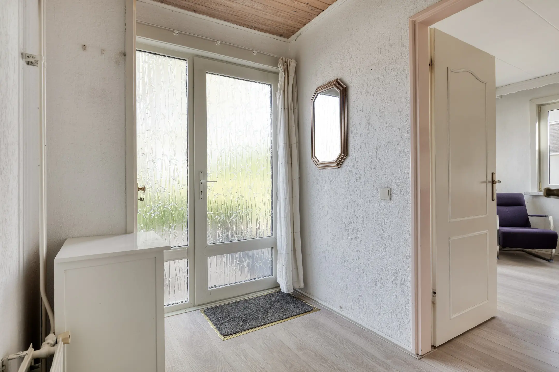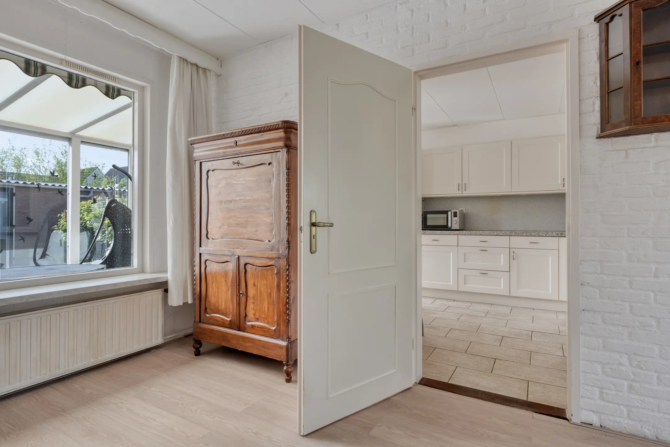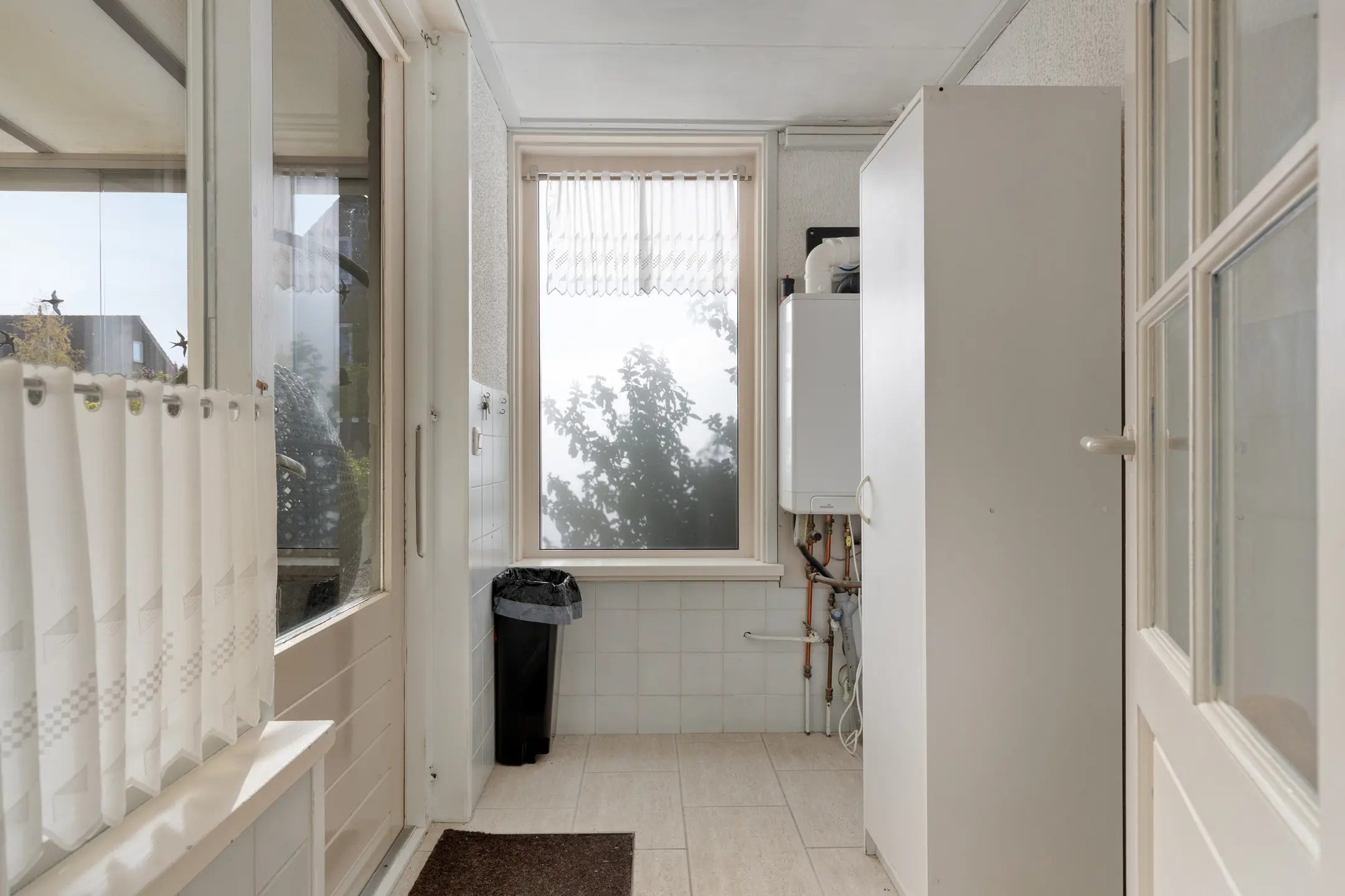 De doorzonwoonkamer is een fijne leefruimte met veel lichtinval en een prettig zicht aan de voorzijde over de groenstrook, wat direct zorgt voor extra privacy. De woonkamer is voorzien van rolluiken en een handige vaste voorraadkast. Aan de achterzijde bevindt zich de woonkeuken. Deze biedt voldoende ruimte en is ideaal voor een kleine eethoek. De eenvoudige keuken is in een hoekopstelling geplaatst en uitgerust met een 4-pits gasfornuis, afzuigkap, oven, koelkast en vriezer. Aansluitend vind je de praktische bijkeuken, met aansluitingen voor de wasmachine, de CV-ketel (2021) en een deur naar de tuin.
