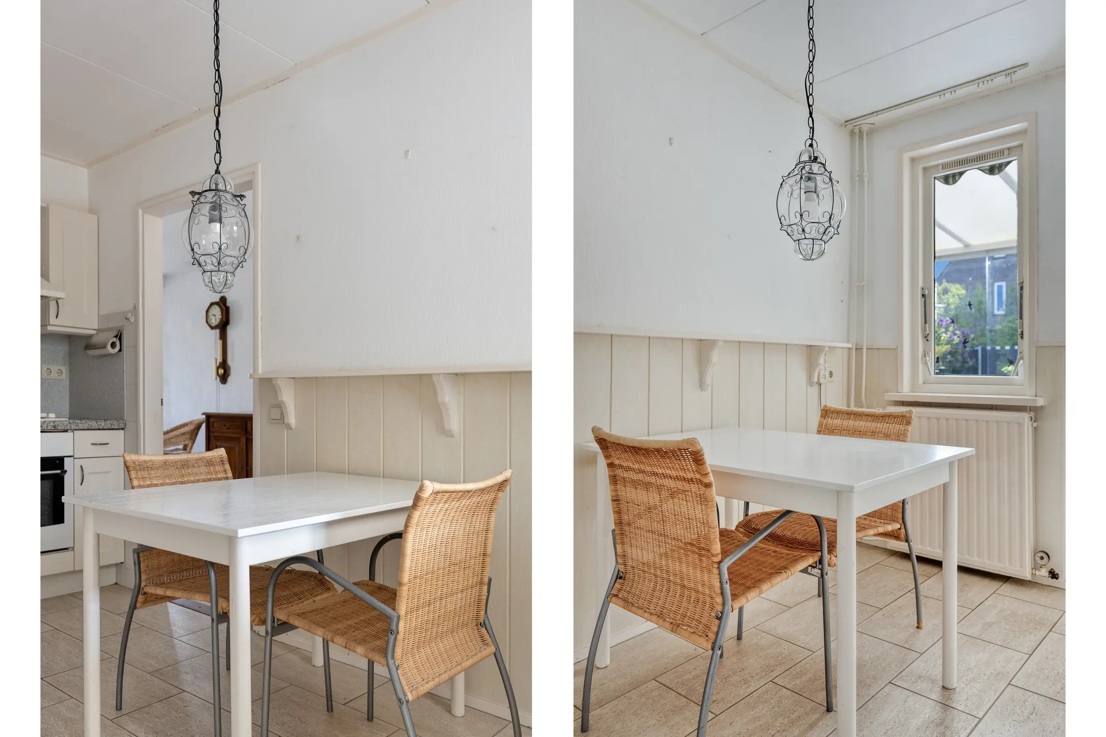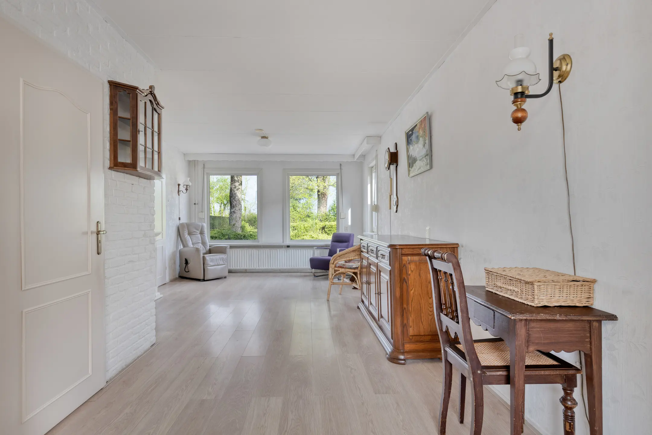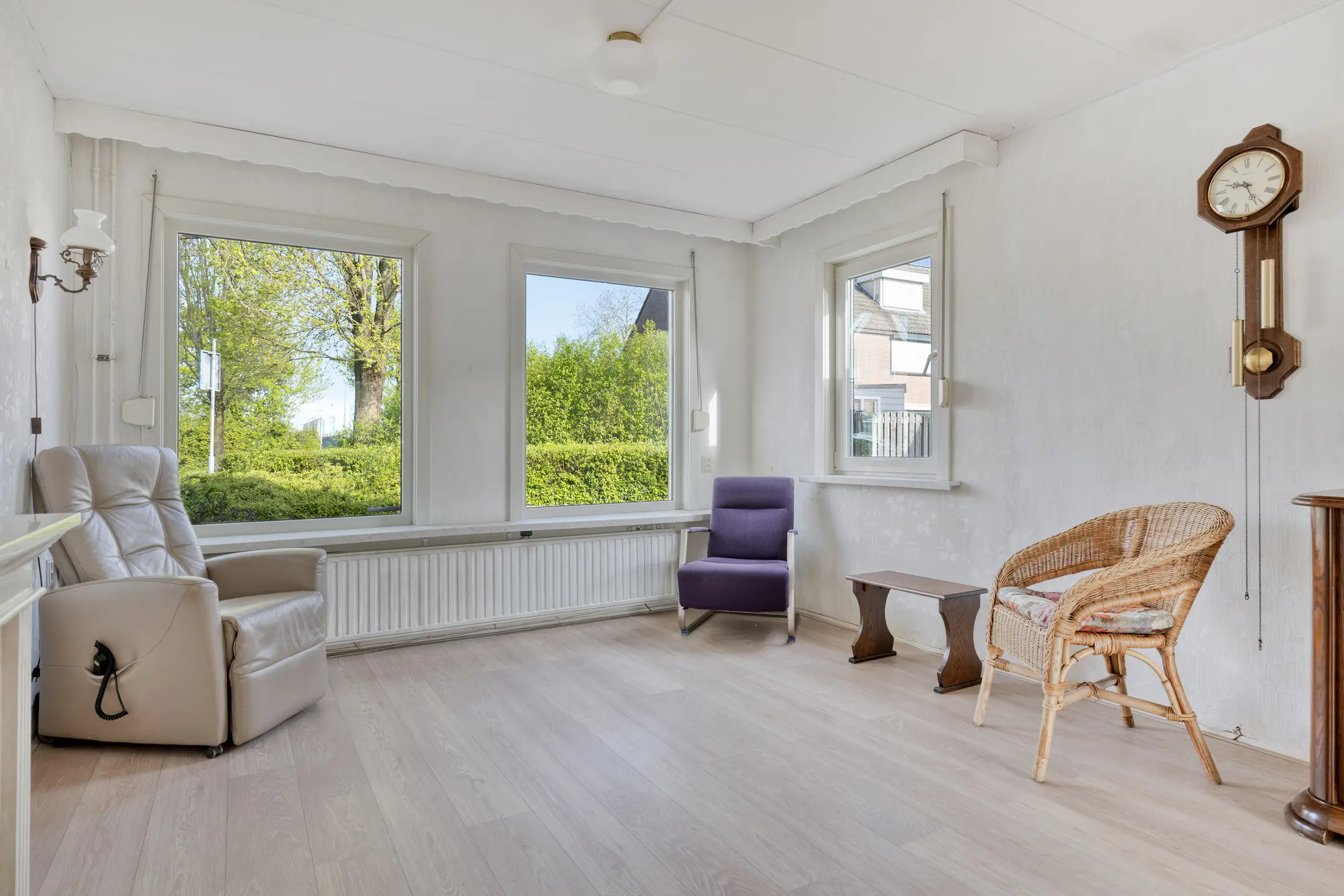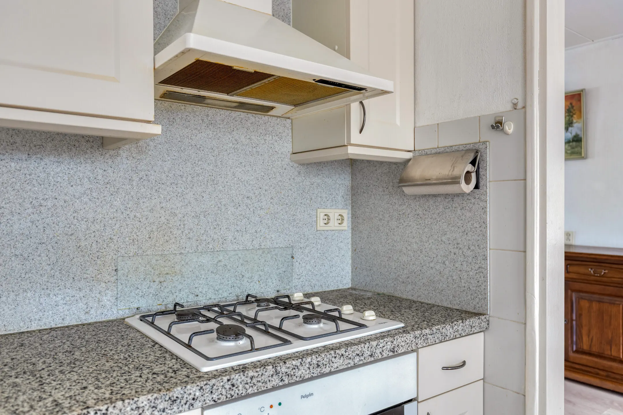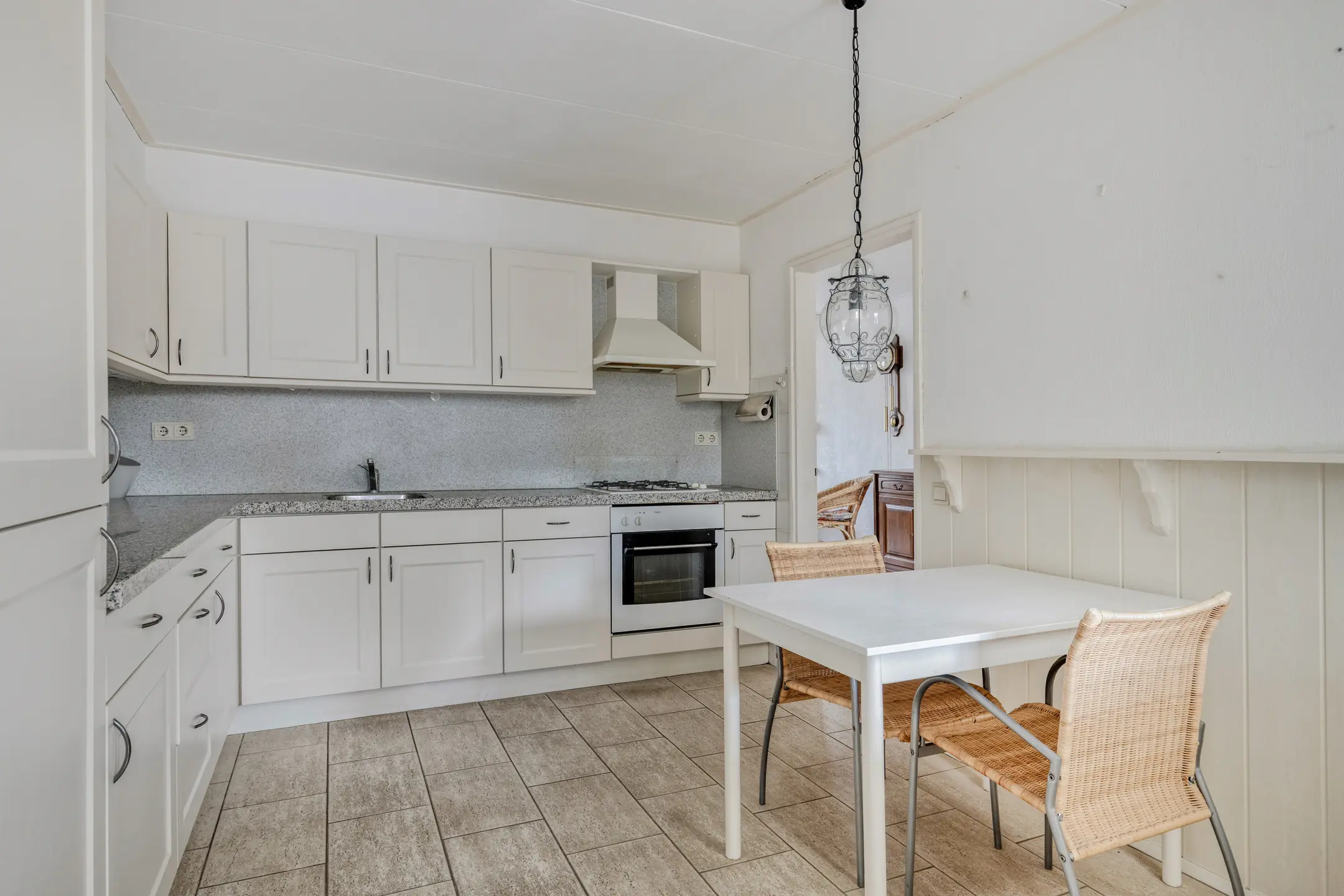 De doorzonwoonkamer is een fijne leefruimte met veel lichtinval en een prettig zicht aan de voorzijde over de groenstrook, wat direct zorgt voor extra privacy. De woonkamer is voorzien van rolluiken en een handige vaste voorraadkast. Aan de achterzijde bevindt zich de woonkeuken. Deze biedt voldoende ruimte en is ideaal voor een kleine eethoek. De eenvoudige keuken is in een hoekopstelling geplaatst en uitgerust met een 4-pits gasfornuis, afzuigkap, oven, koelkast en vriezer. Aansluitend vind je de praktische bijkeuken, met aansluitingen voor de wasmachine, de CV-ketel (2021) en een deur naar de tuin.