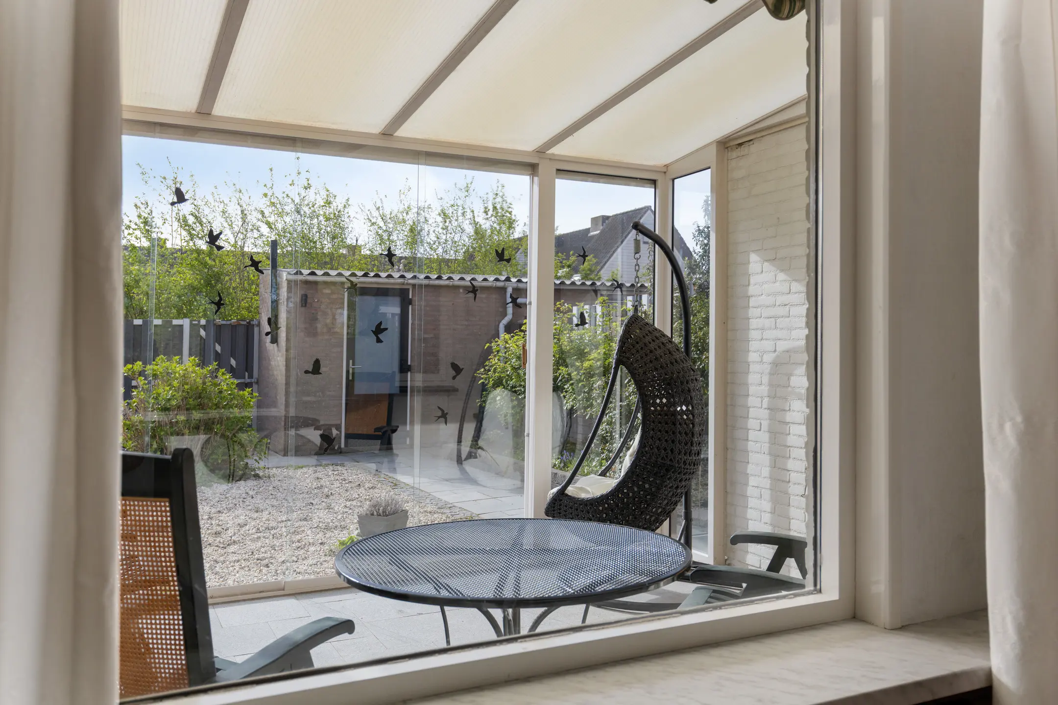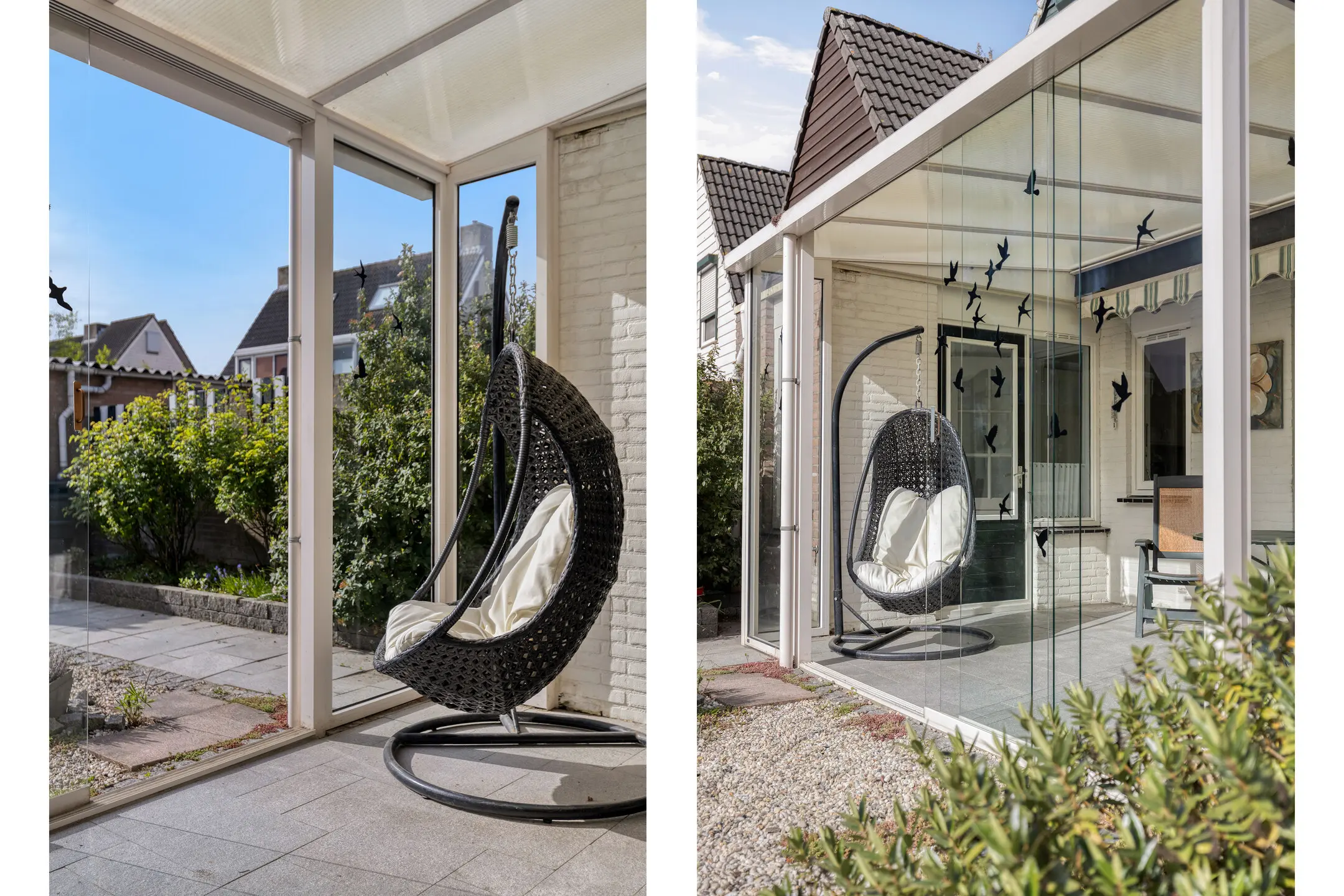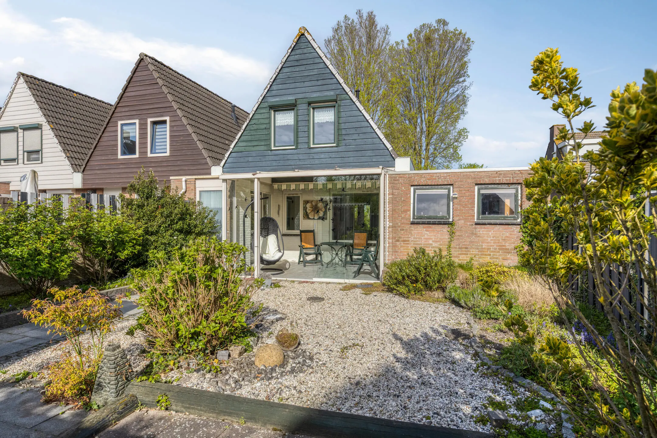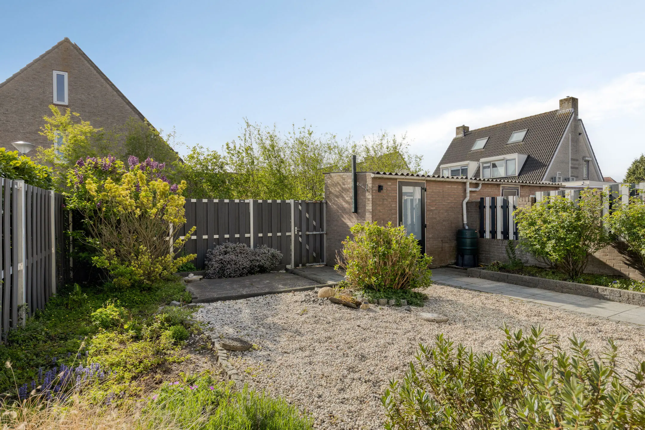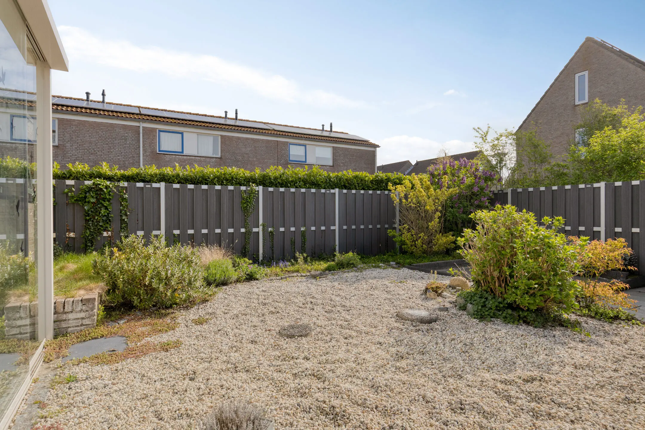 De achtertuin is aangelegd met sierbestrating, siergrind en borders en is gelegen op het zuidoosten; een fijne zonligging. Onder de aluminium overkapping met glazen schuifpui en zonwering zit je hier al snel comfortabel buiten, zelfs als het weer wat minder is.