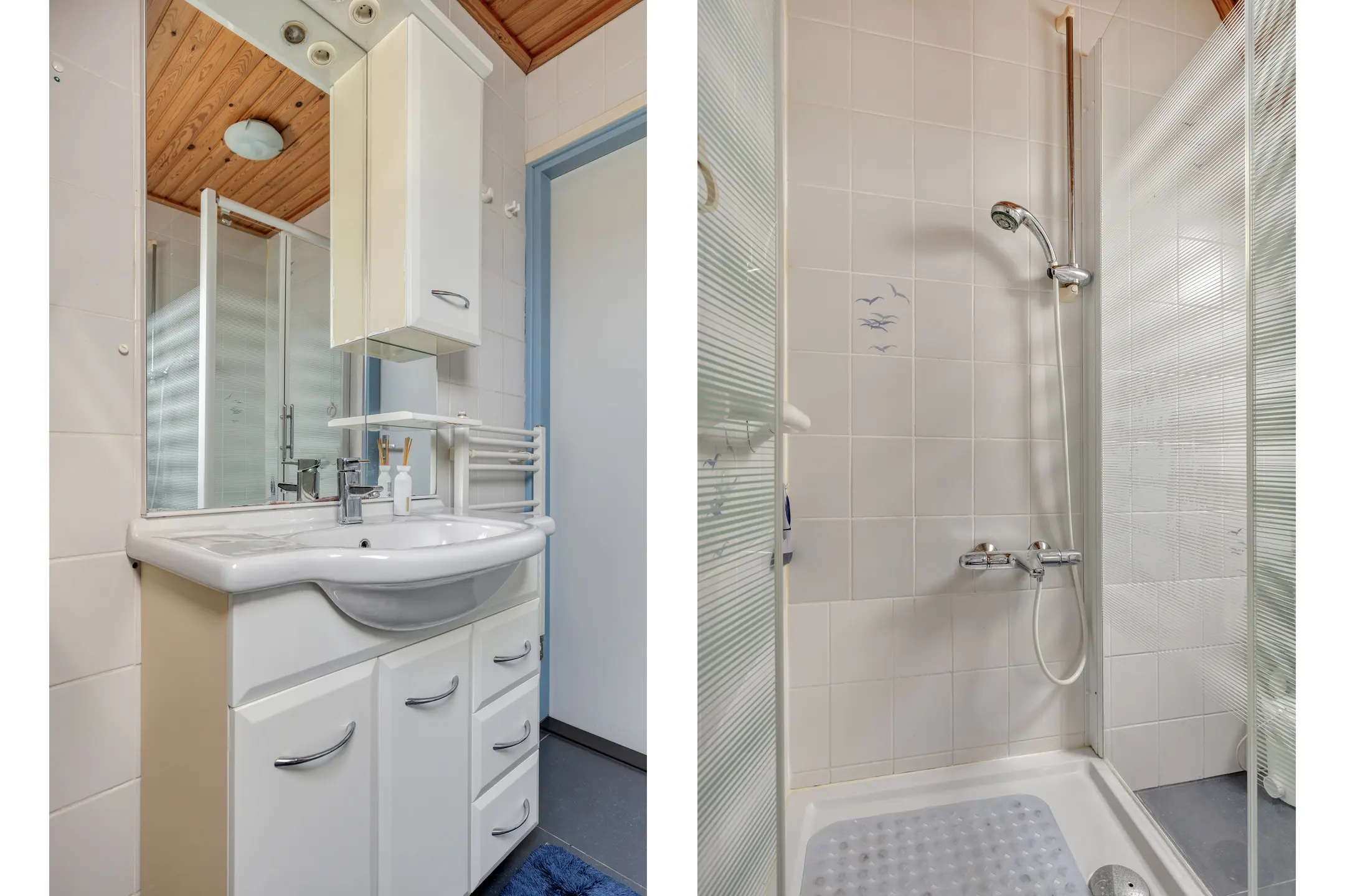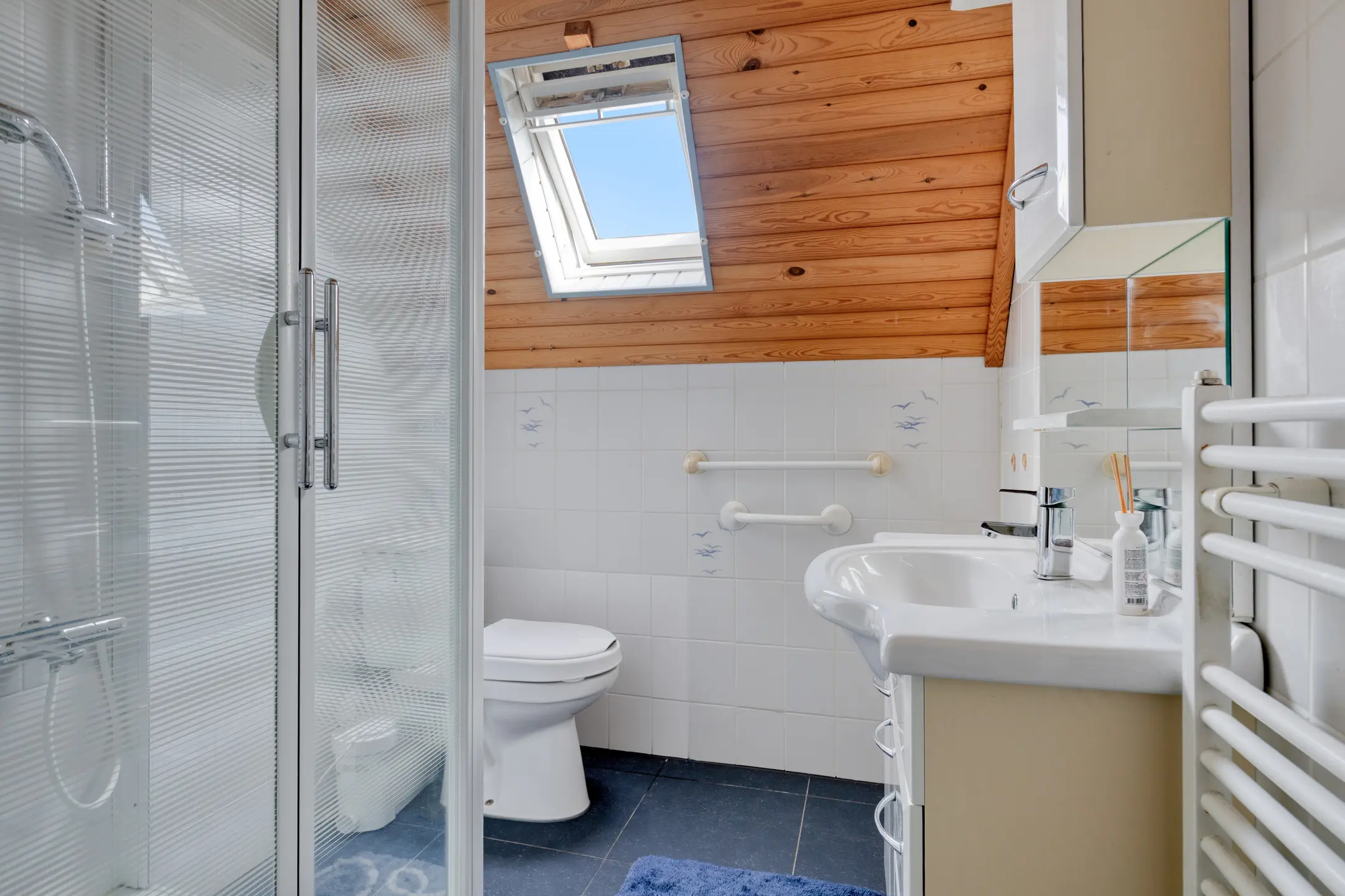 De eenvoudige badkamer is voorzien van een douchecabine, (sanibroyeur) toilet en wastafelmeubel. Het dakraam zorgt hier voor prettig daglicht en ventilatie.
