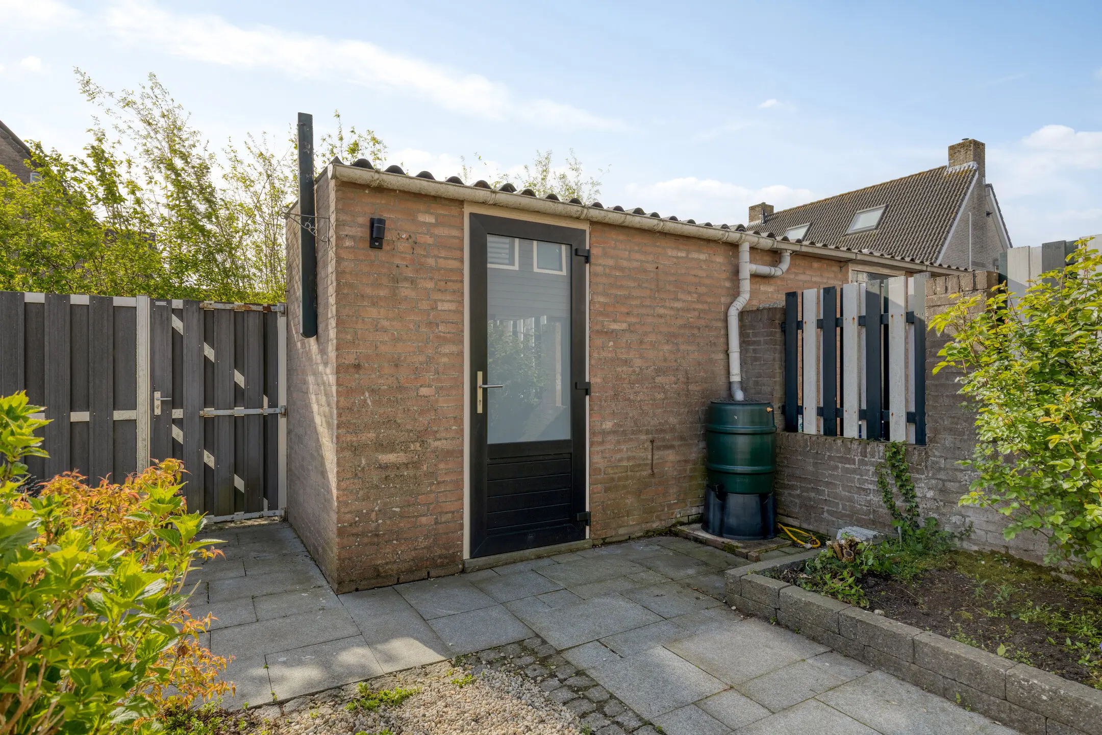 Achterin de tuin vind je een handige stenen berging en een vrije achterom.