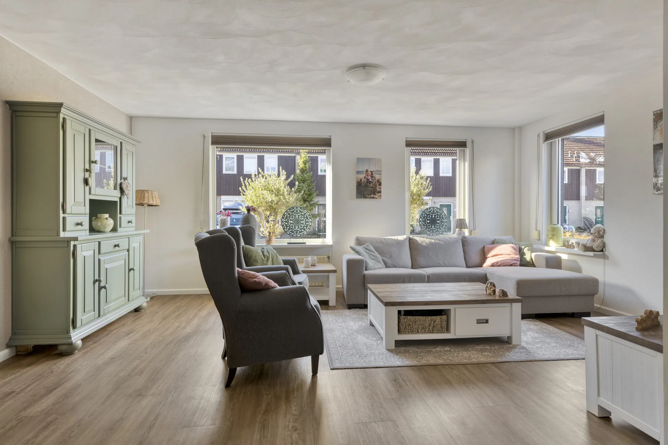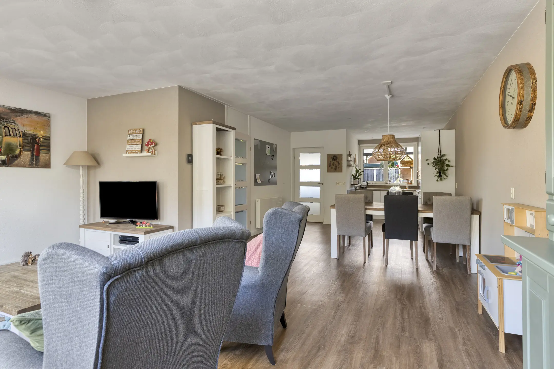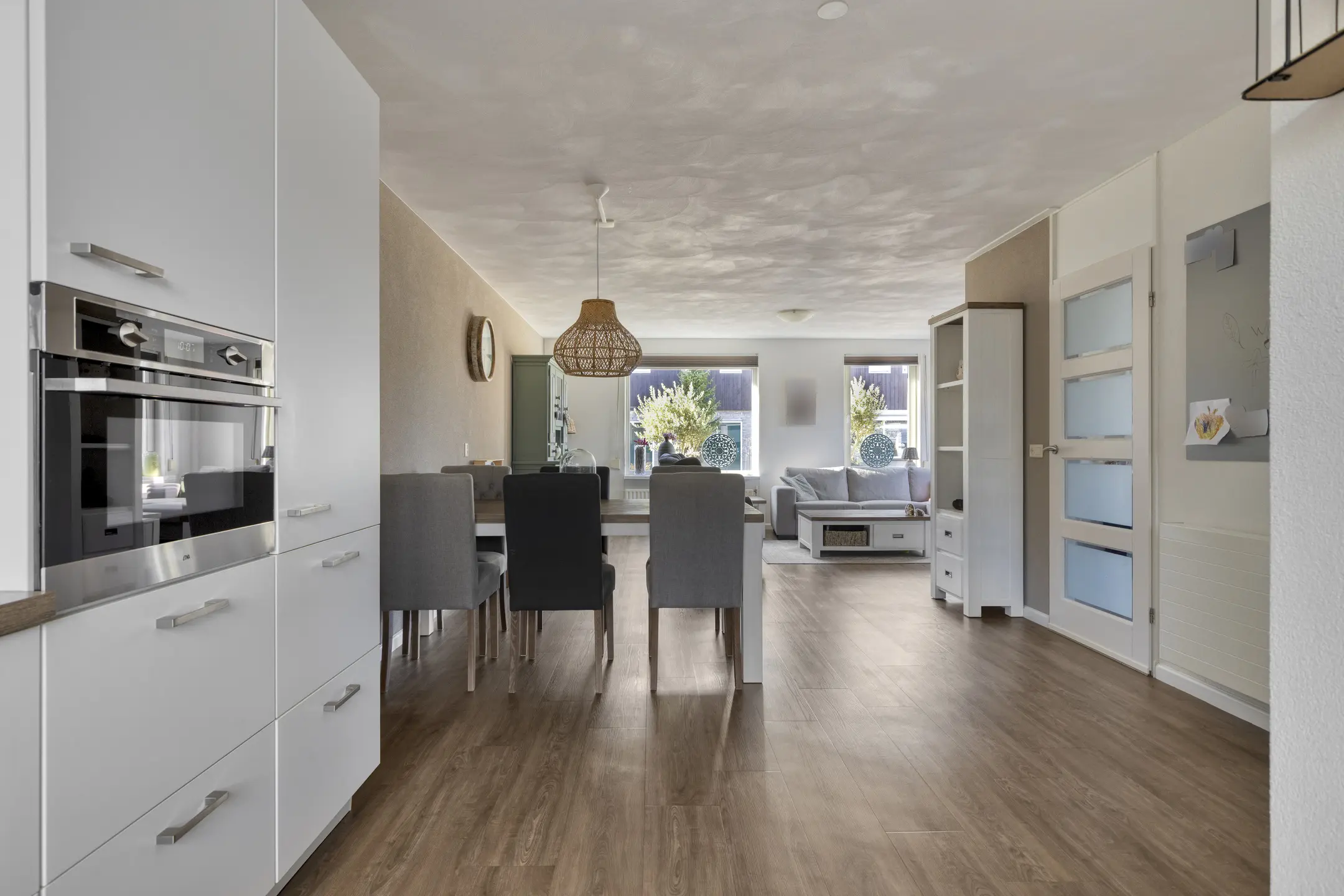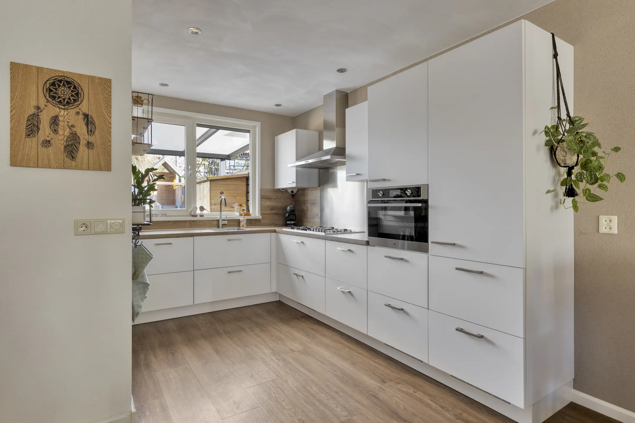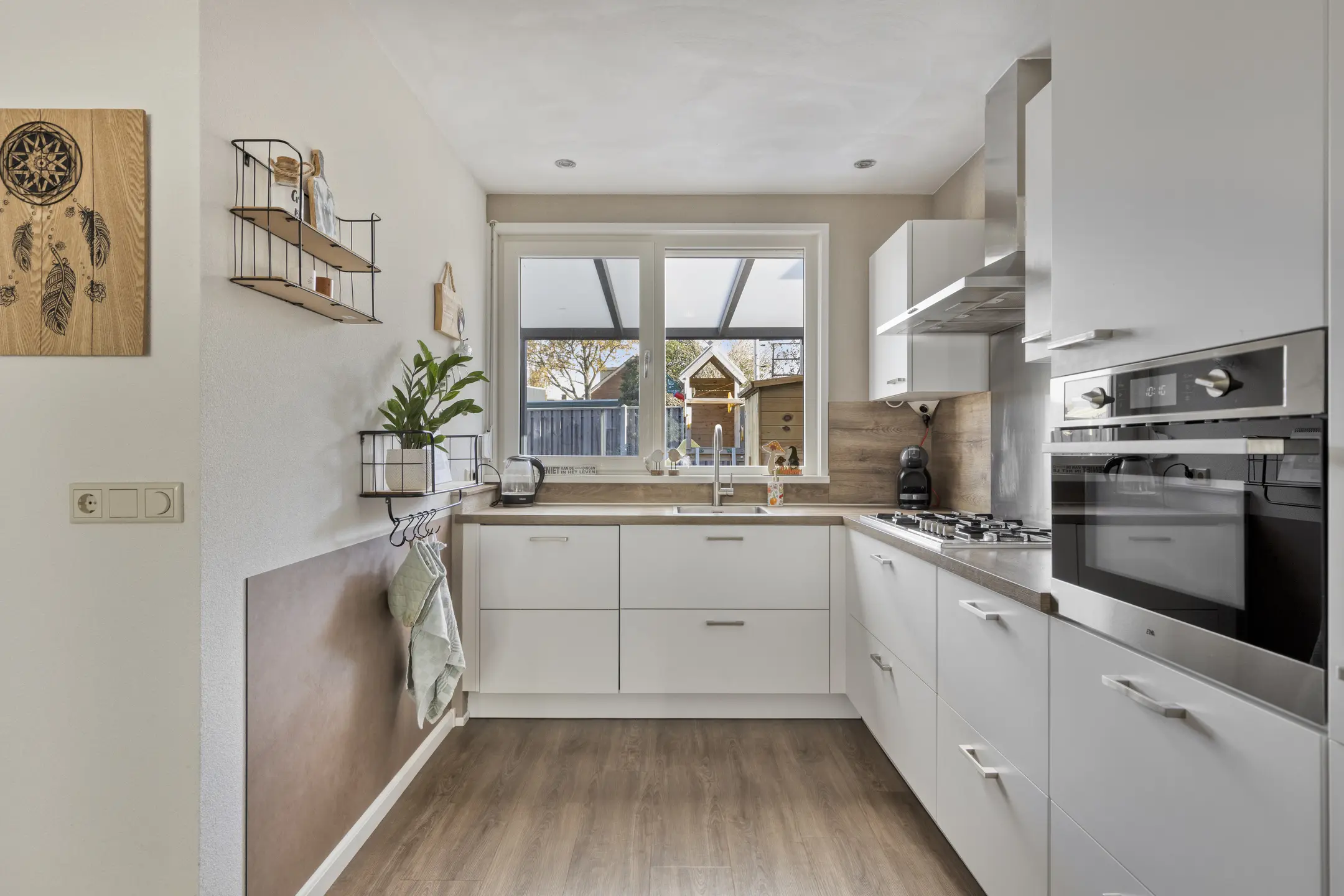 Welkom! Je stapt de woning binnen in een nette hal met de meterkast, een modern (hang)toilet met fonteintje en de trap naar de eerste verdieping. Vanuit hier loop je door naar de woonkamer aan de voorzijde van de woning. Deze is verrassend ruim opgezet en voorzien van een fraaie pvc-vloer. Dankzij de rolluiken houd je het hier op warme dagen heerlijk koel. Grenzend aan de woonkamer vind je de keuken in hoekopstelling. Deze is in 2017 vernieuwd en uitgerust met alle gemakken van nu: een koelkast, 5-pits gasfornuis met afzuigkap, combi-oven en vaatwasser. Het grote raam boven het werkblad zorgt voor een prettige lichtinval en is eveneens voorzien van een rolluik.