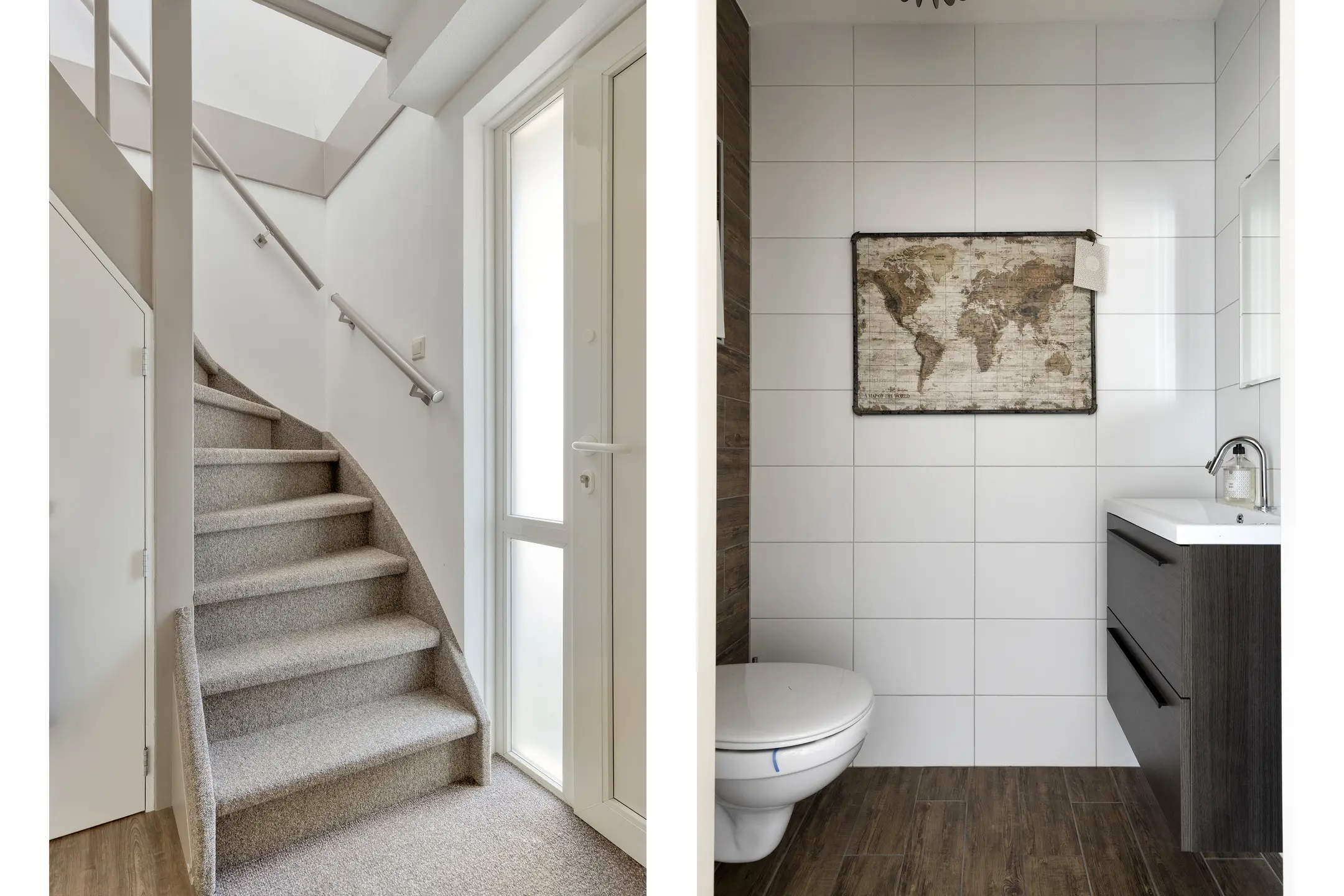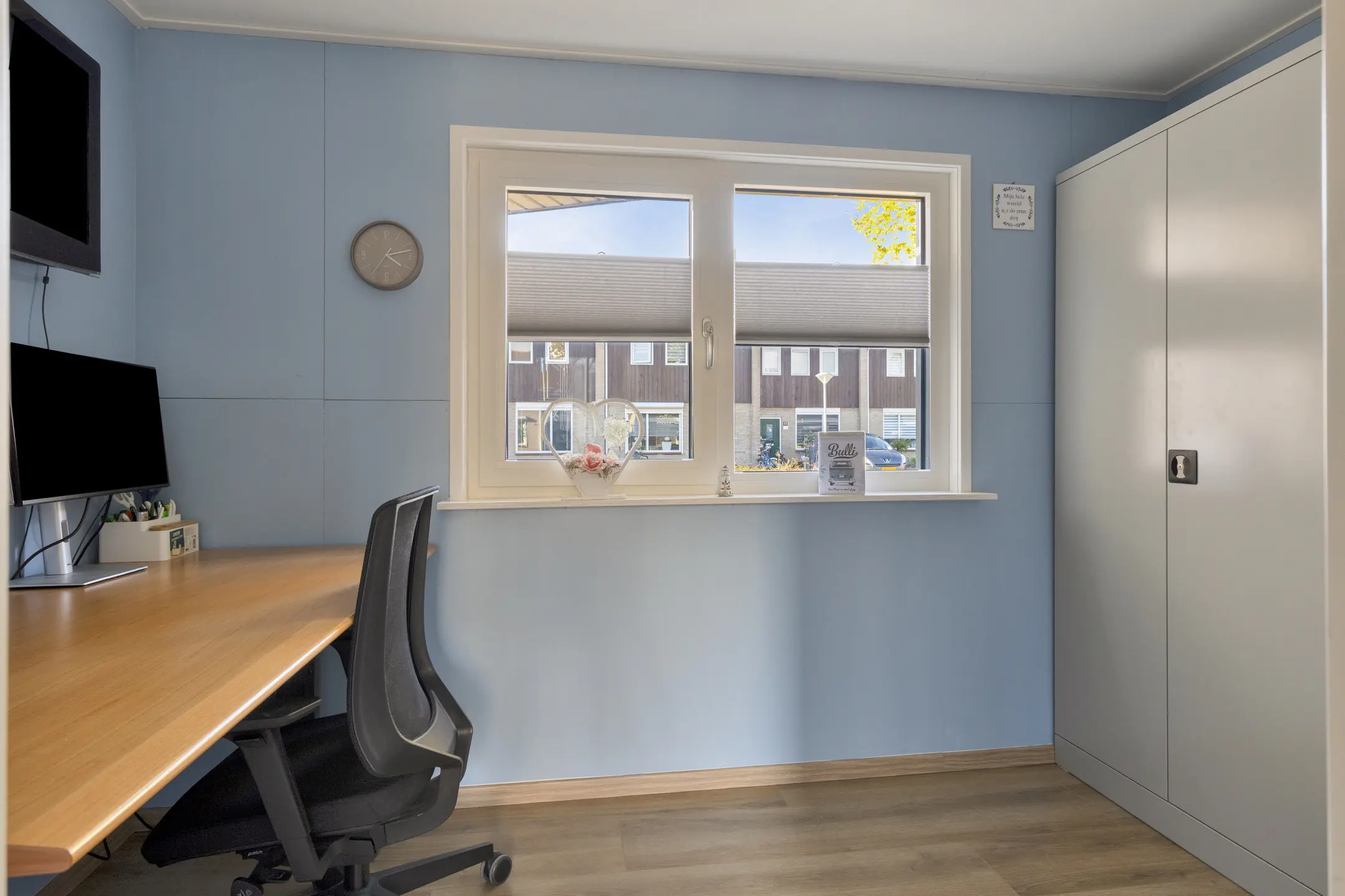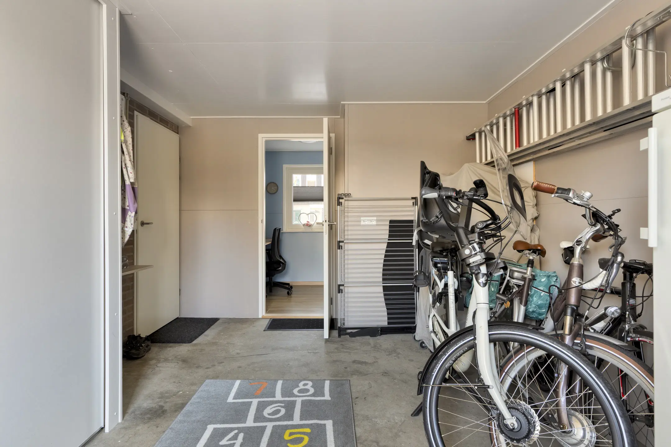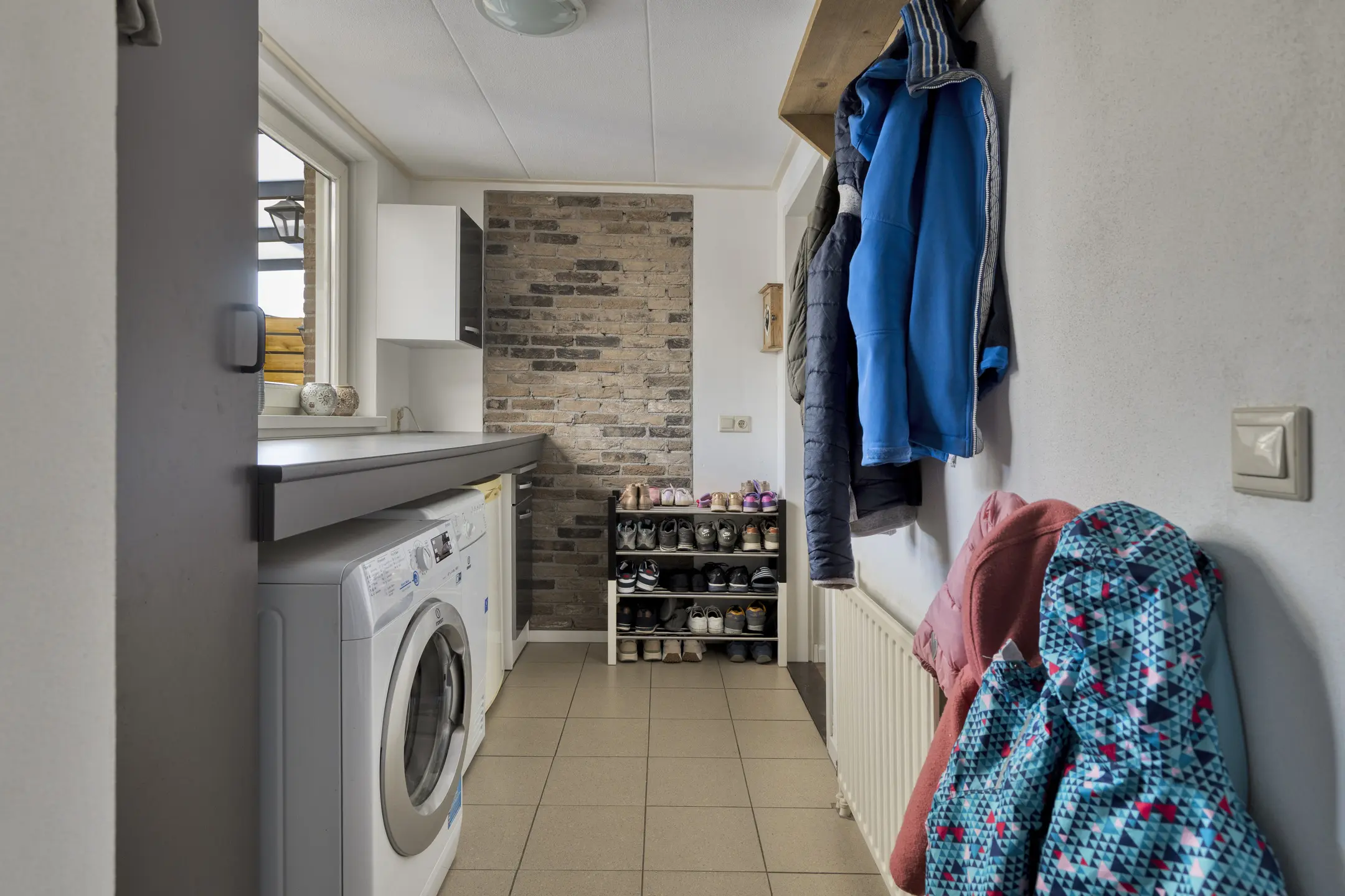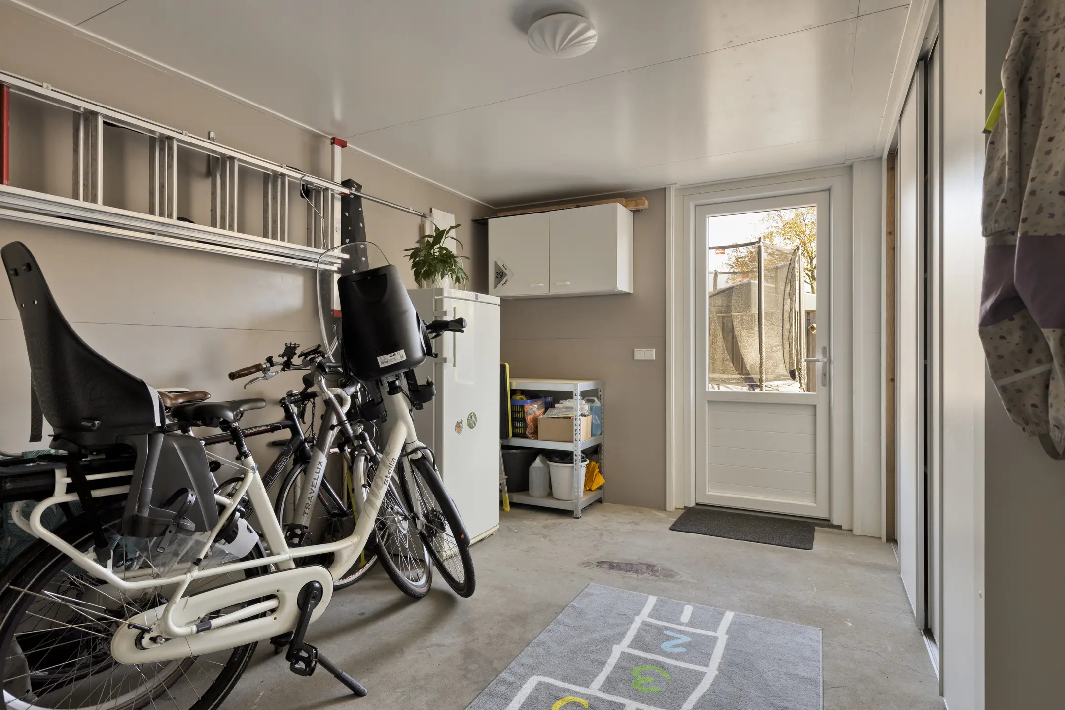 Aansluitend is er een praktische bijkeuken met de aansluiting voor de wasmachine, de CV-ketel (2017). Daarnaast beschikt de begane grond (voorheen garage) over een extra kamer die ideaal is als kantoor, hobbyruimte of speelkamer. Tot slot is er nog een inpandige berging met vaste kast, de omvormer van de zonnepanelen en een deur naar de tuin.