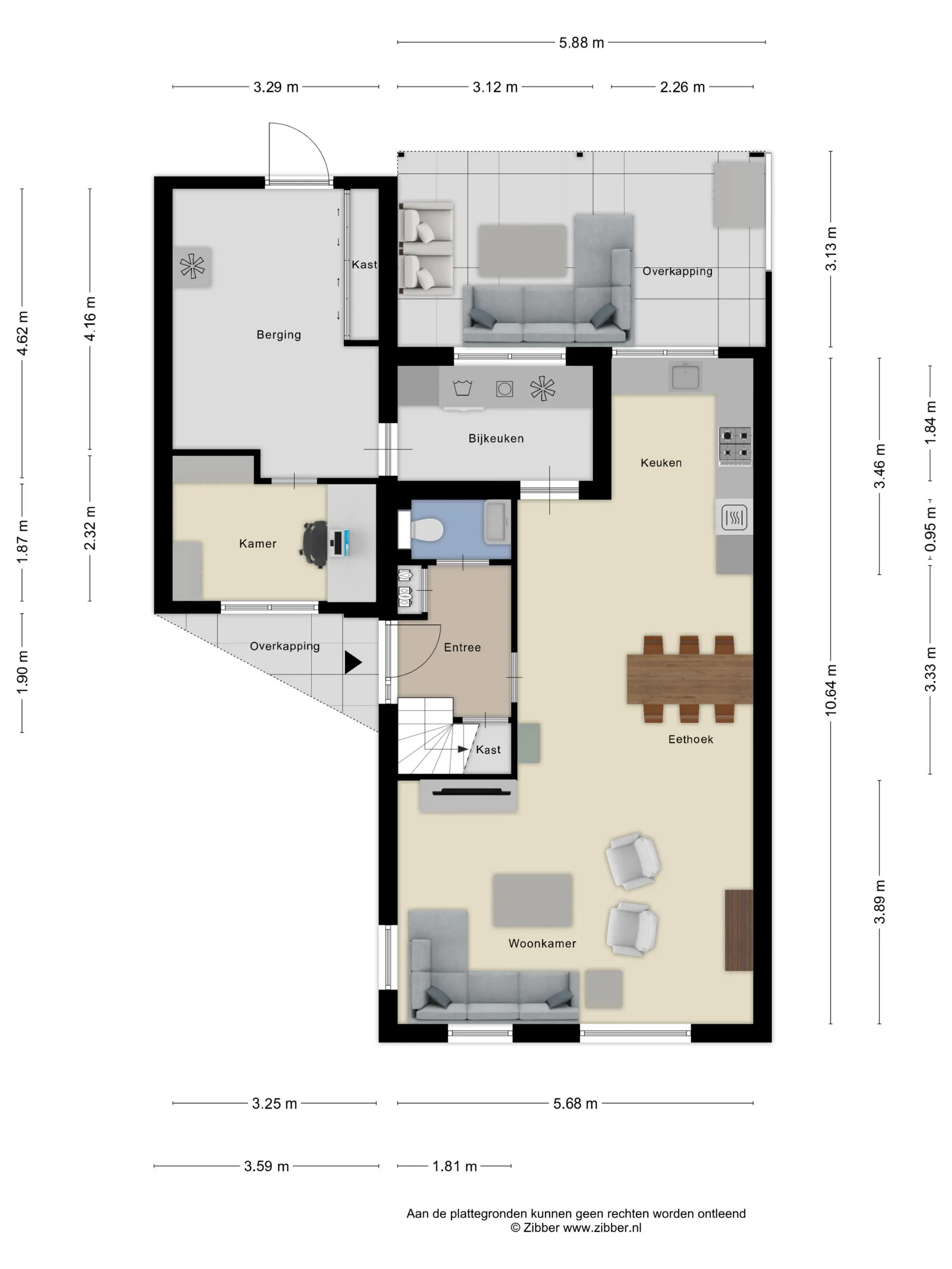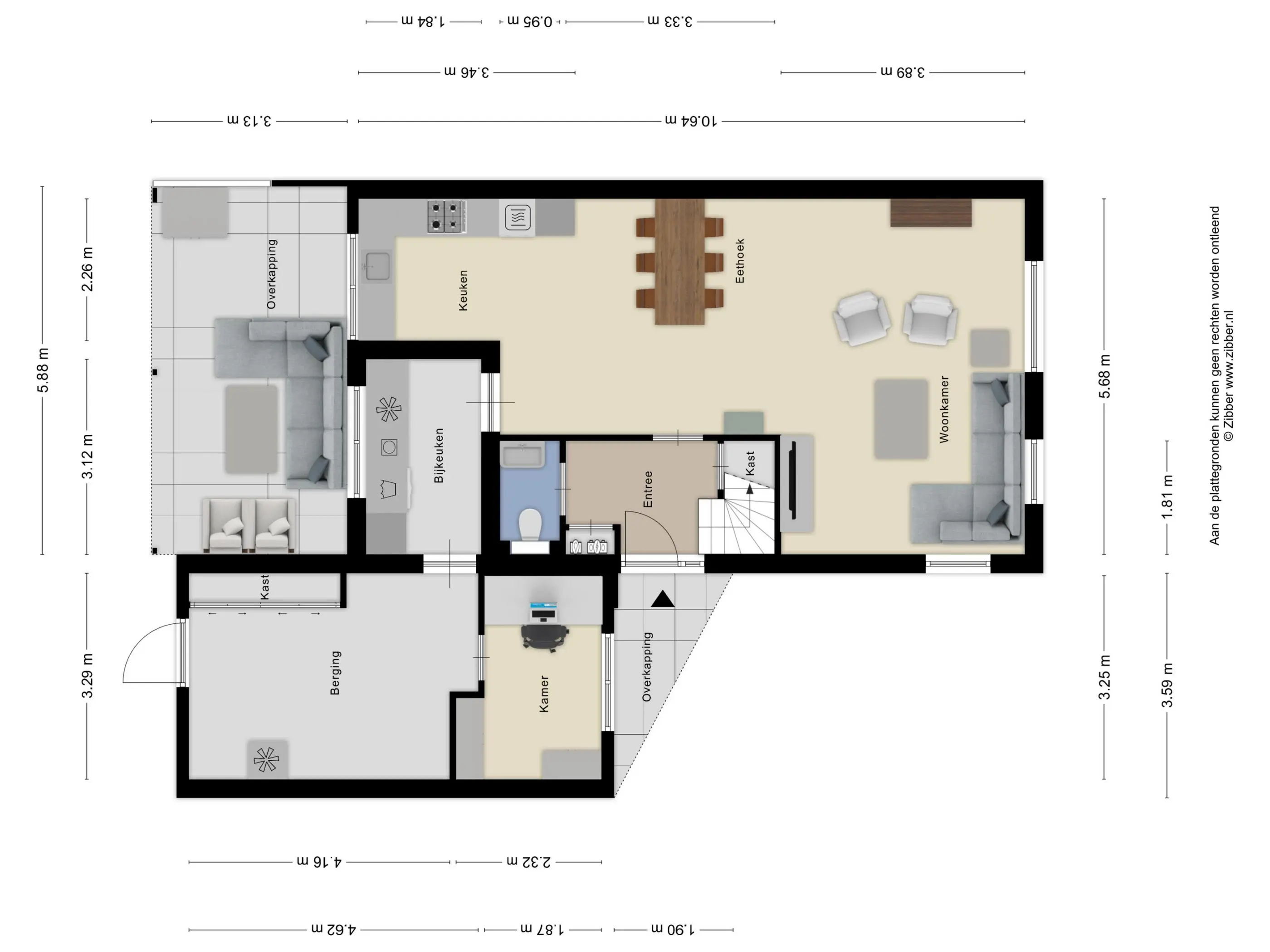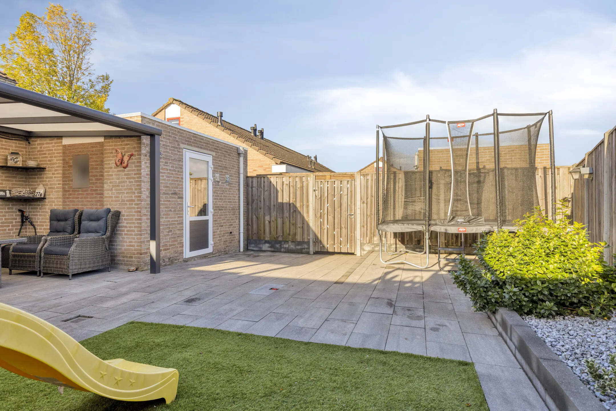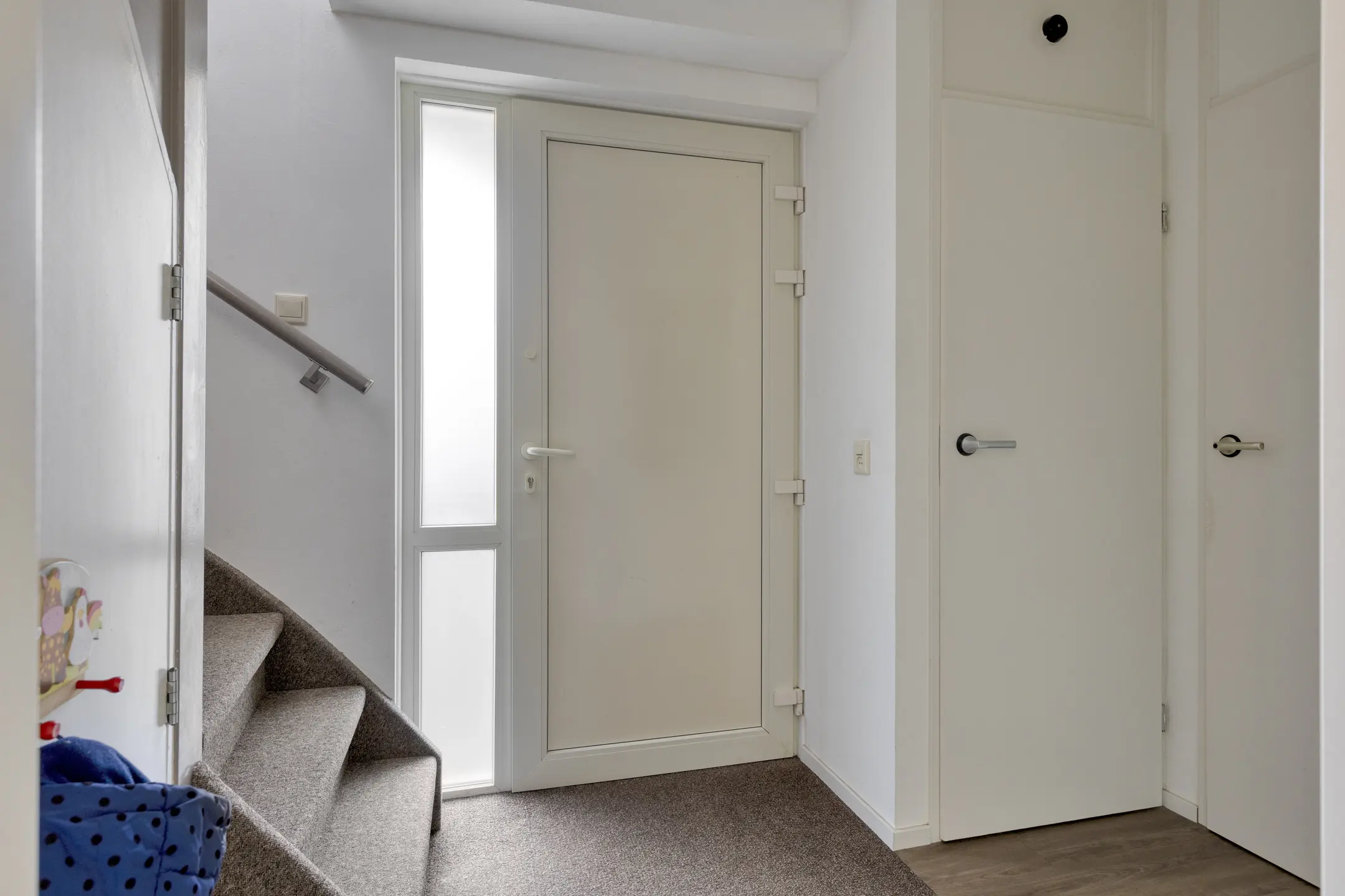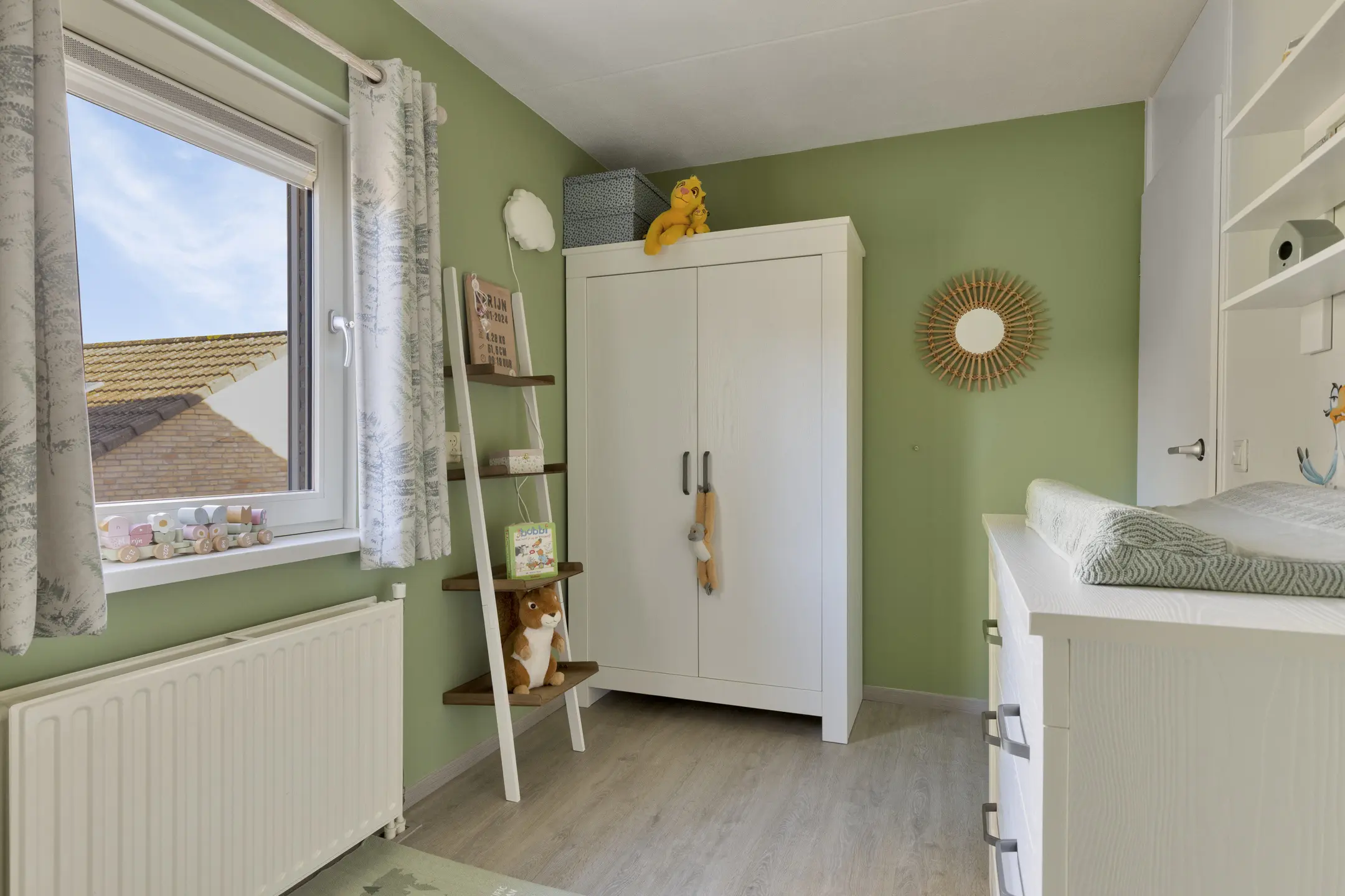 Aansluitend is er een praktische bijkeuken met de aansluiting voor de wasmachine, de CV-ketel (2017). Daarnaast beschikt de begane grond (voorheen garage) over een extra kamer die ideaal is als kantoor, hobbyruimte of speelkamer. Tot slot is er nog een inpandige berging met vaste kast, de omvormer van de zonnepanelen en een deur naar de tuin.