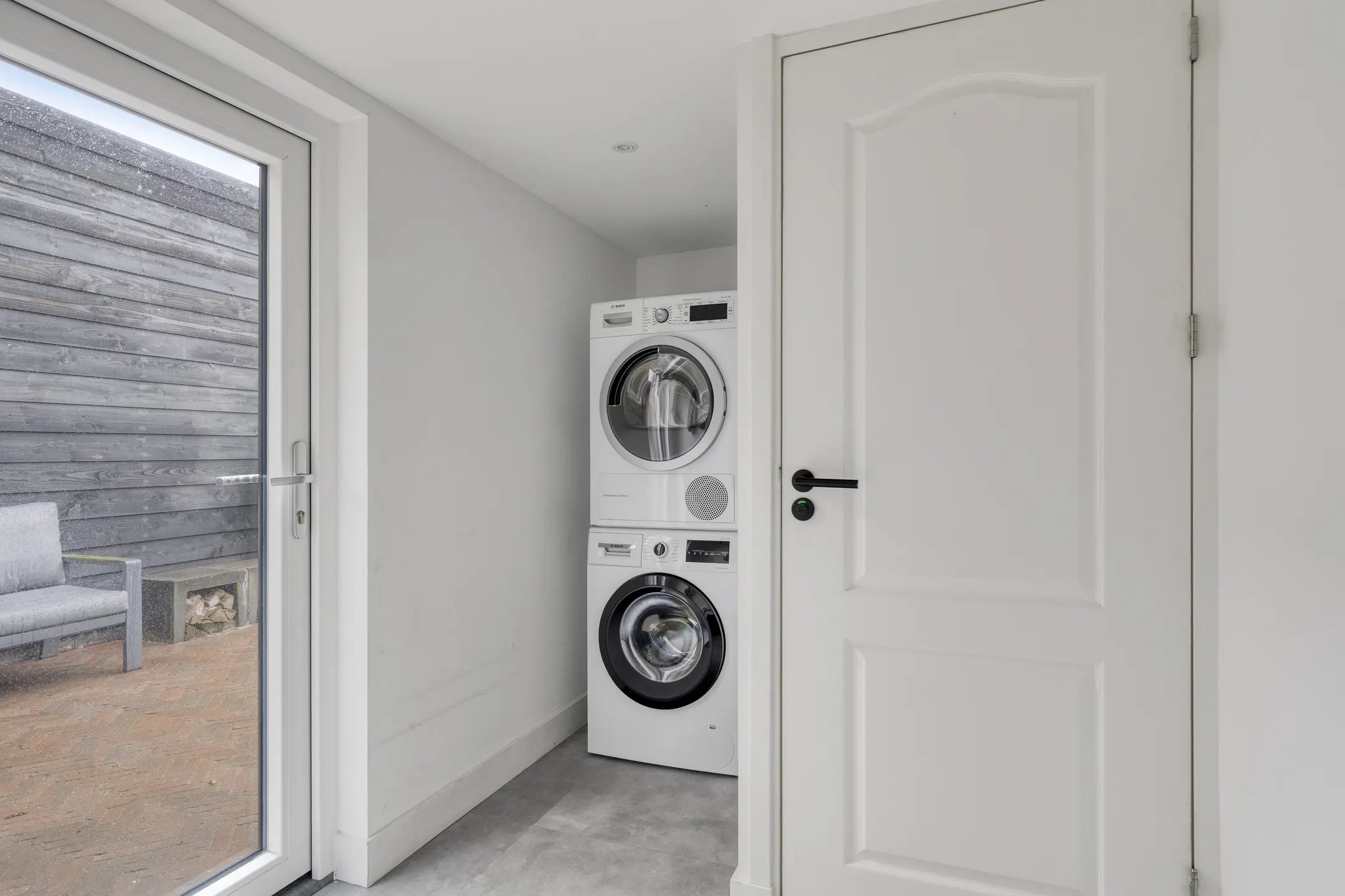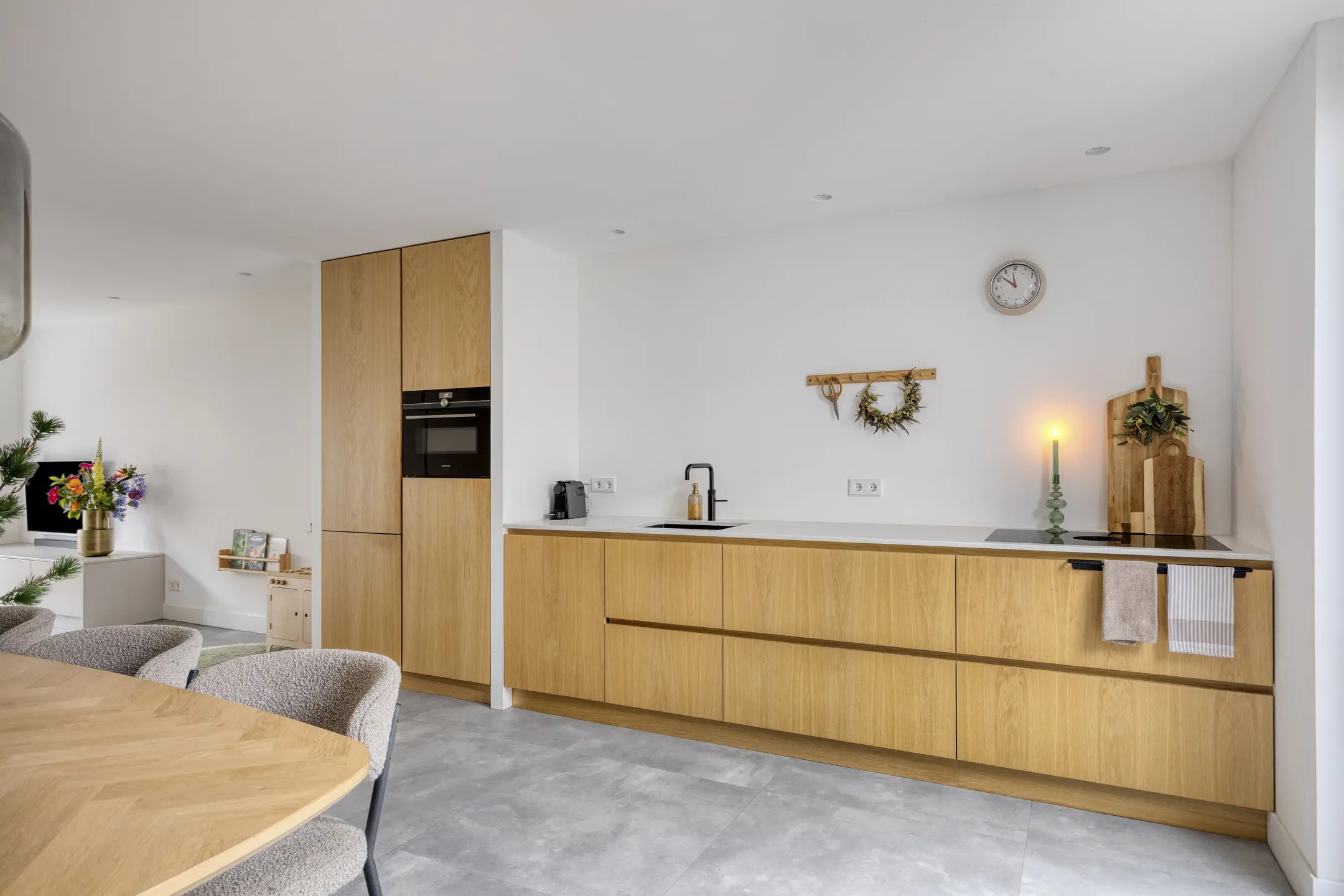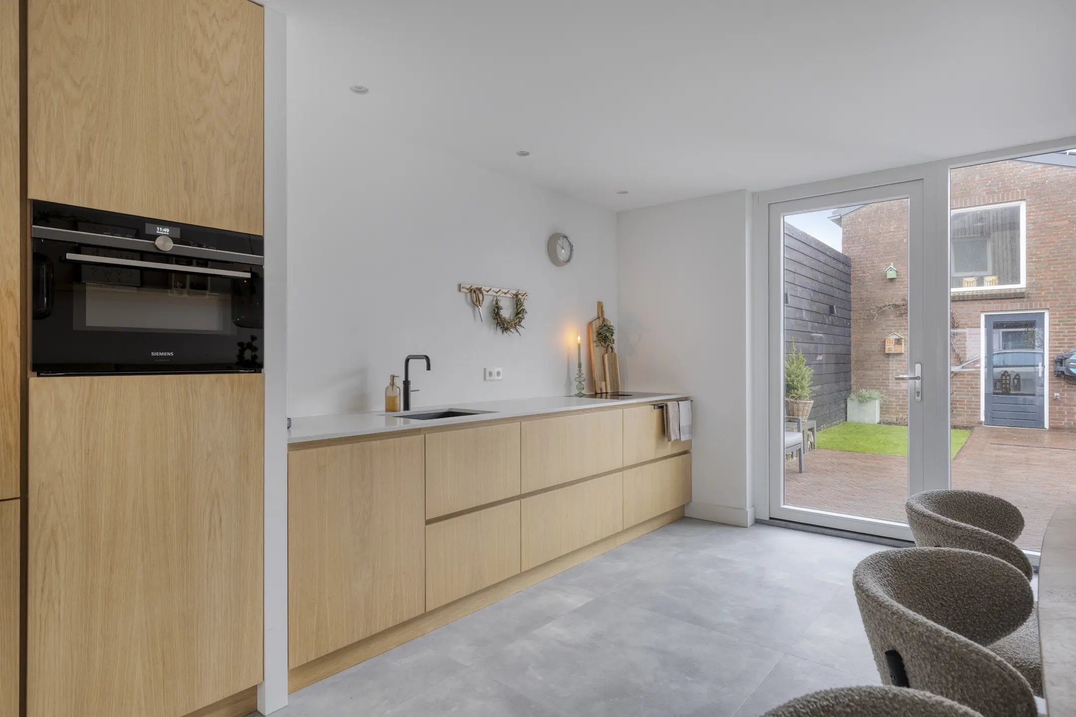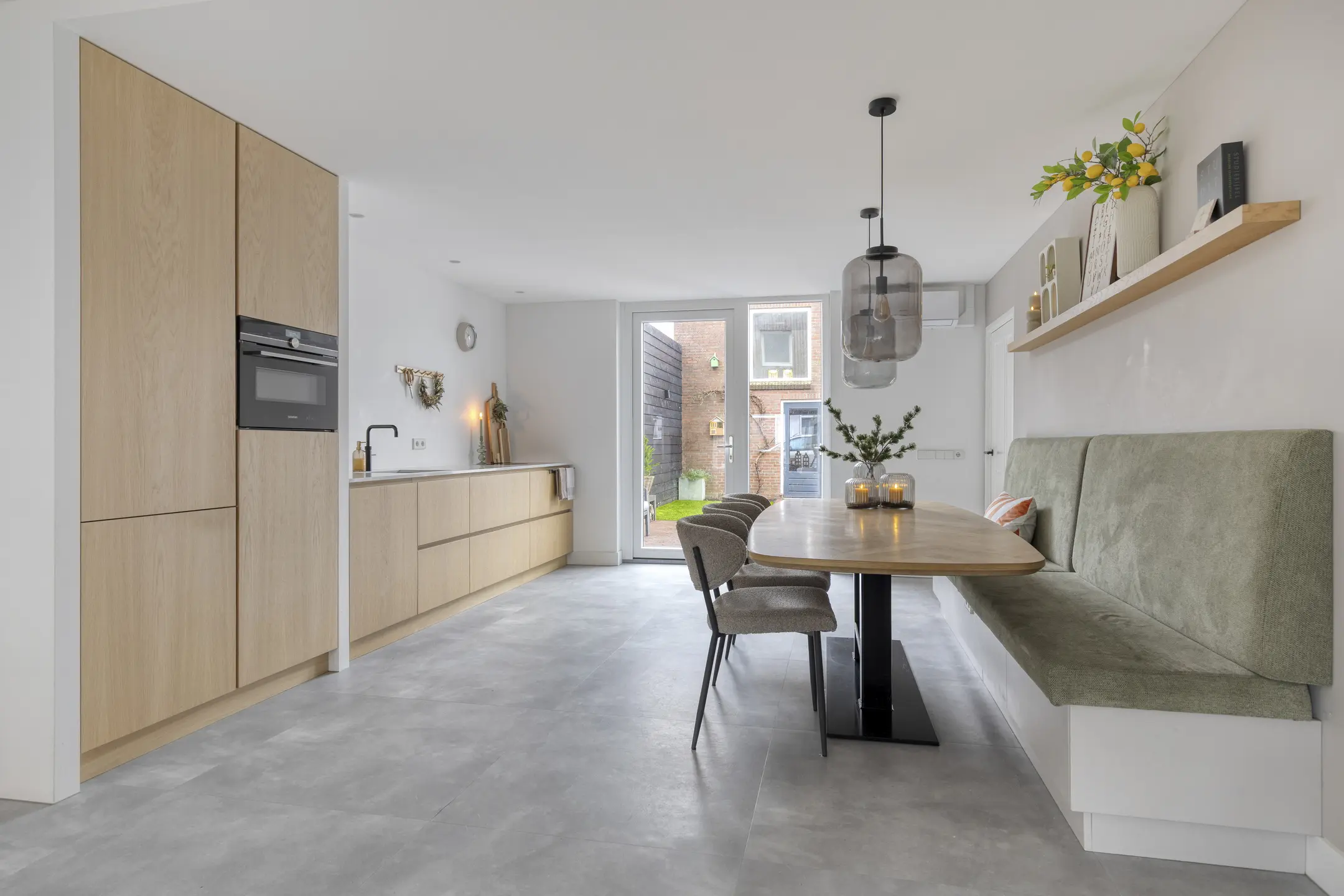 De keuken is in 2024 volledig vernieuwd en dat zie je. Een moderne, rechte opstelling met alles wat je nodig hebt: koelkast, vriezer, combi-oven, vaatwasser (2020), Quooker en een luxe Bora inductiekookplaat met geïntegreerde afzuiging. Via de loopdeur sta je zo in de tuin. De airco uit 2023 zorgt hier het hele jaar door voor een prettig binnenklimaat. Grenzend aan de keuken vind je de praktische bijkeuken en de trap naar boven. Hier is ook het moderne hangtoilet geplaatst, plus ruimte voor de wasmachine en droger. Ook vanuit de bijkeuken kun je direct de tuin in.