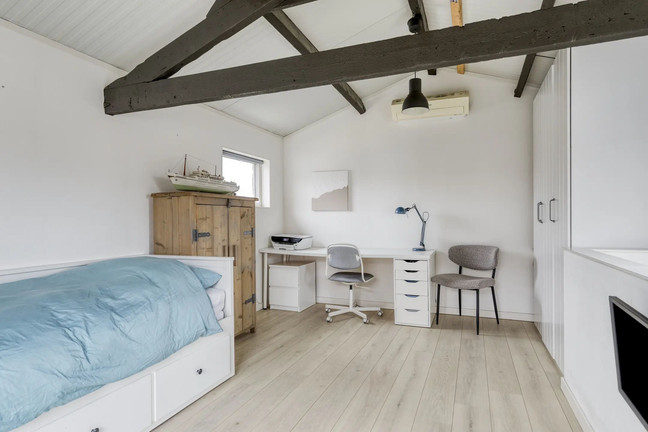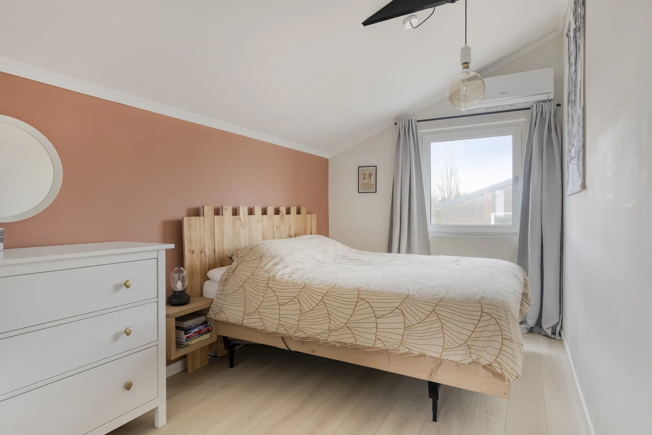 Op de eerste verdieping kom je uit op een ruime overloop, waar de CV-ketel (2022) keurig is weggewerkt in een vaste kast. Vanuit hier heb je toegang tot maar liefst drie slaapkamers. De hoofdslaapkamer ligt aan de rustige achterzijde en is uitgerust met een kunststof kozijn én een airco die zowel kan koelen als verwarmen, ideaal voor elk seizoen.