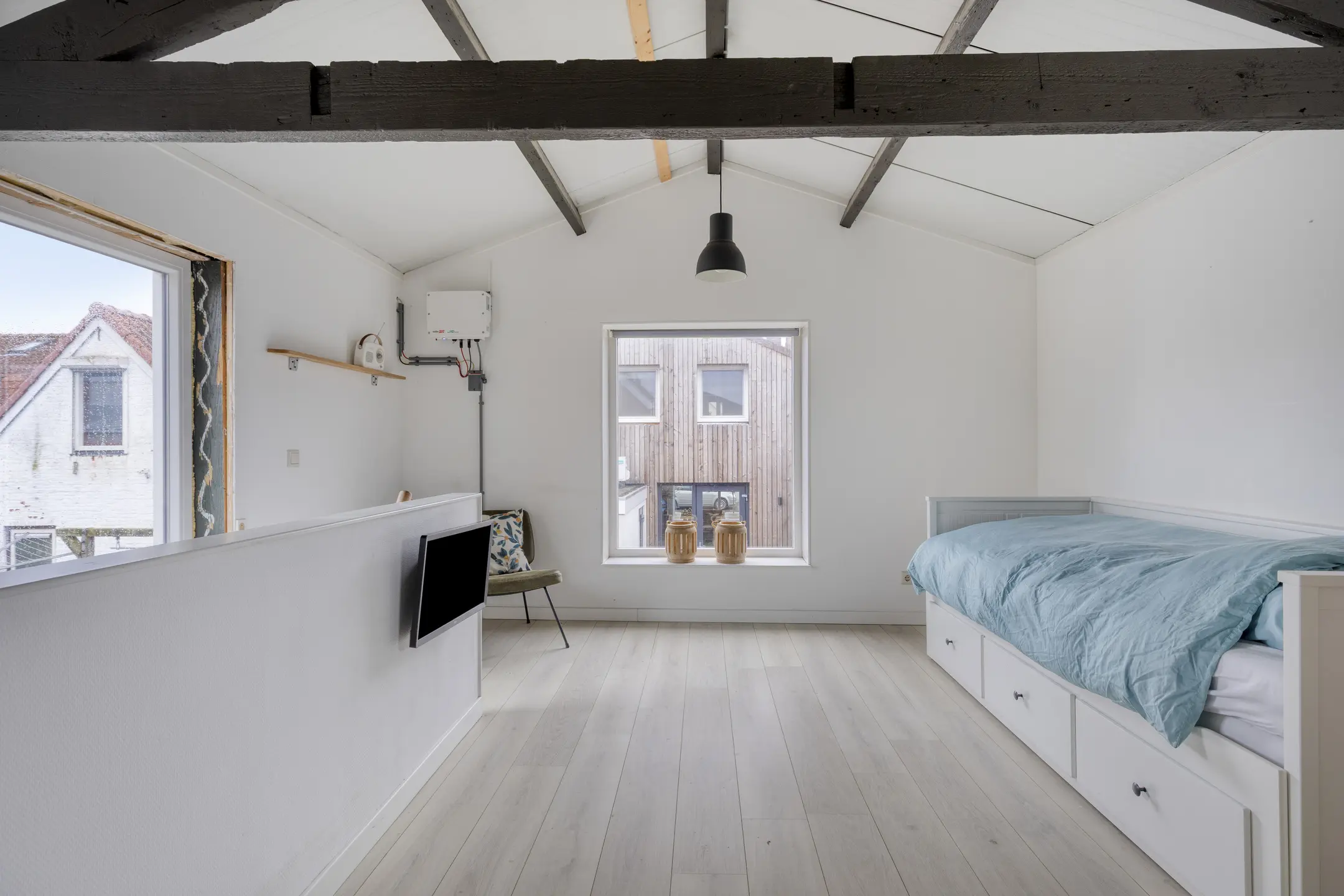 De schuur is misschien wel dé verrassing van deze woning. Vanuit de tuin stap je via een loopdeur naar binnen, maar ook aan de achterzijde is er volop gemak met een elektrisch bedienbare roldeur, een loopdeur en een brede oprit met ruimte voor meerdere auto’s. Op de begane grond vind je een praktisch keukenblok met warm en koud water, plus veel bergruimte voor fietsen, tuinspullen of hobby’s. Maar het echte pluspunt? De verdieping! Via een vaste trap kom je op een verrassend ruime extra kamer. Deze is nu ingericht als logeerkamer, maar leent zich net zo goed voor een werkplek, hobbyruimte of chillplek. Dankzij de airco en de geïsoleerde sandwichplaten is het hier het hele jaar door comfortabel. Ook is in deze ruimte de omvormer van de zonnepanelen geplaatst.