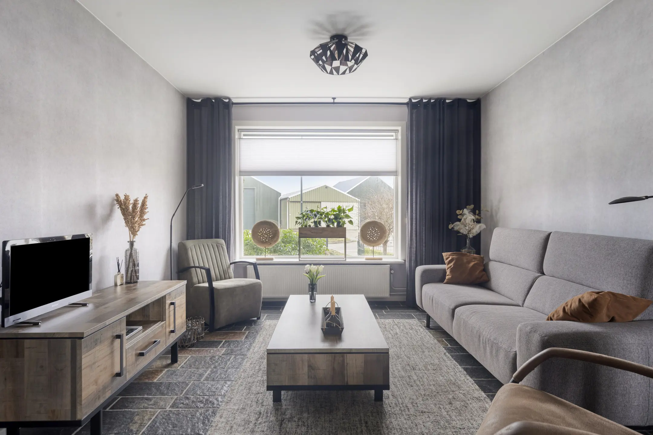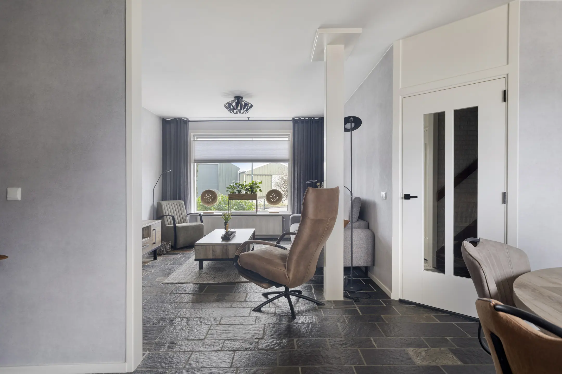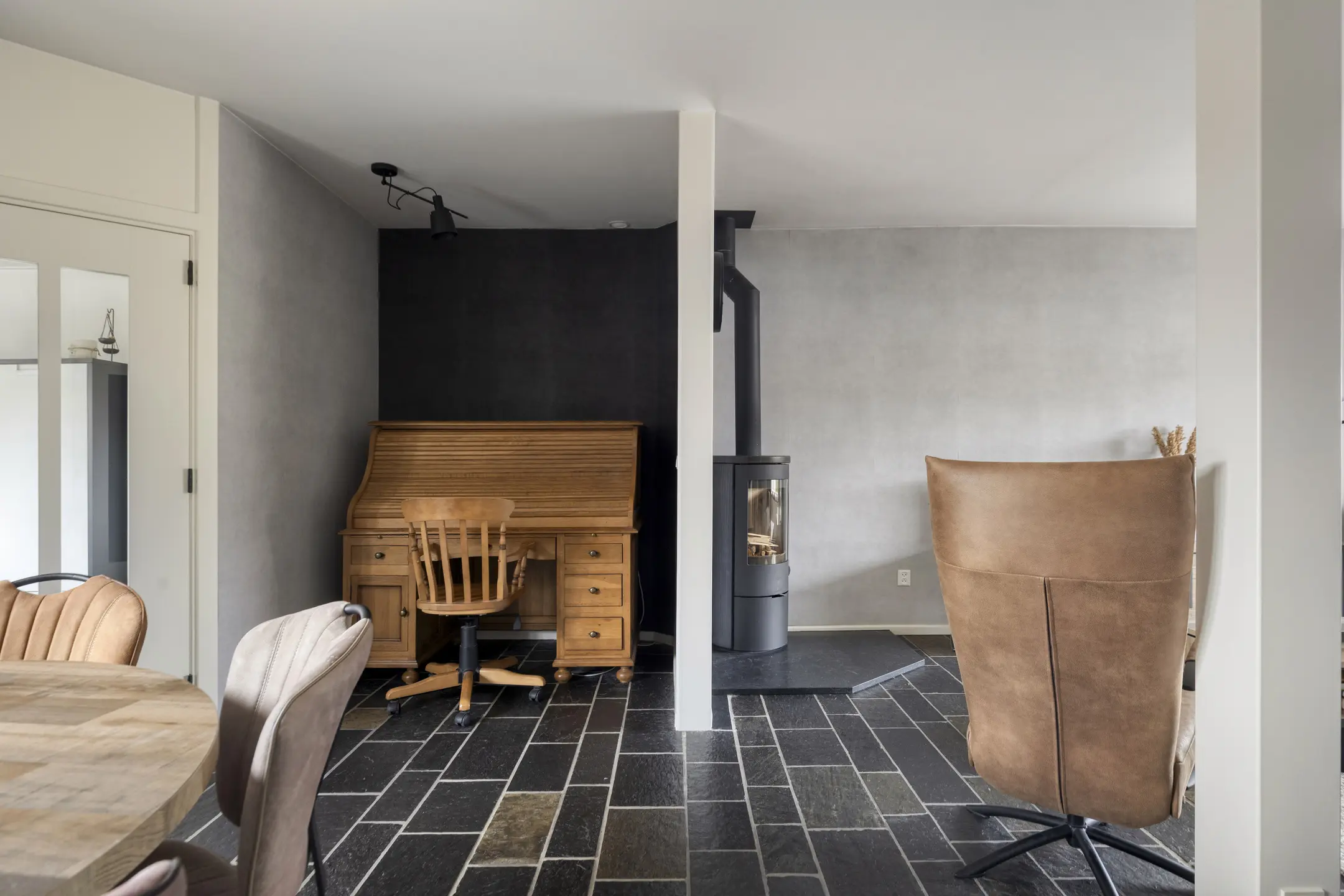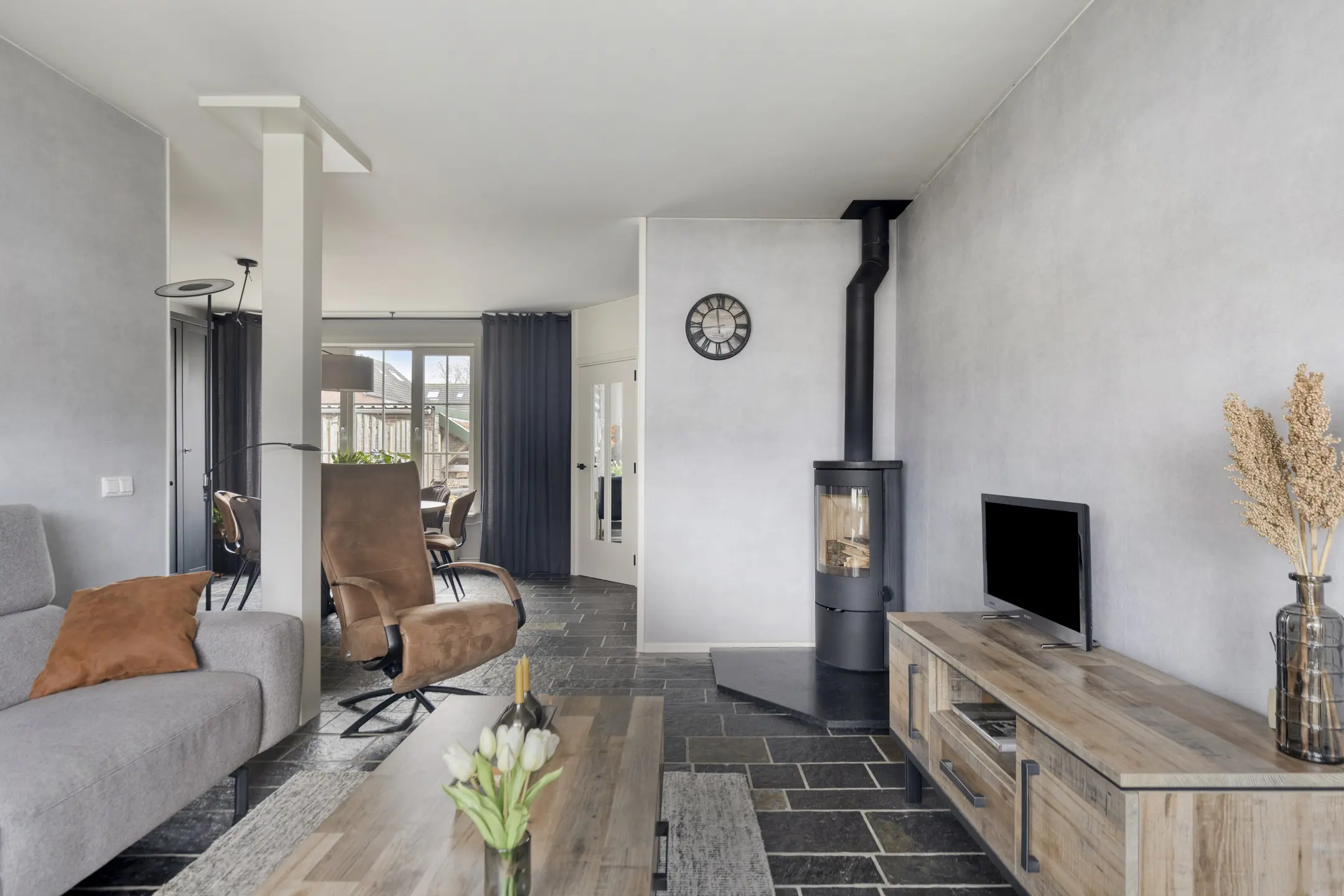 De woonkamer is een fijne leefruimte waar je je direct thuis voelt. Dankzij de plavuizen vloer is het geheel onderhoudsvriendelijk en praktisch. Aan de voorzijde is volop ruimte voor een comfortabele zithoek welke is voorzien van een houtkachel die voor veel warmte en sfeer zorgt aan de achterzijde is er voldoende ruimte voor een eettafel.