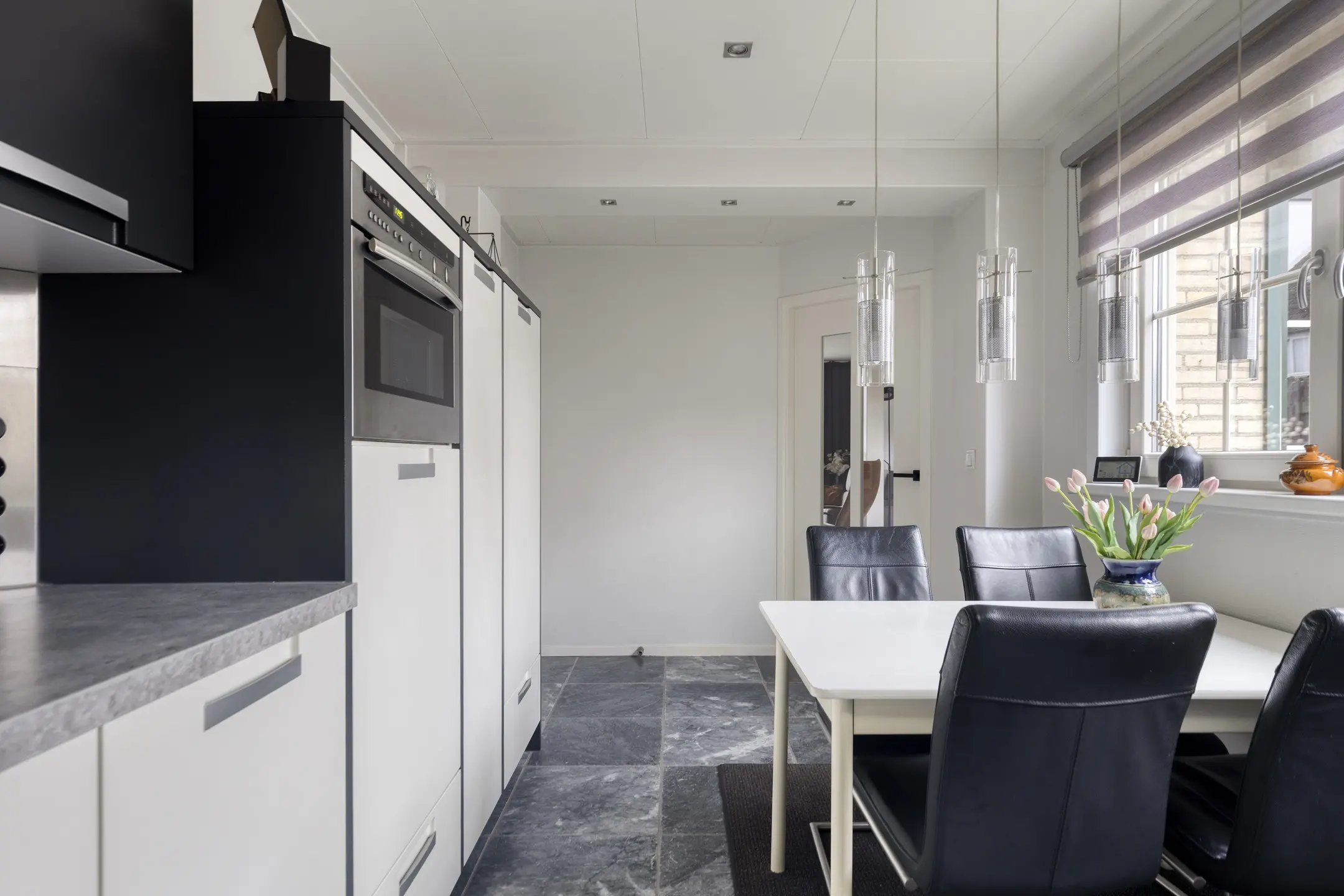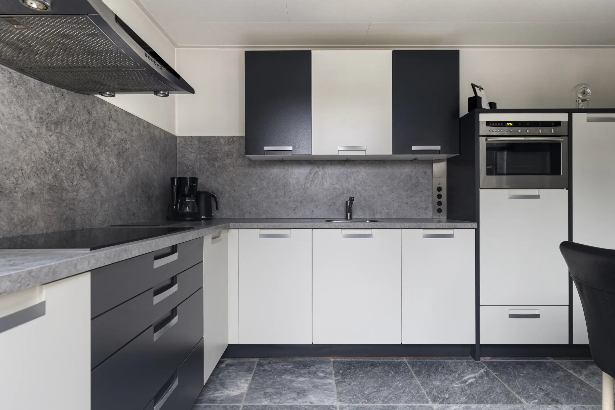 De lichte keuken bevindt zich in de aanbouw en vormt een fijne plek voor wie graag kookt. De keuken met marmeren plavuizen is compleet uitgevoerd met een koelkast, vaatwasser, oven, 5-pits inductie kookplaat met afzuigkap en een close-in-boiler. Alles wat je nodig hebt is aanwezig. Vanuit de keuken stap je zo de tuin in en toegang tot de garage die momenteel is ingericht als praktische berging/bijkeuken. De garage is voorzien van marmeren plavuizen met vloerverwarming, wasmachine aansluiting en een elektrische paneeldeur met loopdeur. Een ideale ruimte voor opslag of hobby’s.