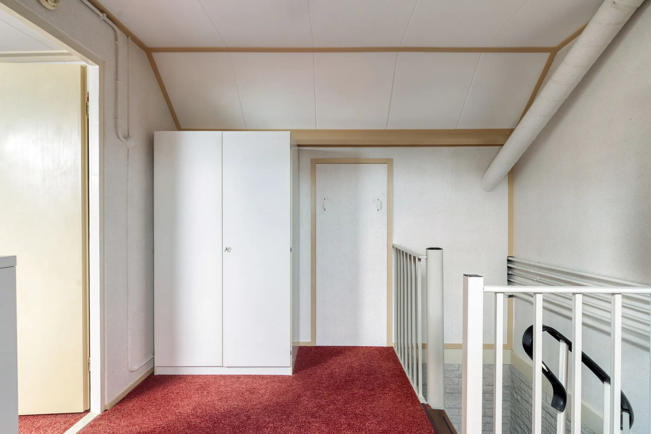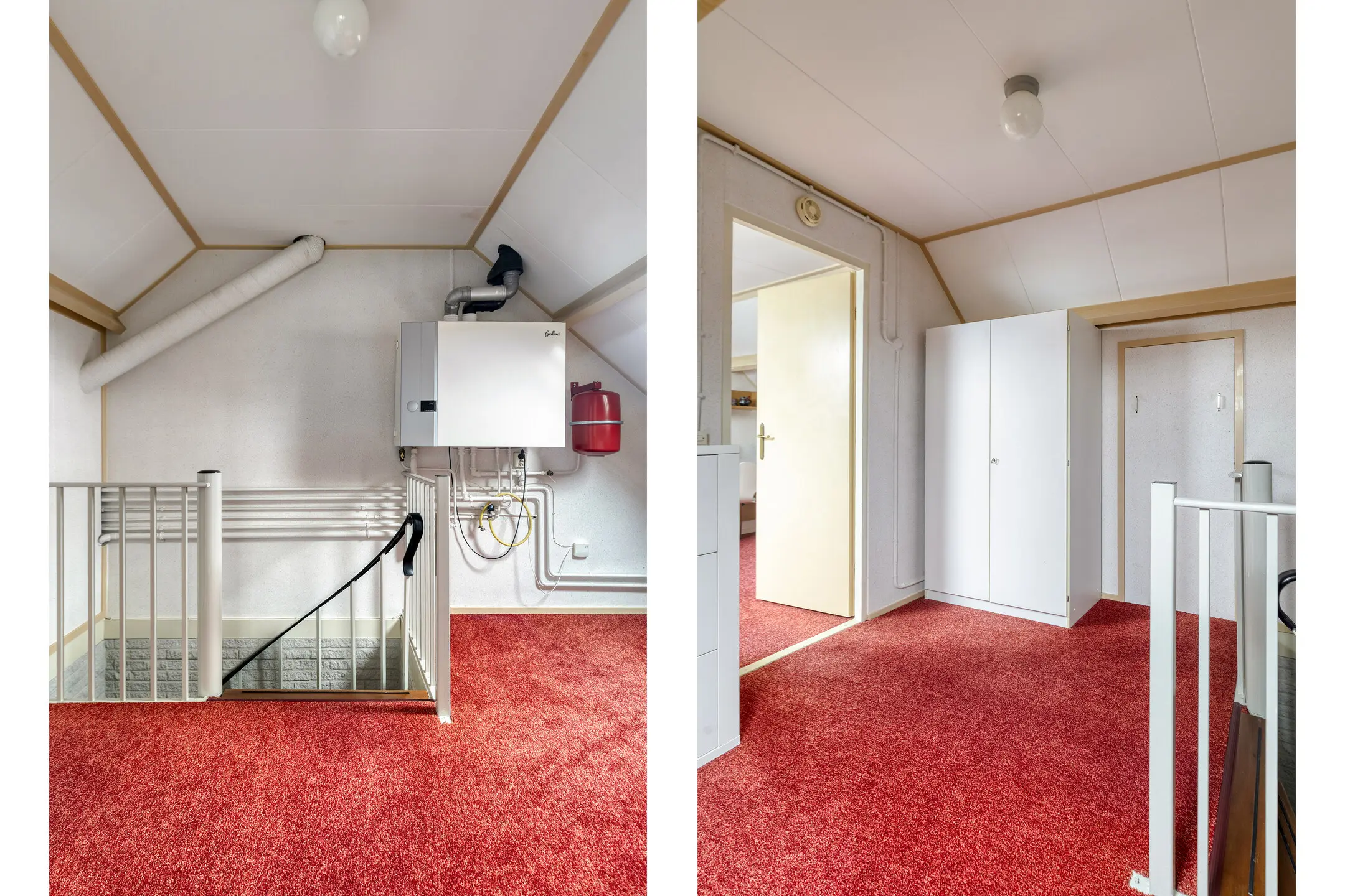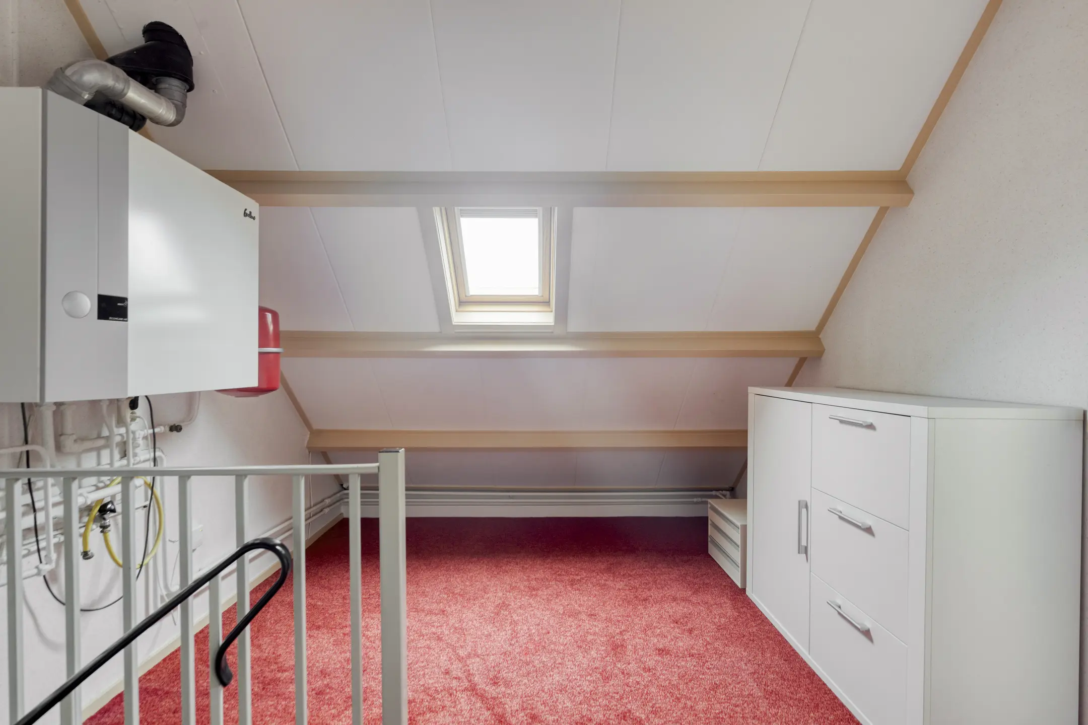 Via een vaste trap bereik je de tweede verdieping een volwaardige en verrassend ruime woonlaag. Je komt eerst op de overloop met Velux-dakraam, cv-ketel en in een praktische vaste kast de omvormer van de zonnepanelen en de ventilatie-unit.