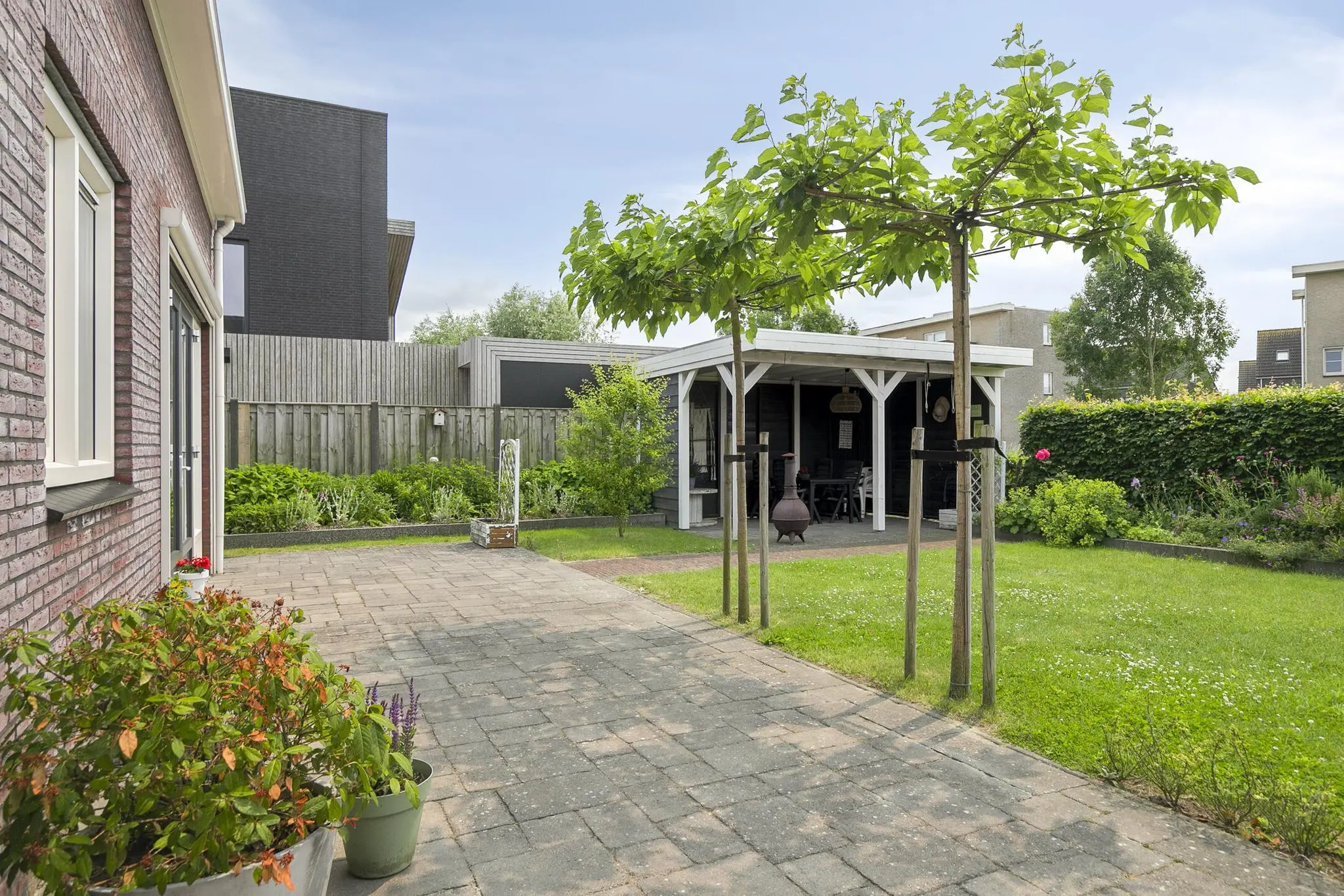 De zonnige achtertuin is gelegen op het Zuid-Westen, hier vind je sierbestrating, een gazon, een siertuin en een sfeervolle veranda om heerlijk buiten te zitten. In de tuin bevindt zich de royale garage (3,26 x 8,35 m), volledig geïsoleerd en voorzien van een tuindeur, elektrische paneeldeur en de opstelling van de cv-ketel. De voortuin is keurig aangelegd en biedt een oprit met parkeergelegenheid.