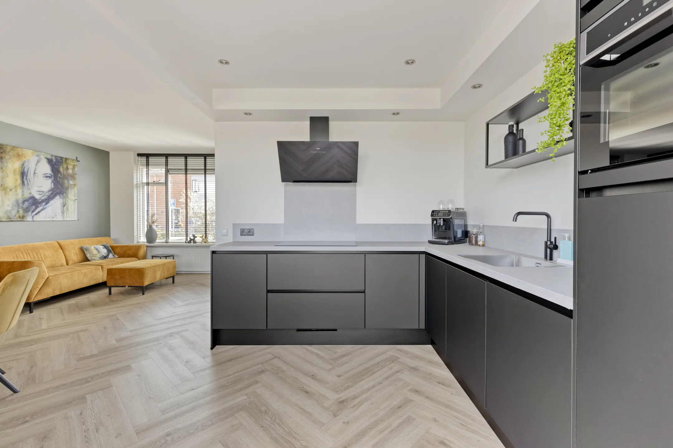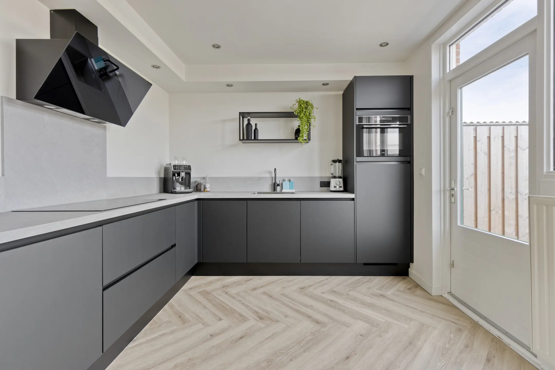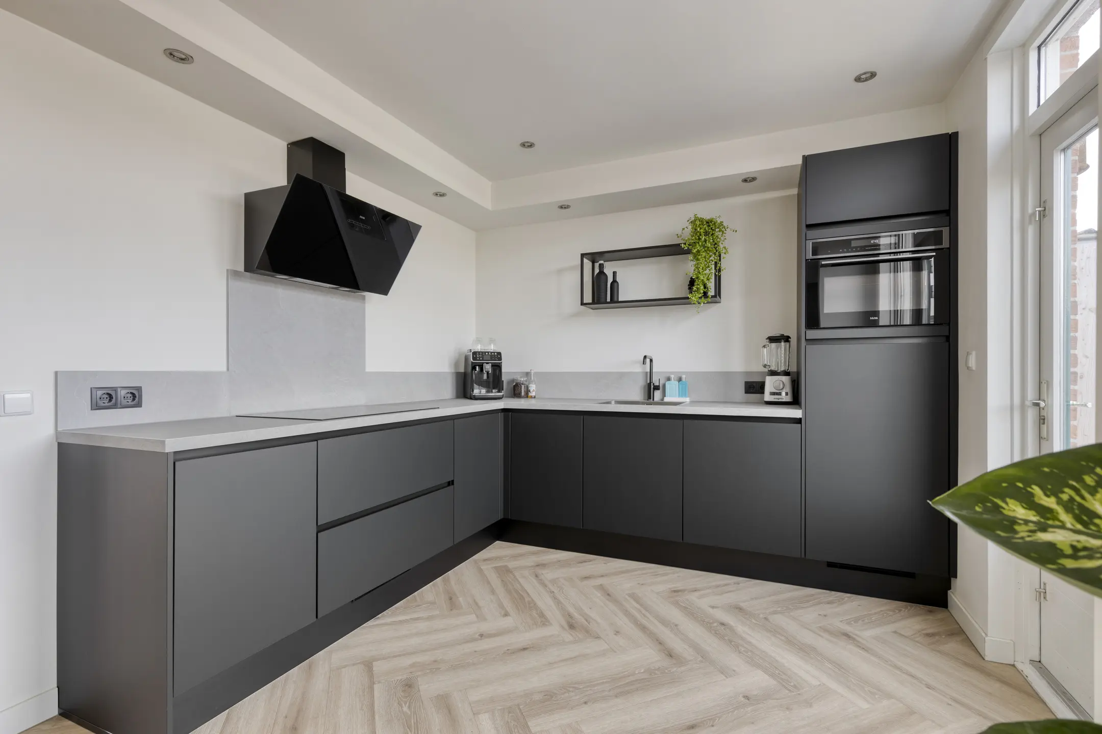 De hoek keuken is in 2021 vernieuwd en strak afgewerkt. Je beschikt hier over alle gemakken, zoals een 4-pits inductiekookplaat, afzuigkap, combi-oven, vaatwasser en koelkast. De inbouwspots geven het geheel een moderne finishing touch. Vanuit de keuken loop je zo de tuin in.