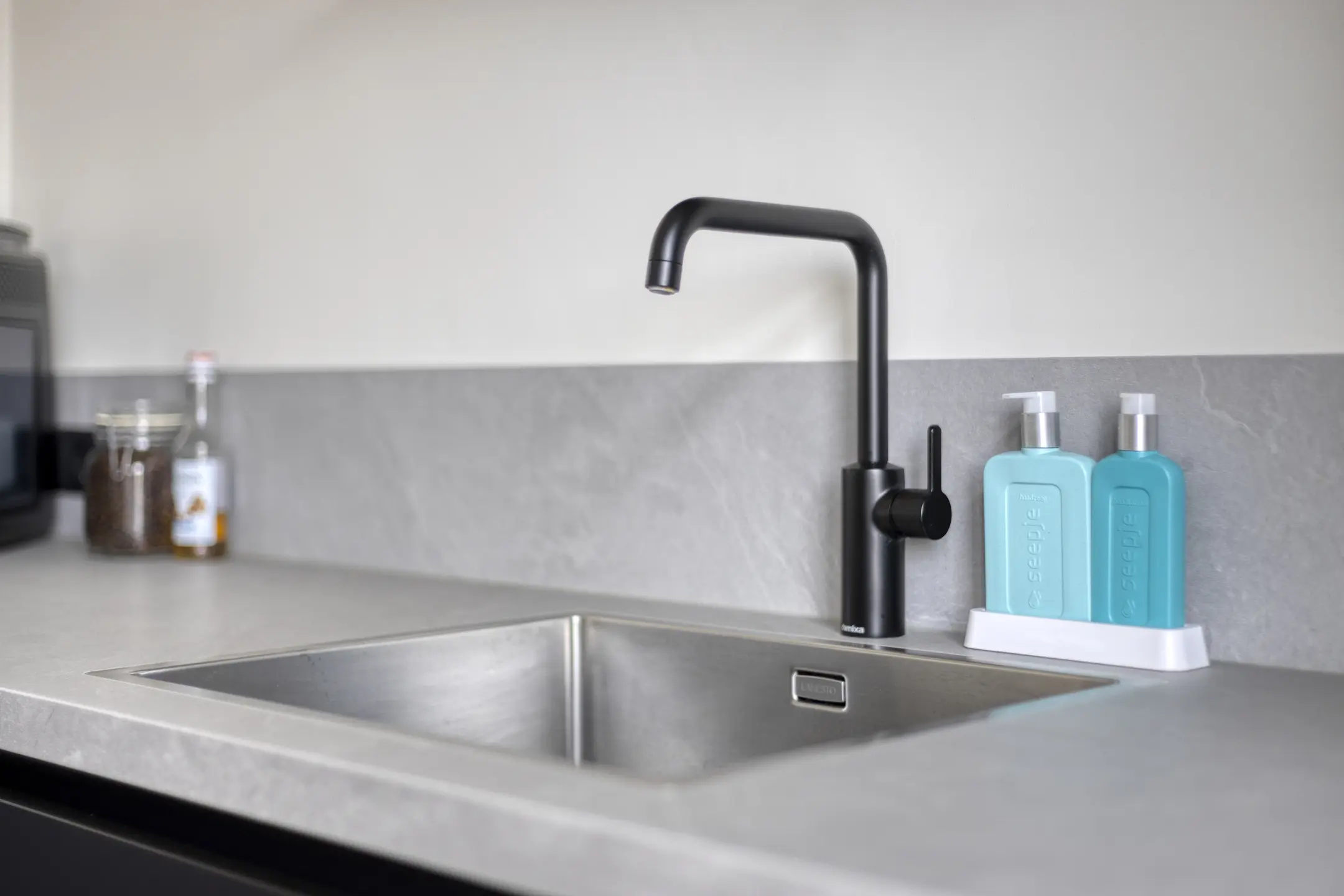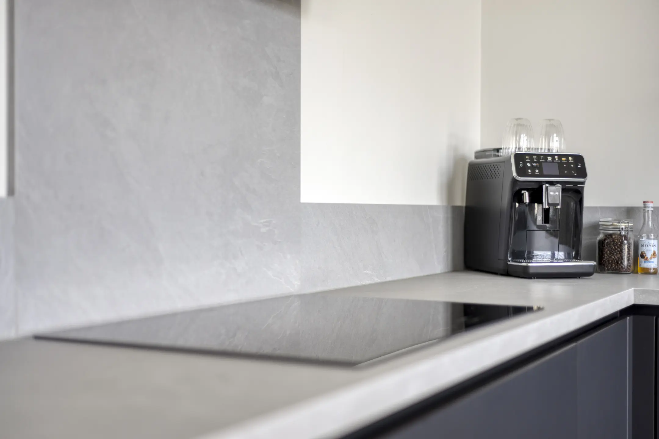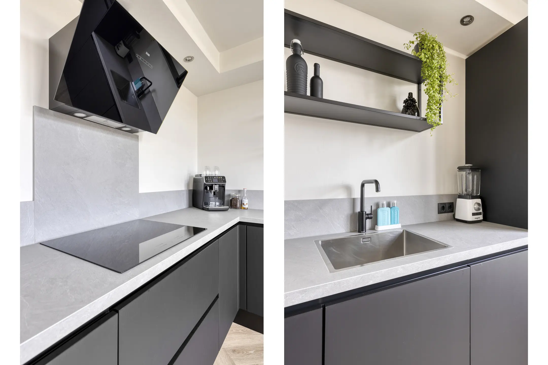 De hoek keuken is in 2021 vernieuwd en strak afgewerkt. Je beschikt hier over alle gemakken, zoals een 4-pits inductiekookplaat, afzuigkap, combi-oven, vaatwasser en koelkast. De inbouwspots geven het geheel een moderne finishing touch. Vanuit de keuken loop je zo de tuin in.