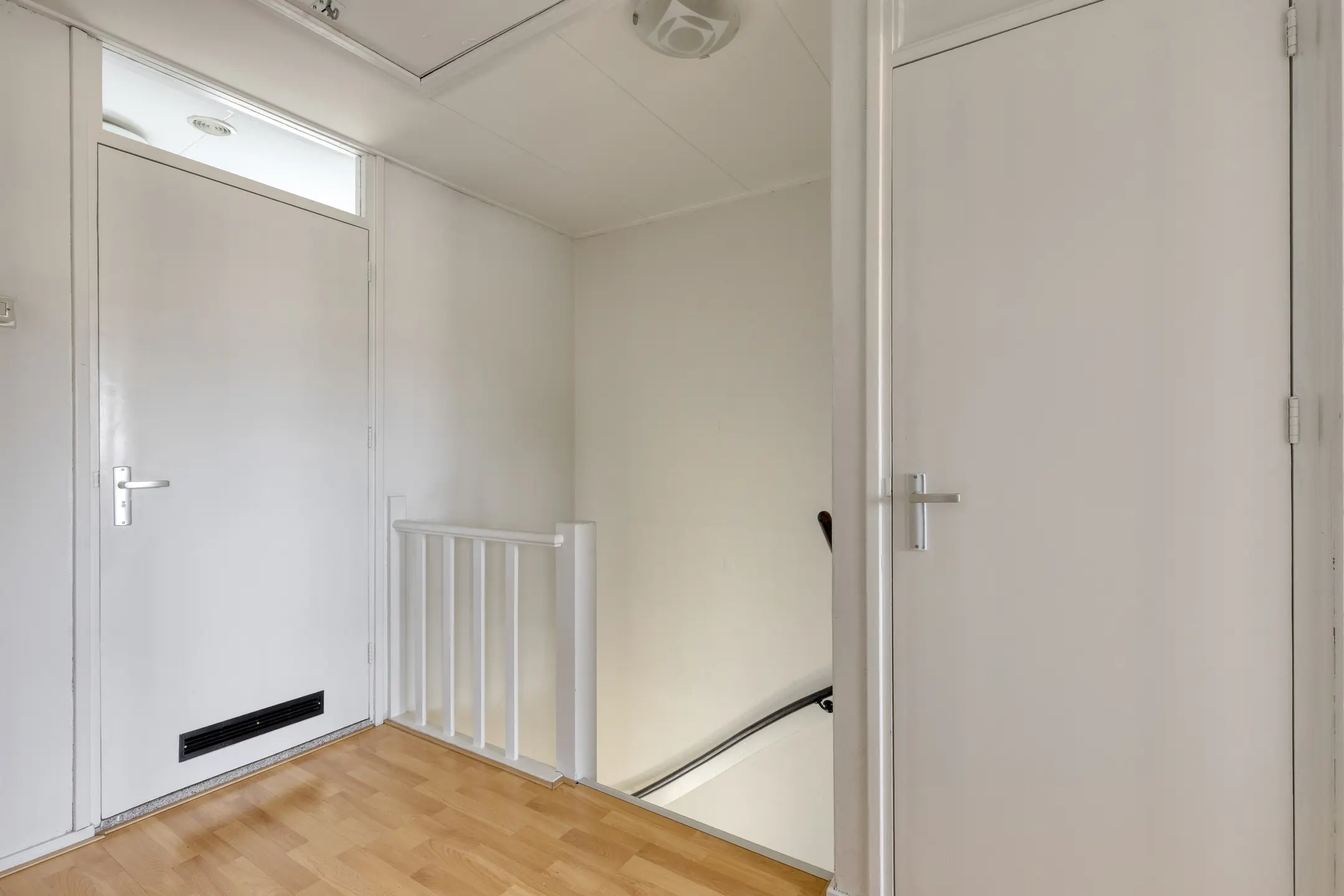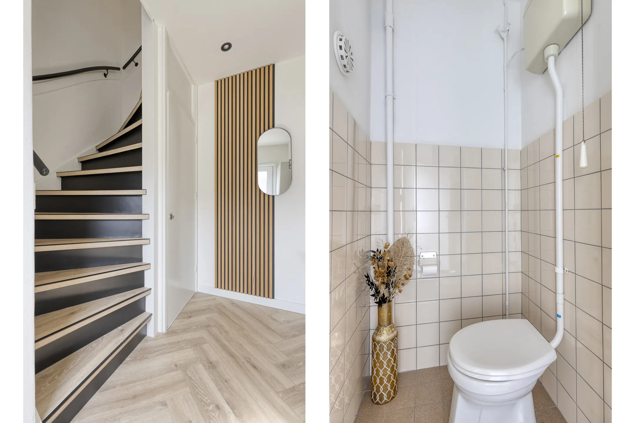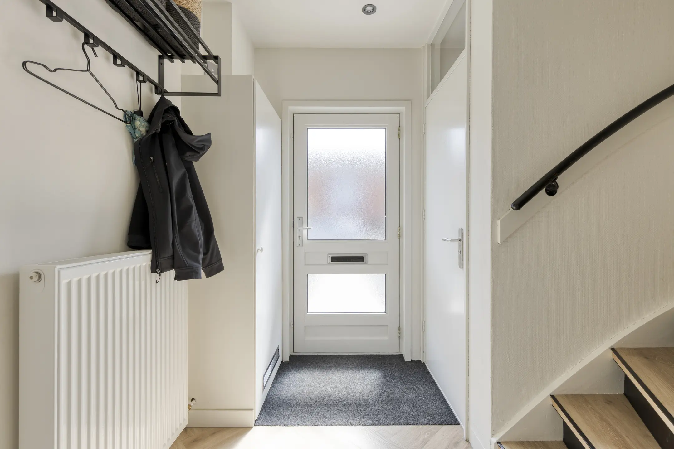 Via de nette voortuin kom je binnen in de hal, waar direct de verzorgde afwerking opvalt. De pvc visgraatvloer zorgt voor een warme en moderne uitstraling. In de hal vind je de vernieuwde meterkast, het toilet, een praktische trapkast en de trap naar boven, die recent een mooie make-over heeft gehad.