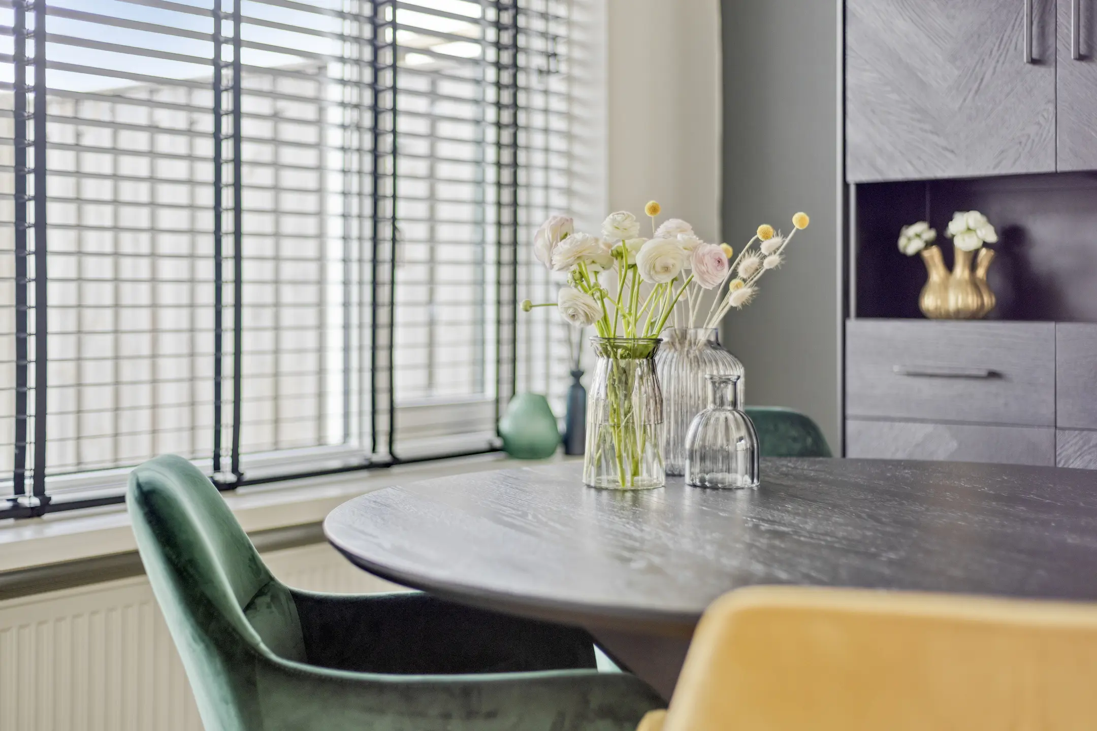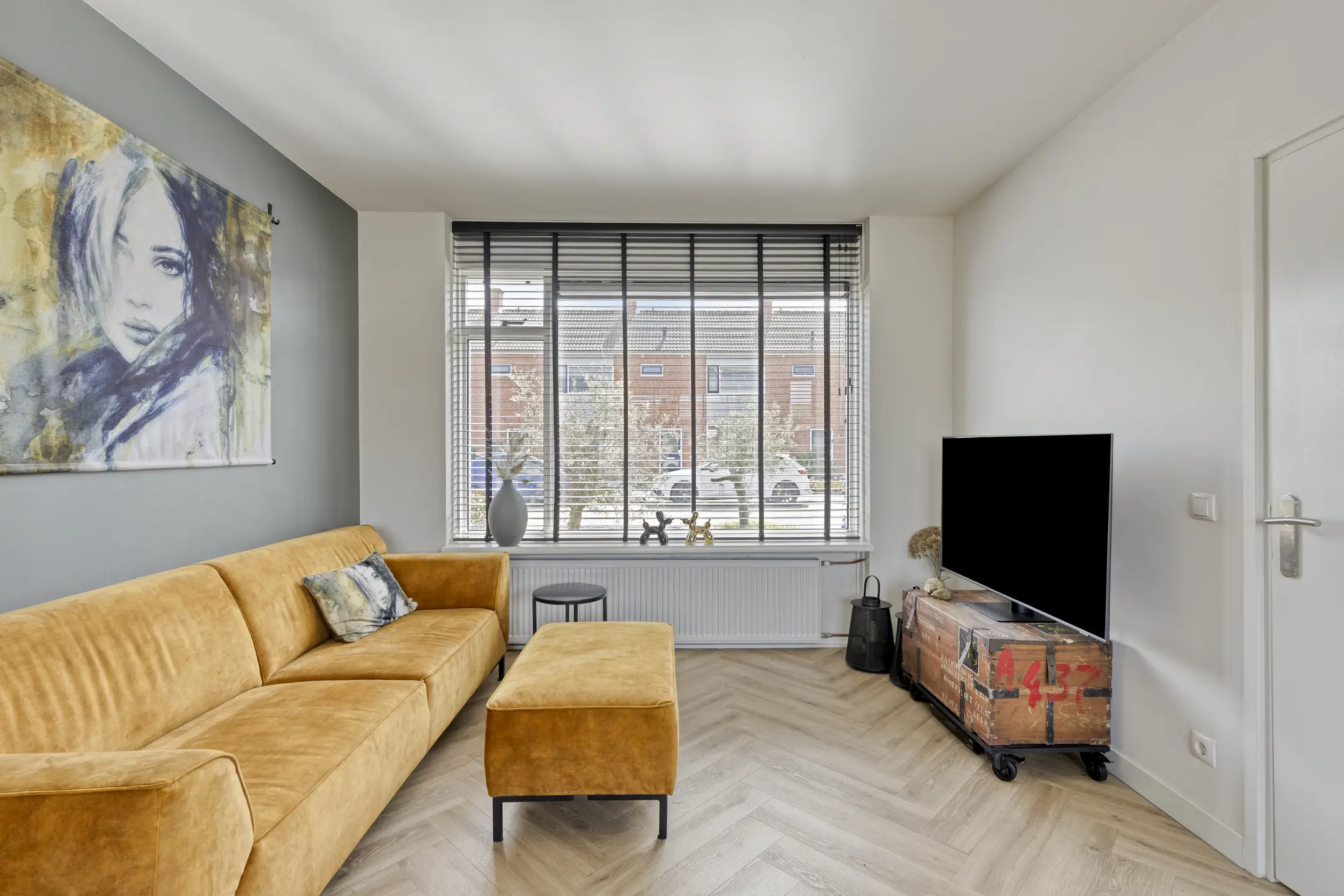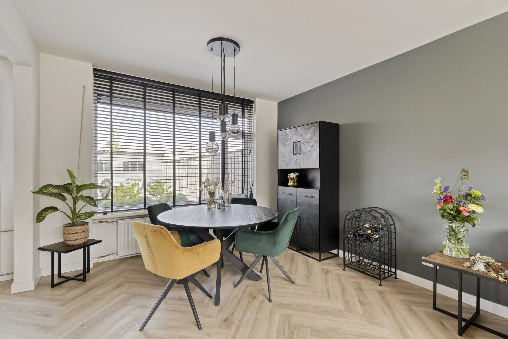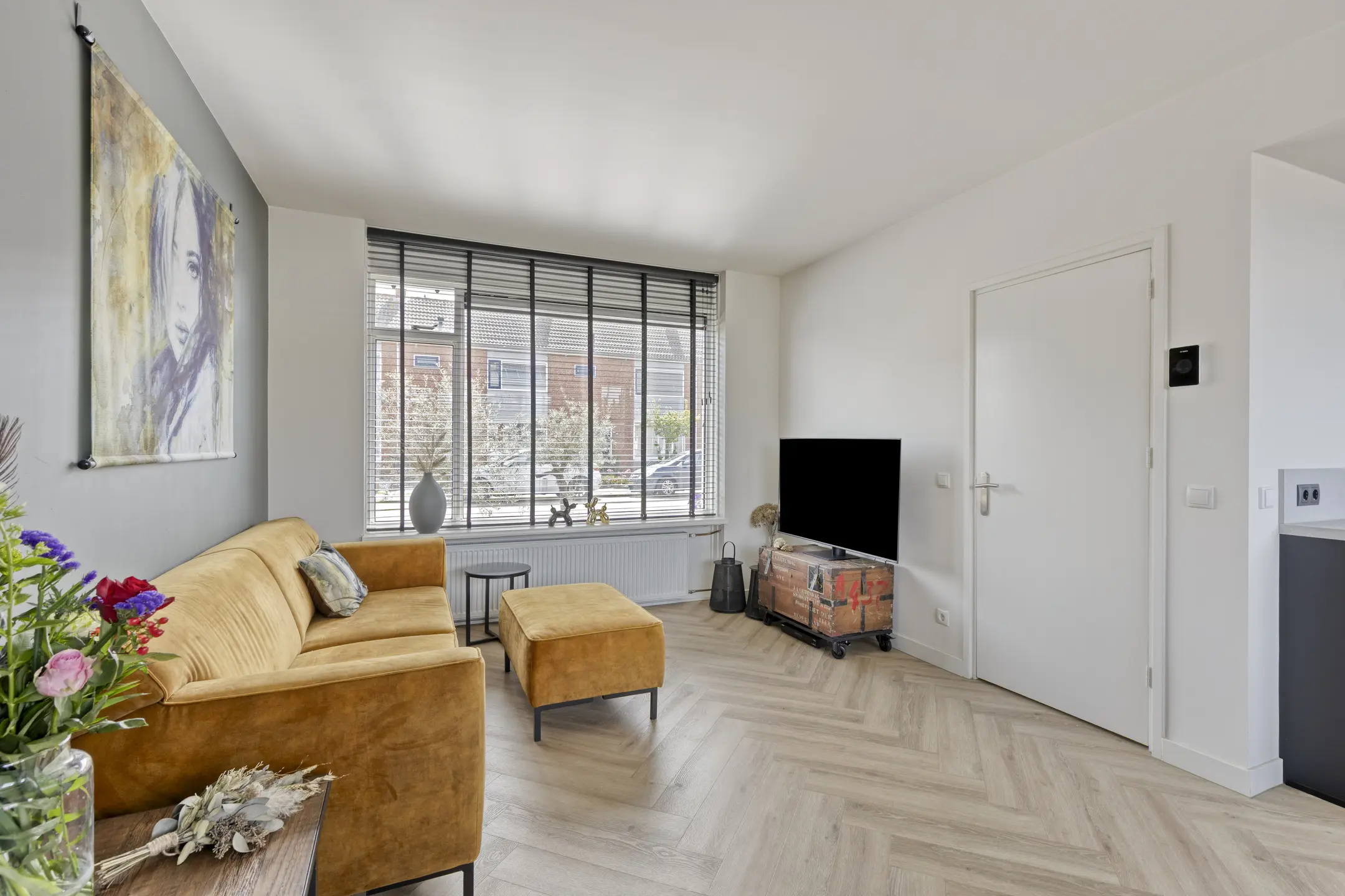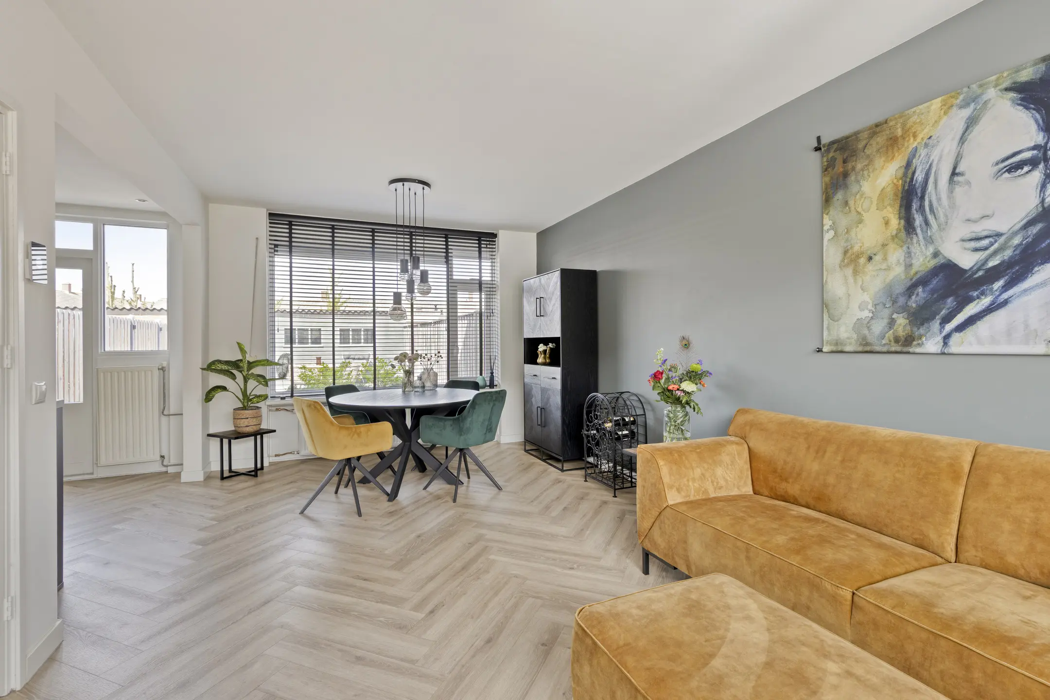 De woonkamer is heerlijk licht dankzij de grote ramen aan de voor- en achterzijde. Aan beide kanten zijn rolluiken aanwezig, waarbij het rolluik aan de voorzijde (solar) elektrisch bedienbaar is. Aan de voorkant is een gezellige zithoek gecreëerd, terwijl je aan de achterzijde, bij de open keuken, alle ruimte hebt voor een eettafel met zicht op de tuin.