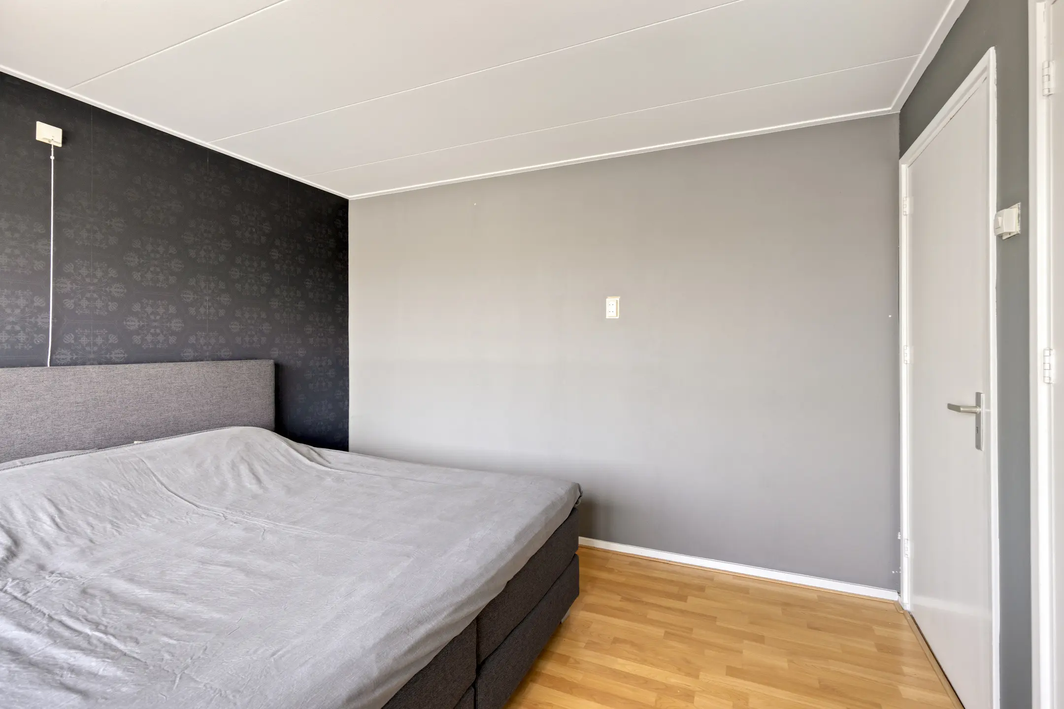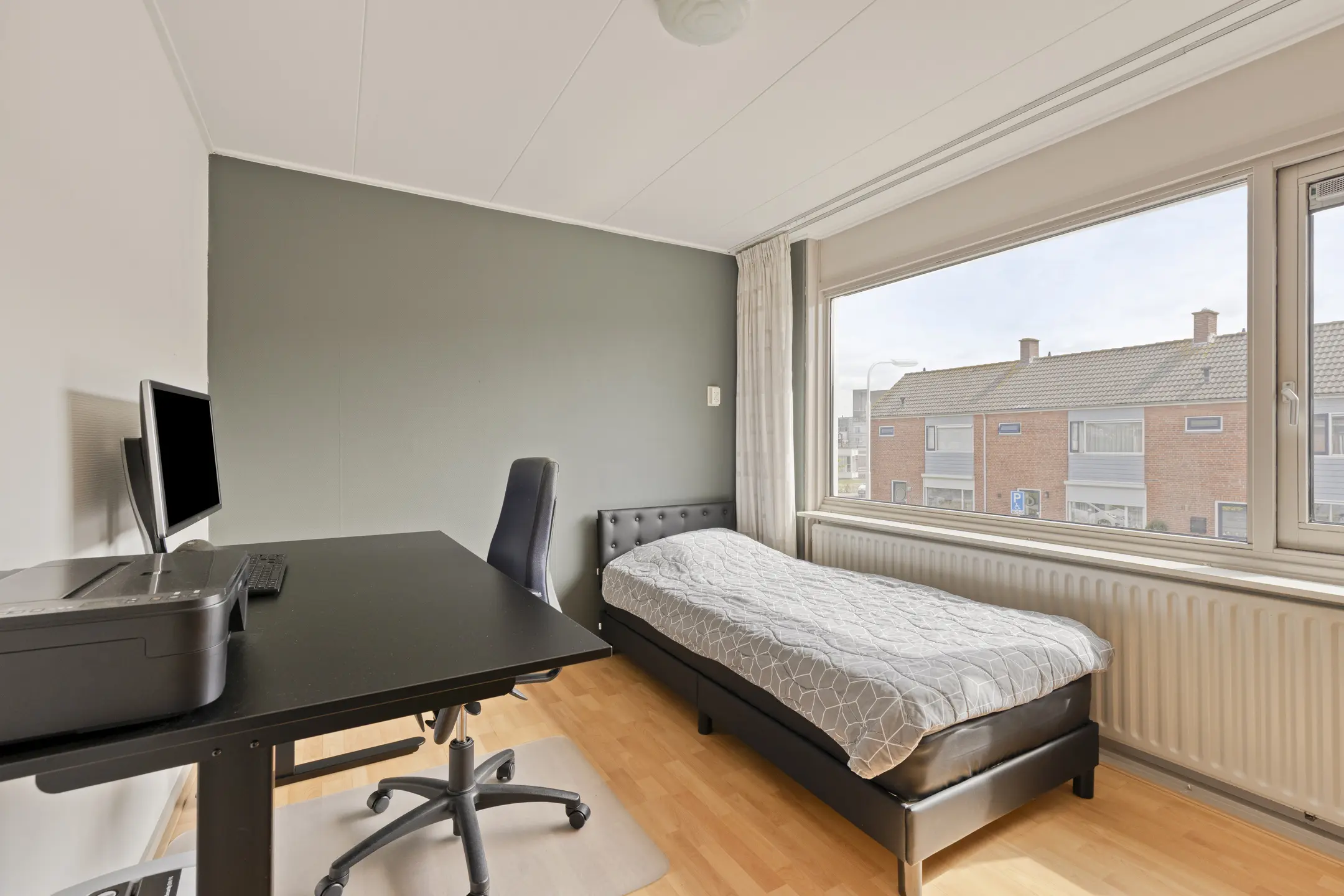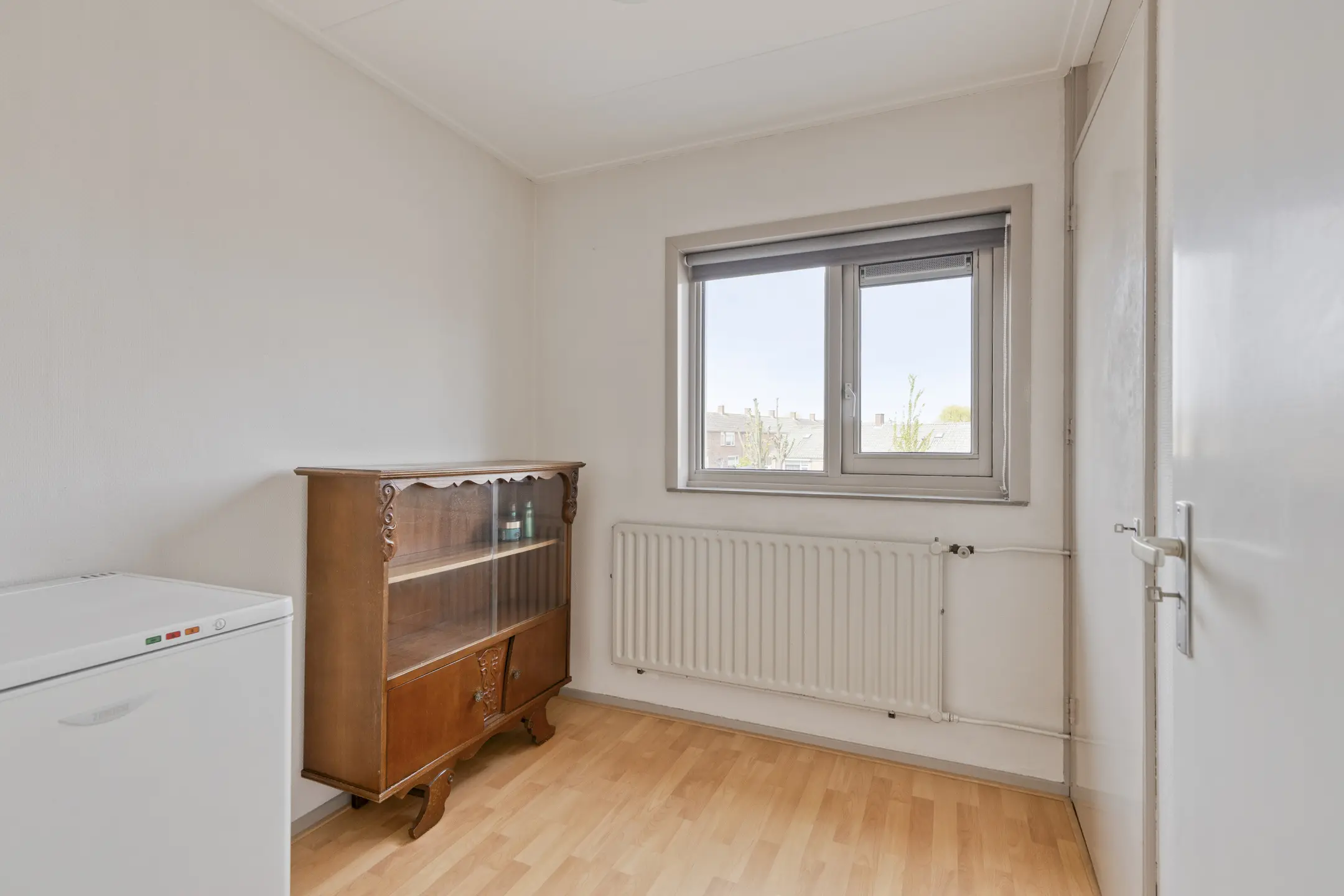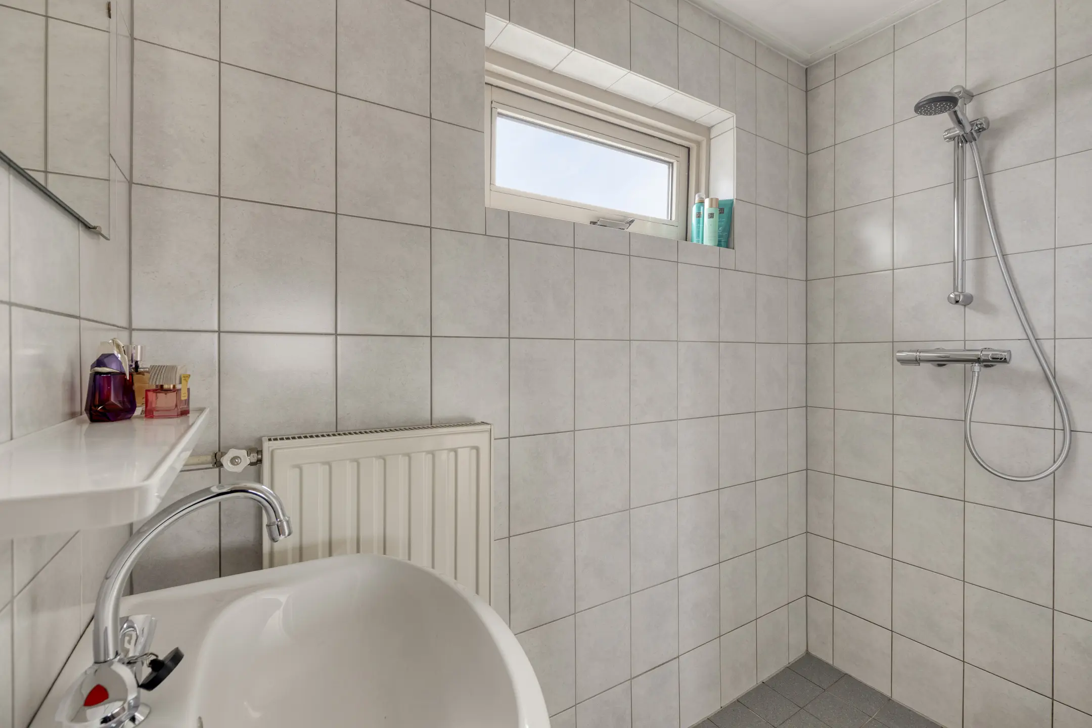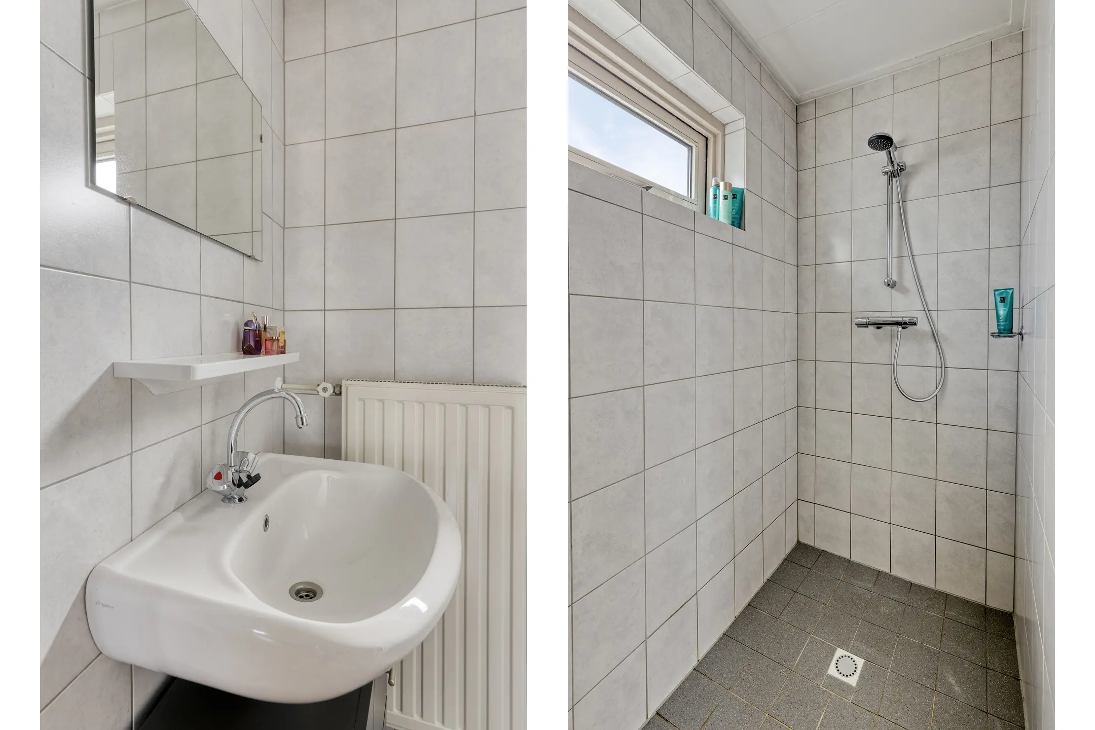 Op de eerste verdieping bevinden zich drie slaapkamers en de badkamer. Alle kamers zijn licht en praktisch ingedeeld, met handige vaste kasten en twee zijn voorzien van rolluiken. De derde slaapkamer is perfect als kinderkamer, thuiswerkplek of inloopkast, net wat je nodig hebt. De badkamer is eenvoudig maar praktisch, met een inloopdouche en wastafel. Het raam zorgt voor daglicht en natuurlijke ventilatie. Op de overloop is een vaste kast met aansluitingen voor de wasmachine en droger.