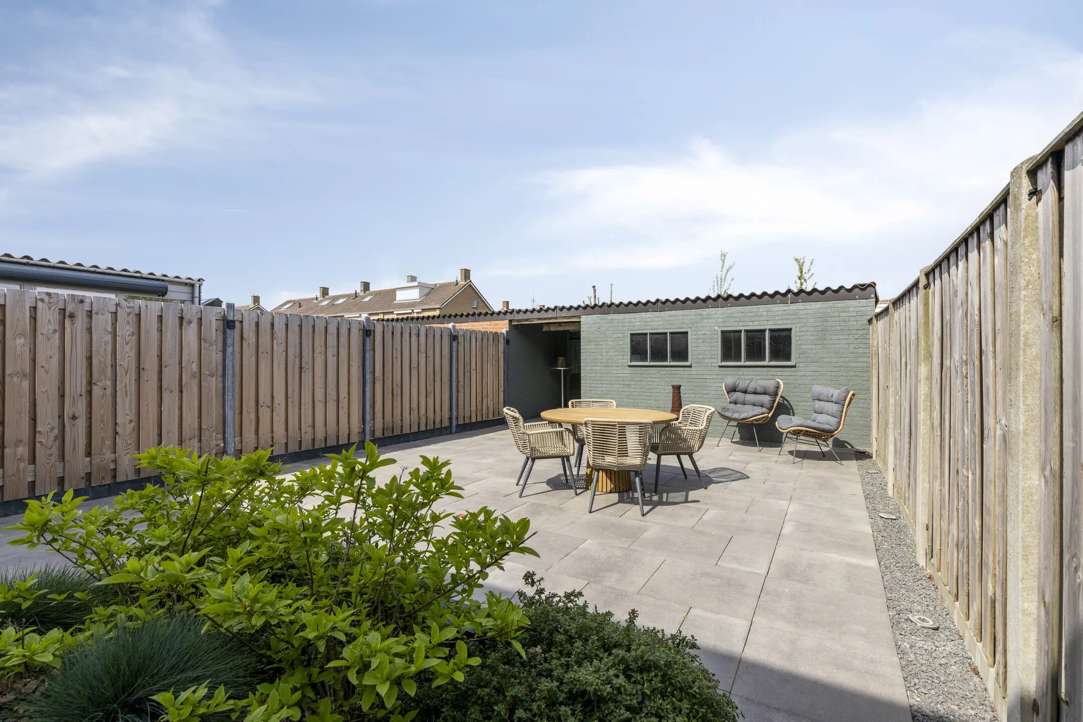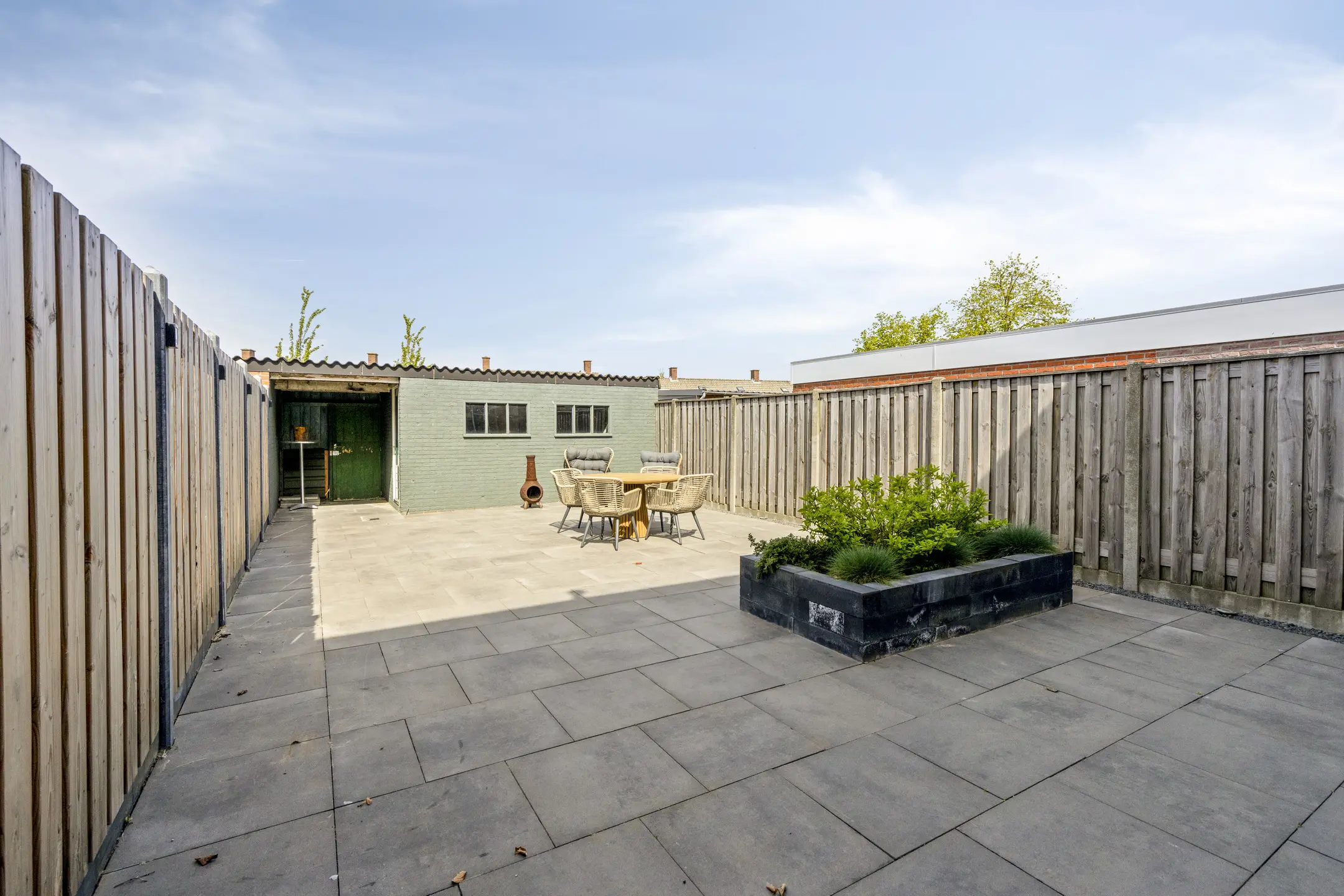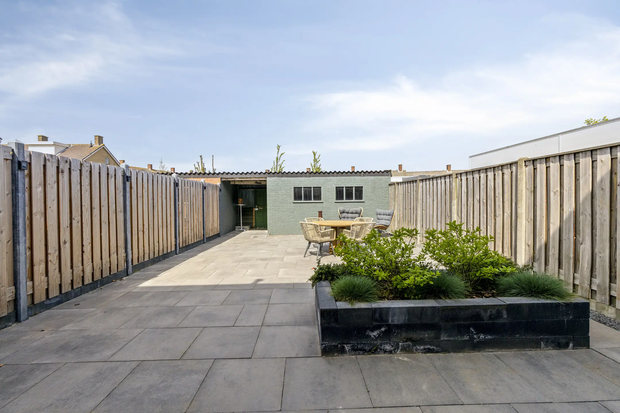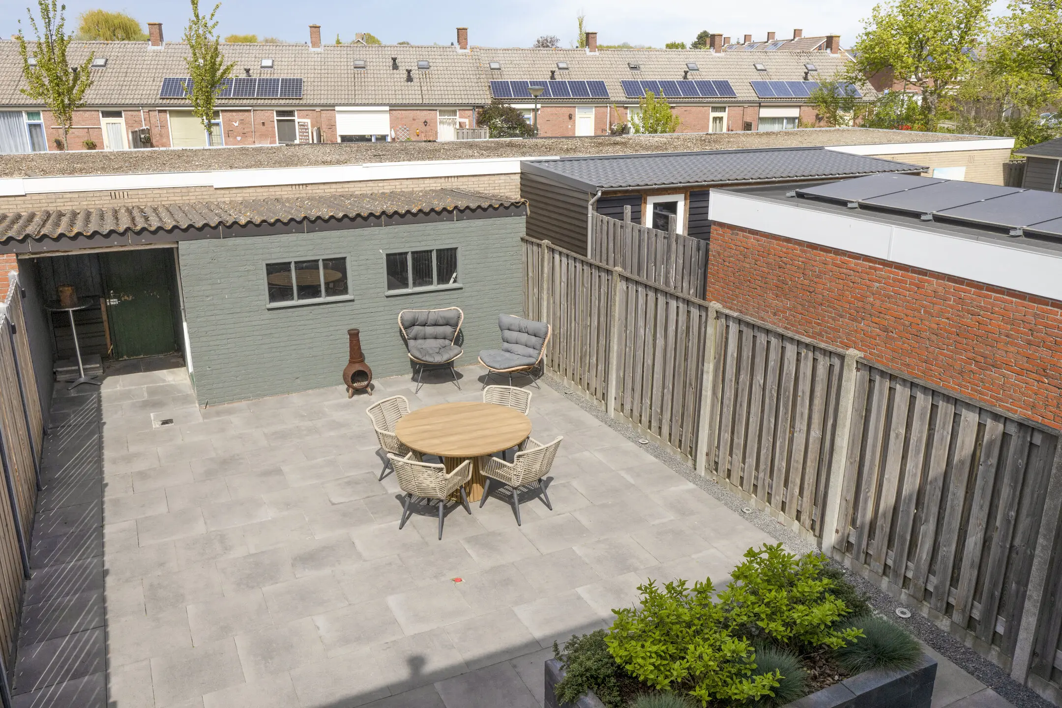 De achtertuin is onderhoudsvriendelijk aangelegd middels fraaie sierbestrating en biedt verrassend veel ruimte. Dankzij de ligging op het noordwesten kun je hier op verschillende momenten van de dag van de zon genieten. Extra prettig: geen directe inkijk van achterburen. Achterin de tuin staat een praktische stenen berging met elektra. Via de overkapping bereik je de vrije achterom aan de zijkant is ook een poort aanwezig.