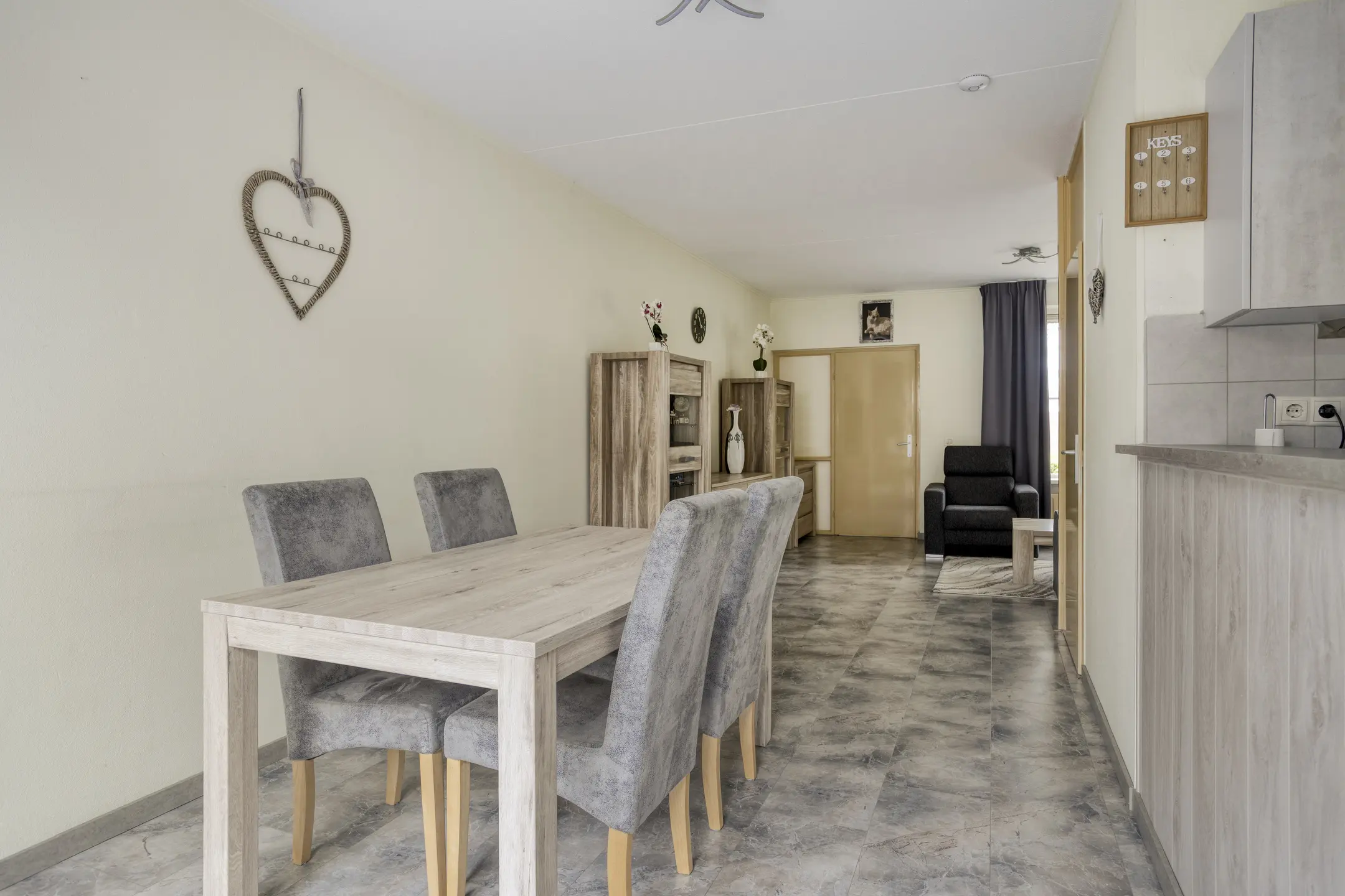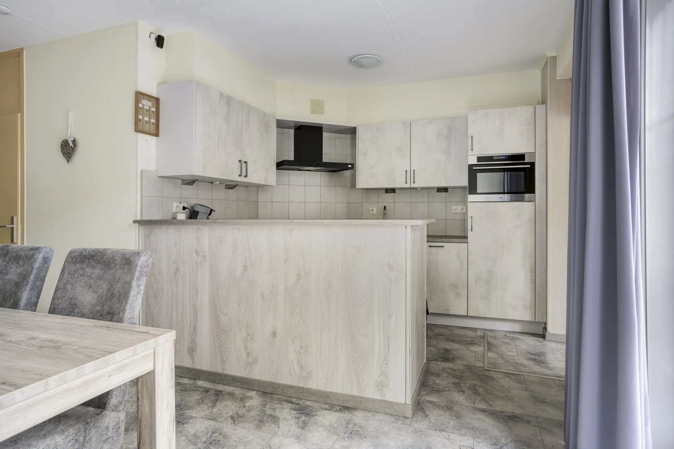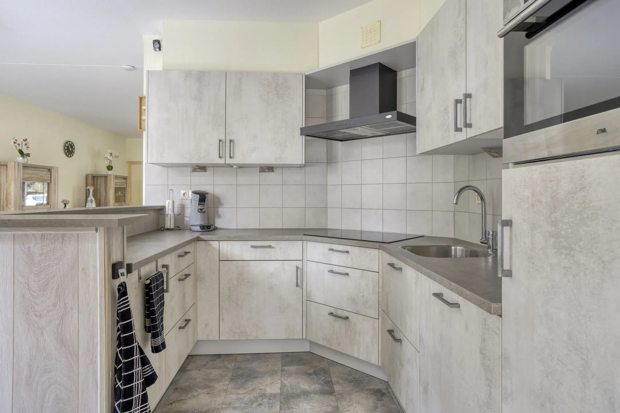 Aan de achterzijde bevindt zich de moderne keuken (2020), opgesteld in een hoek en van alle gemakken voorzien. Zo beschik je hier over een koelkast, vaatwasser, combi-oven en een 4-pits inductiekookplaat (2025) met afzuigkap. De openslaande tuindeuren zorgen voor veel lichtinval en een fijne verbinding met de tuin.