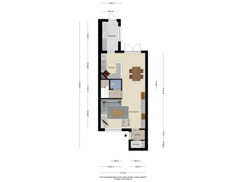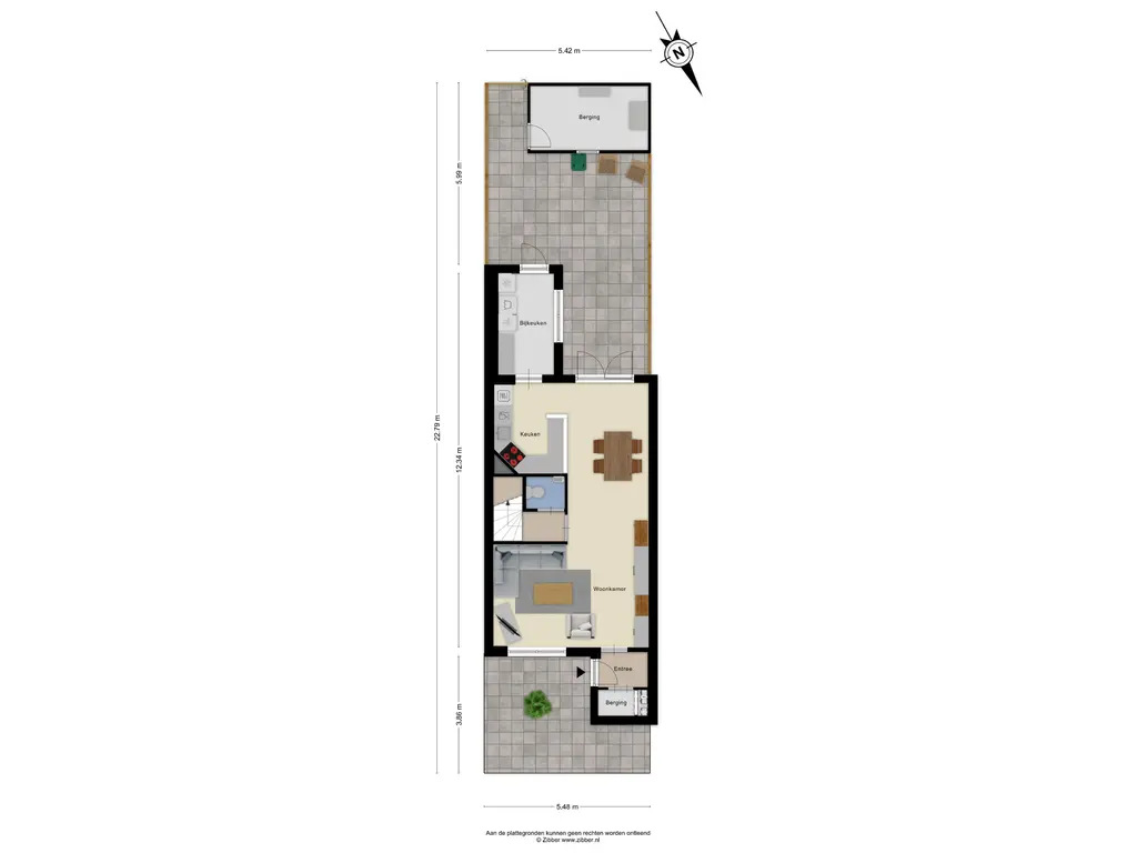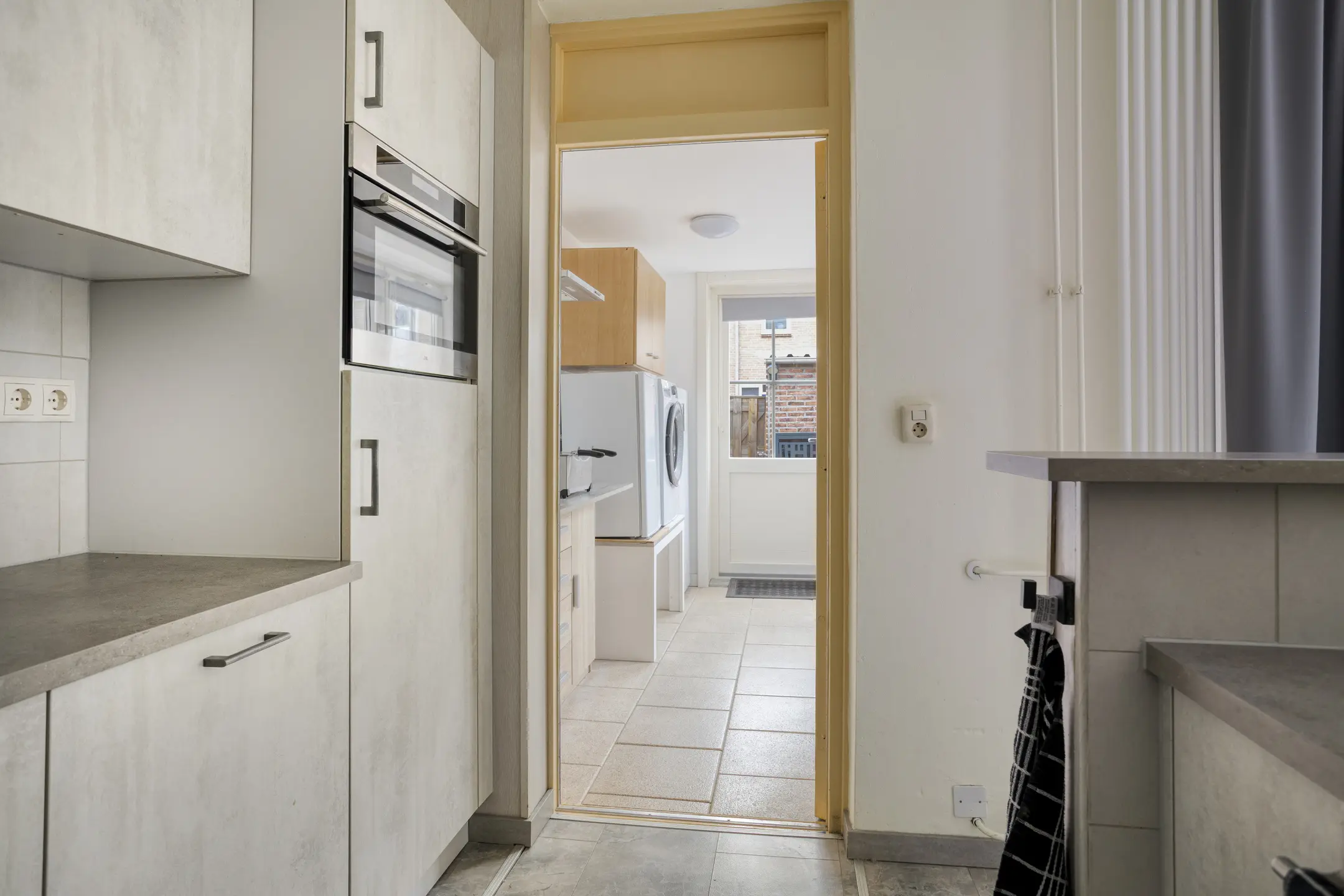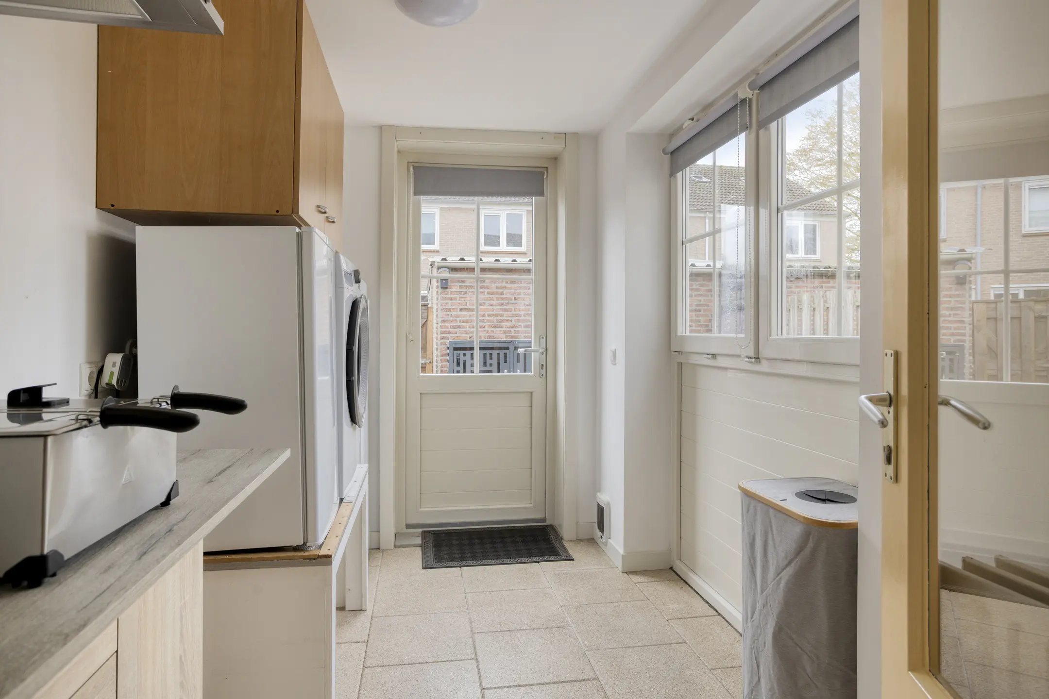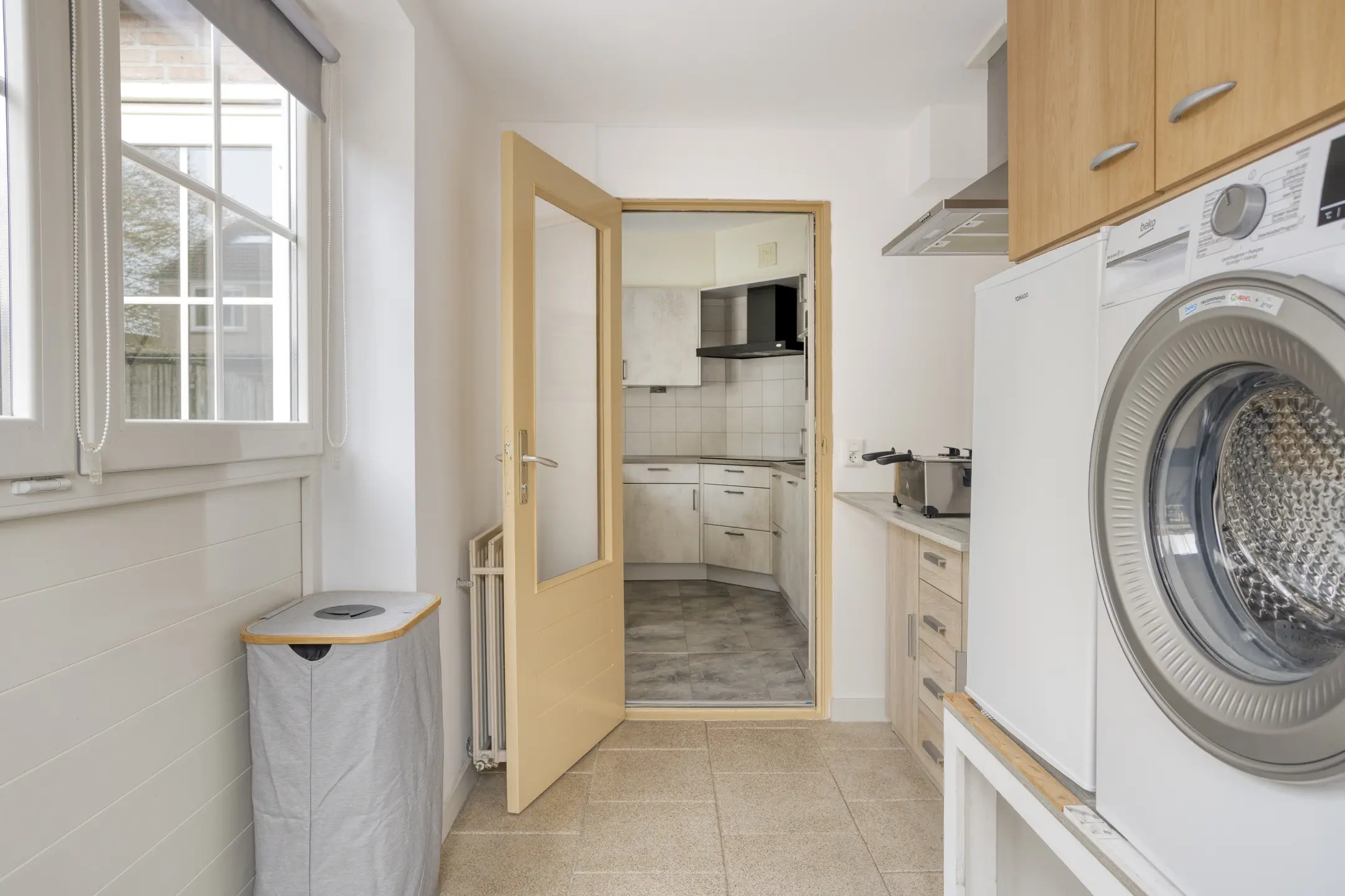 Aansluitend vind je de bijkeuken met extra bergruimte, wasmachineaansluiting en een tweede afzuigkap. Vanuit hier heb je ook toegang tot de tuin.